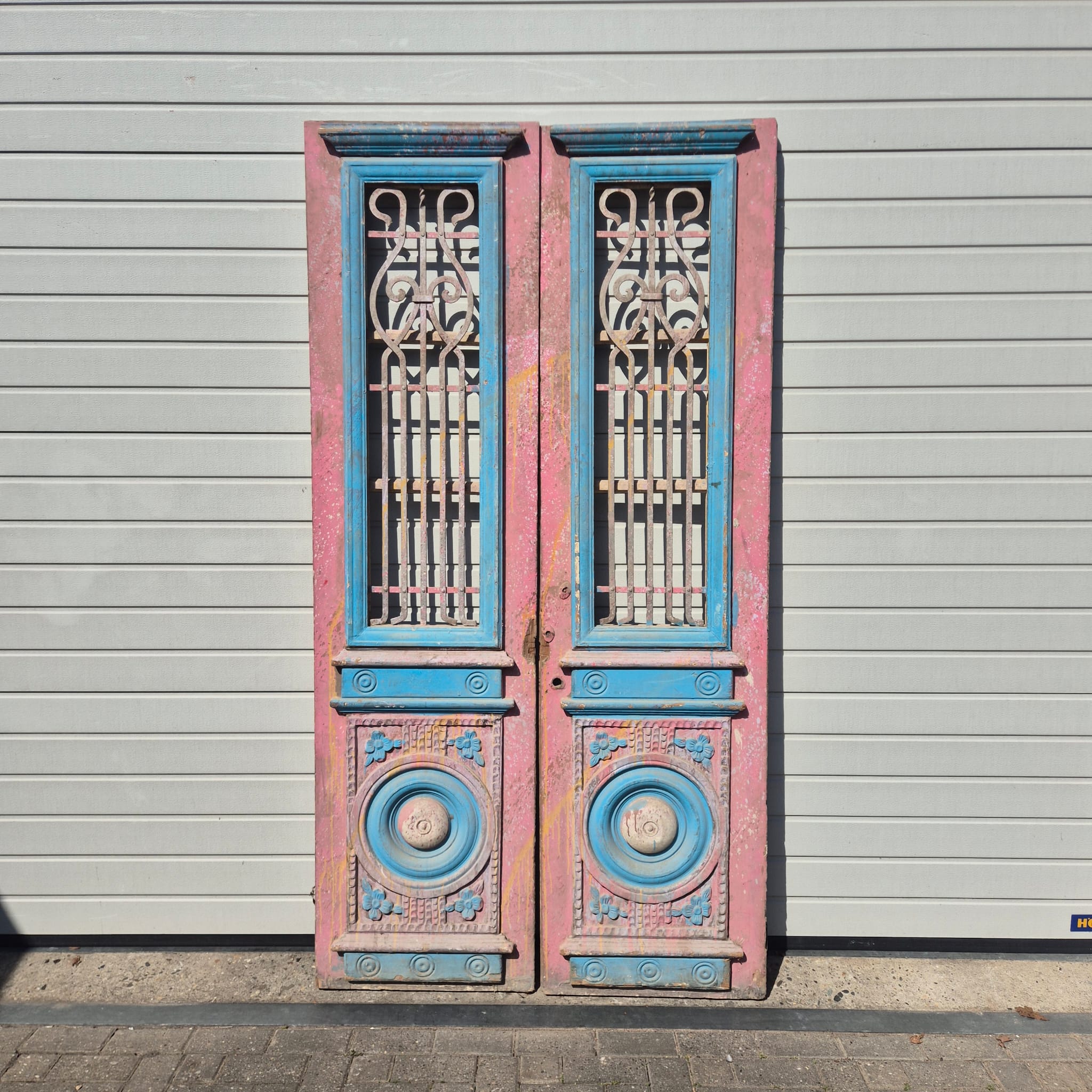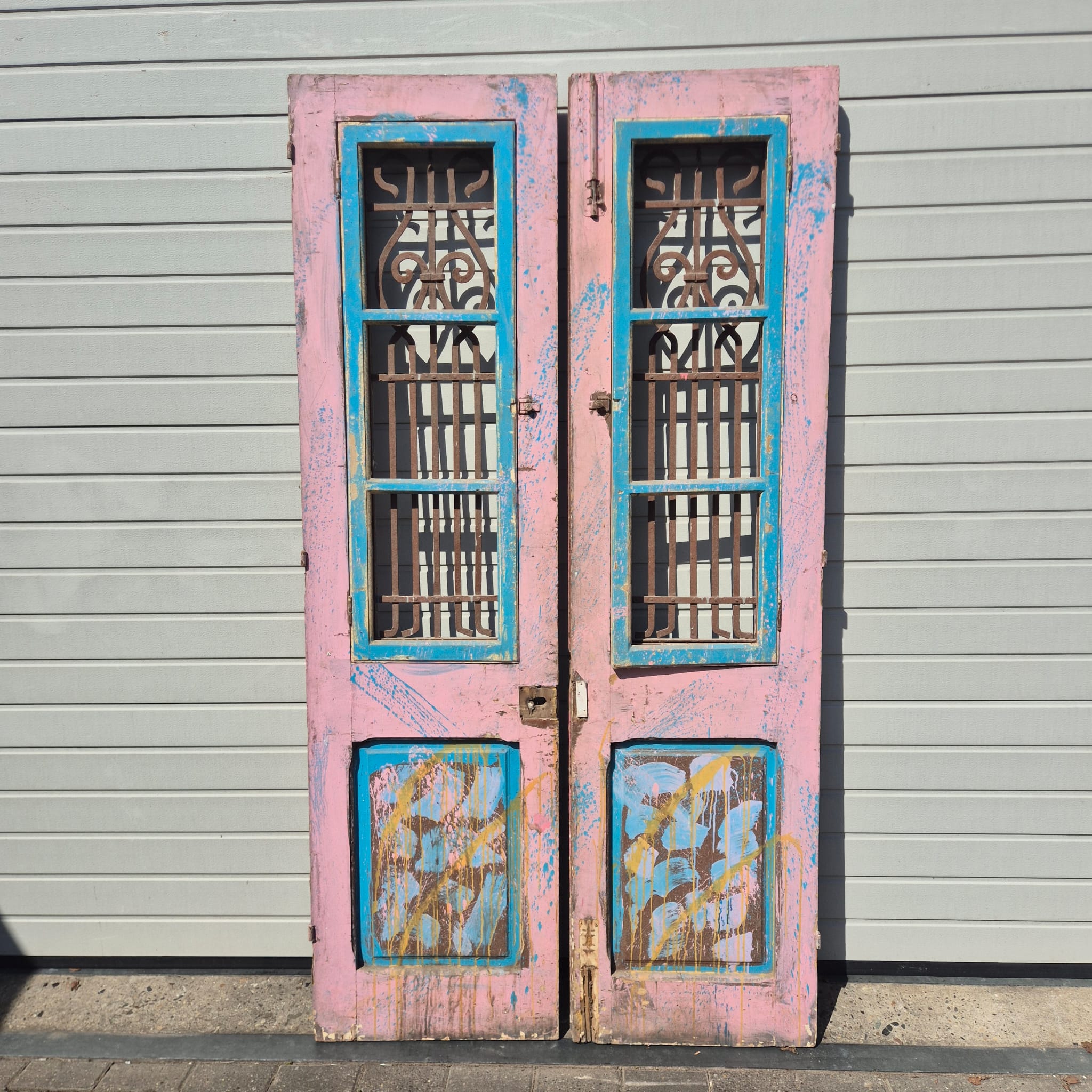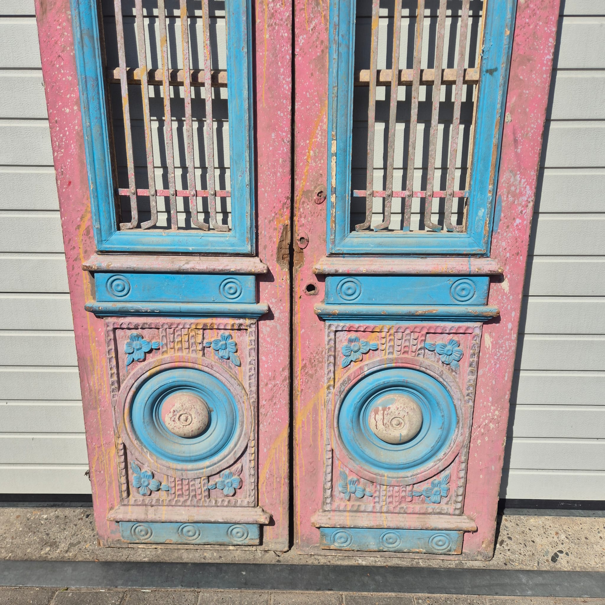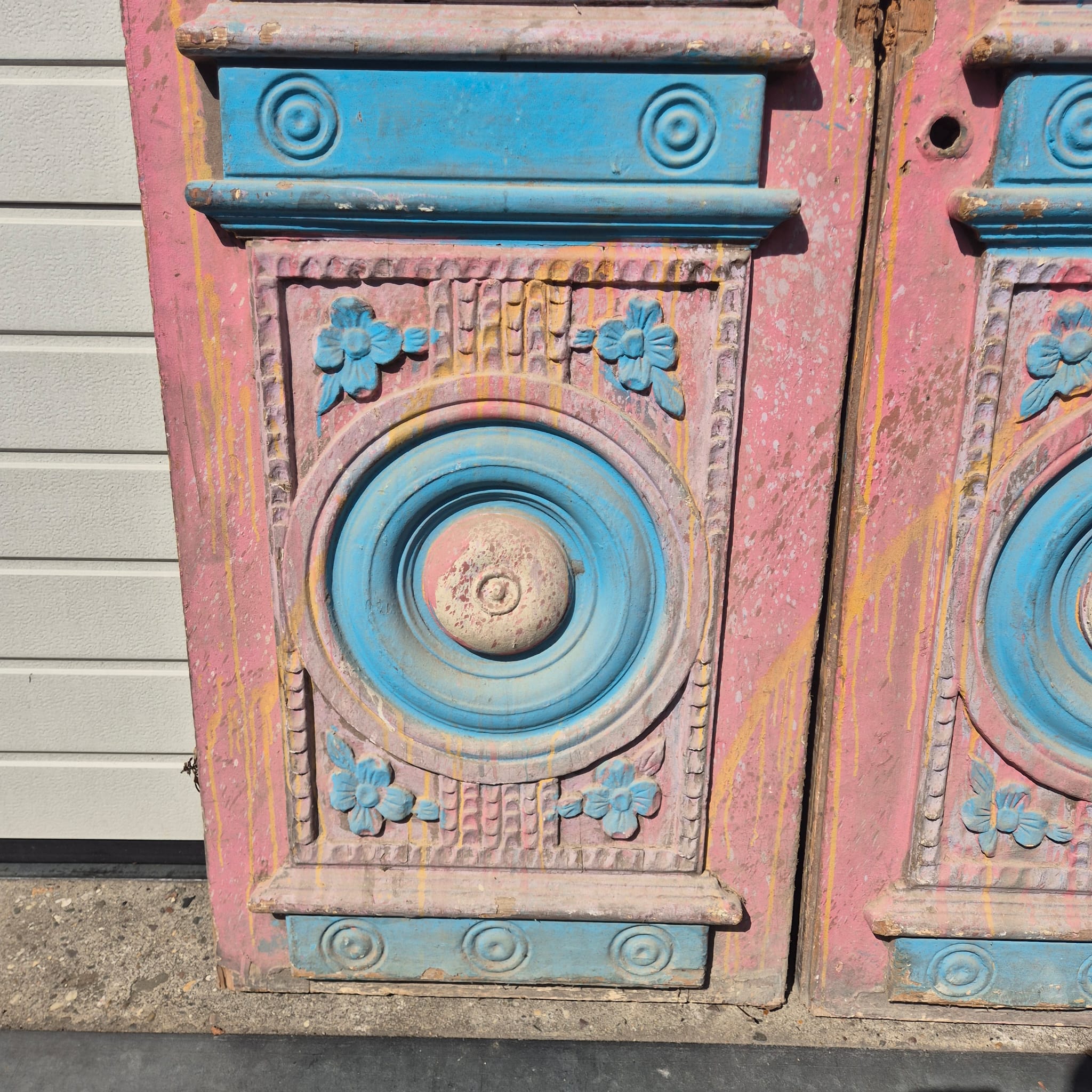 Historisches Design: Die Türflügel präsentieren sich im unrestaurierten Originalzustand mit einer faszinierenden, mehrschichtigen Farbfassung in Altrosa und Blau, die eine einzigartige Patina bildet.