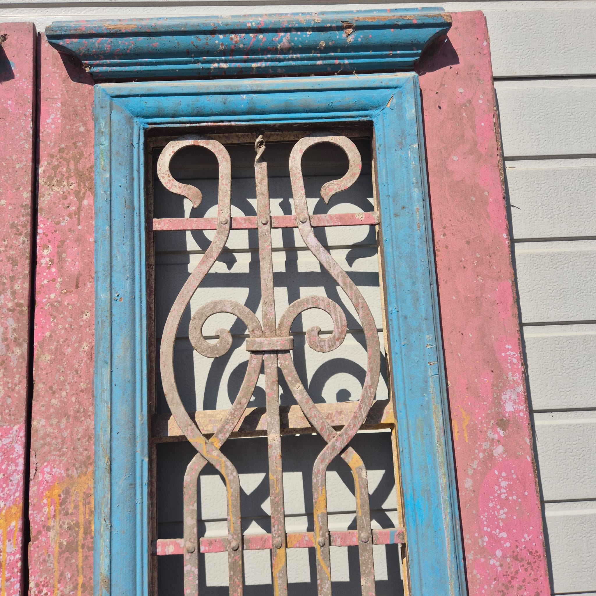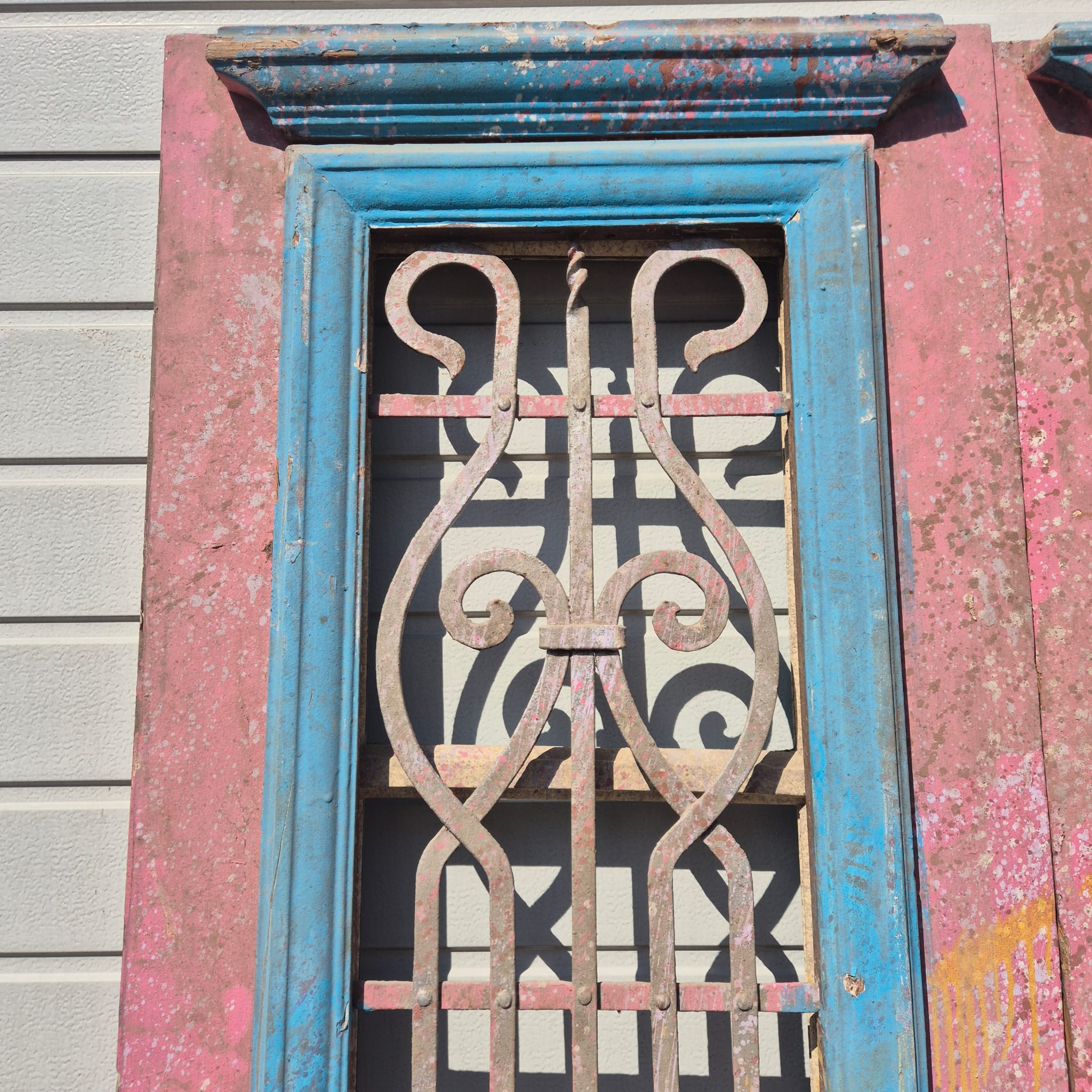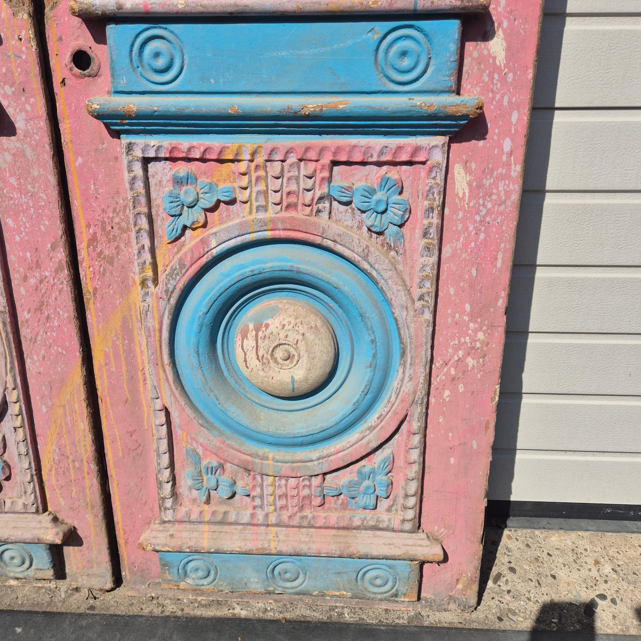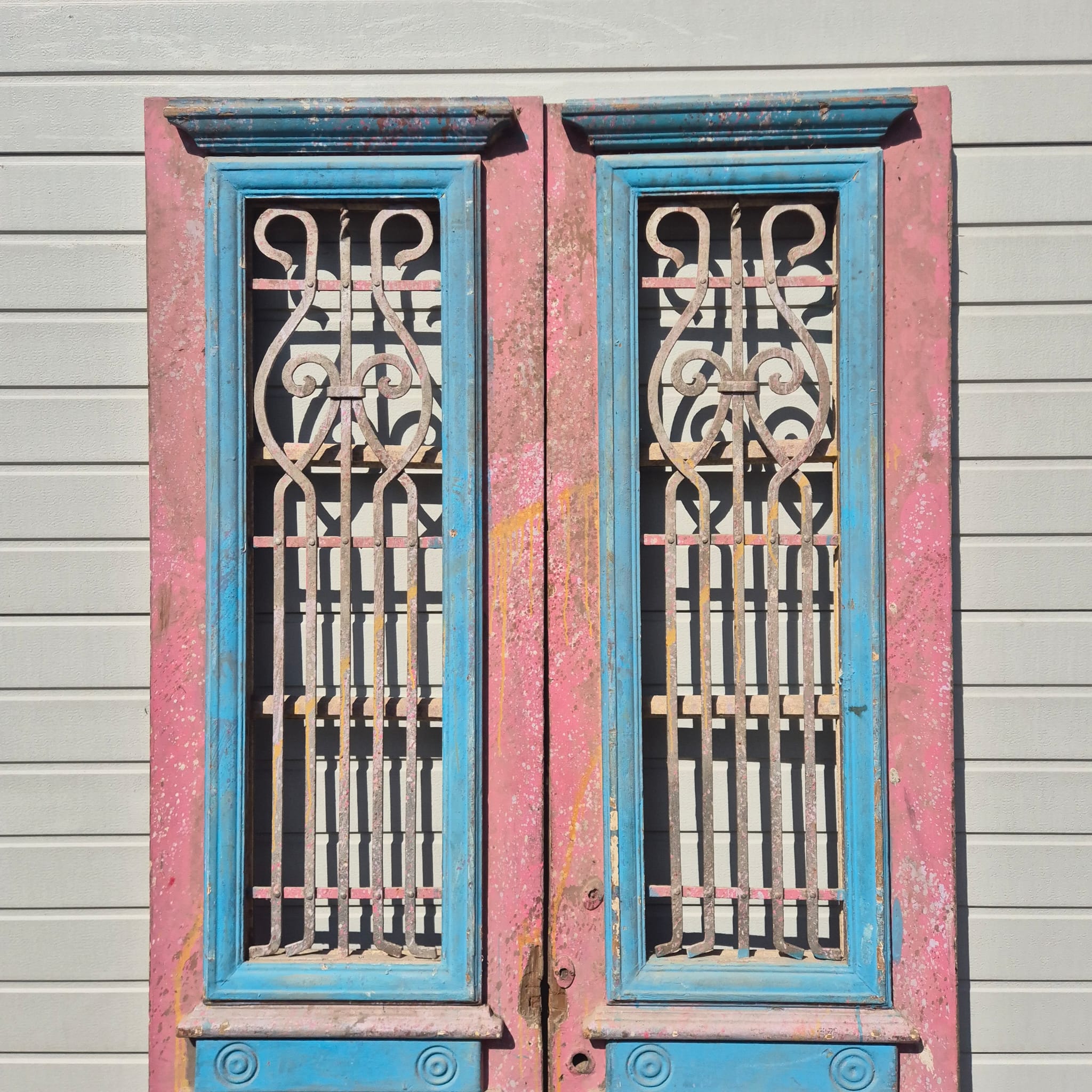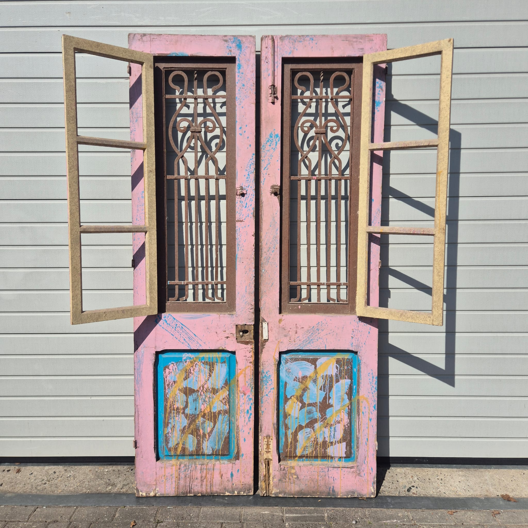Historisches Design: Die Türflügel präsentieren sich im unrestaurierten Originalzustand mit einer faszinierenden, mehrschichtigen Farbfassung in Altrosa und Blau, die eine einzigartige Patina bildet.