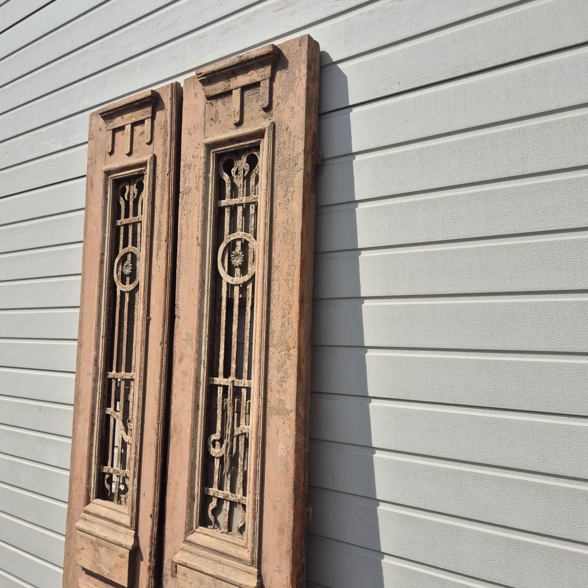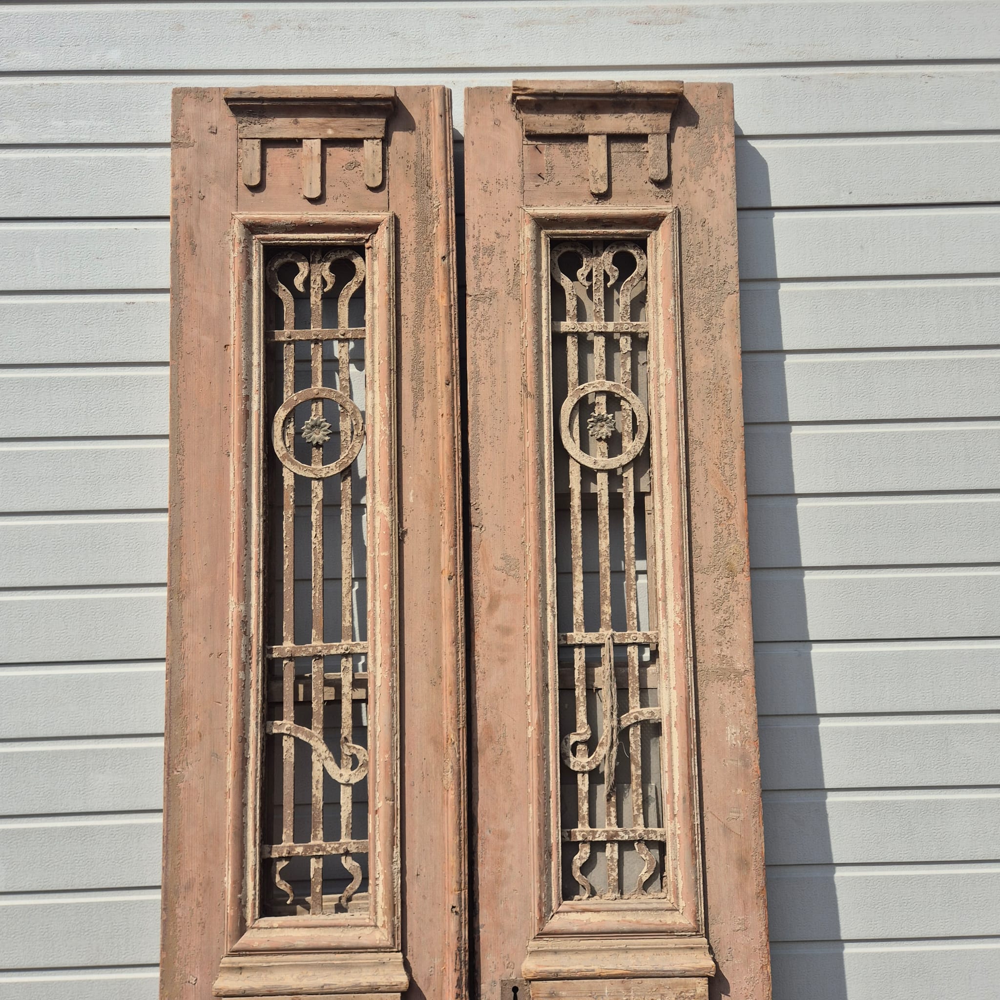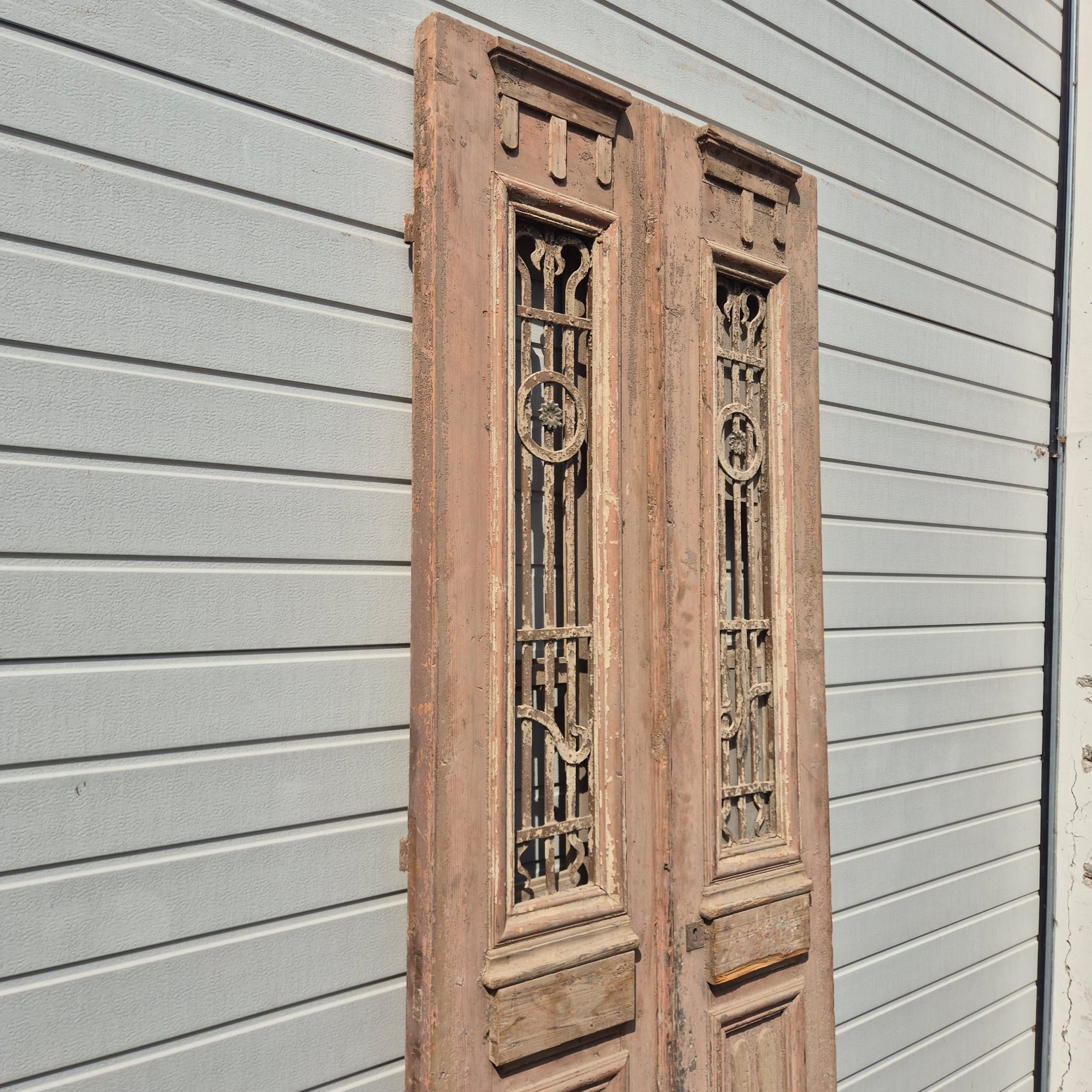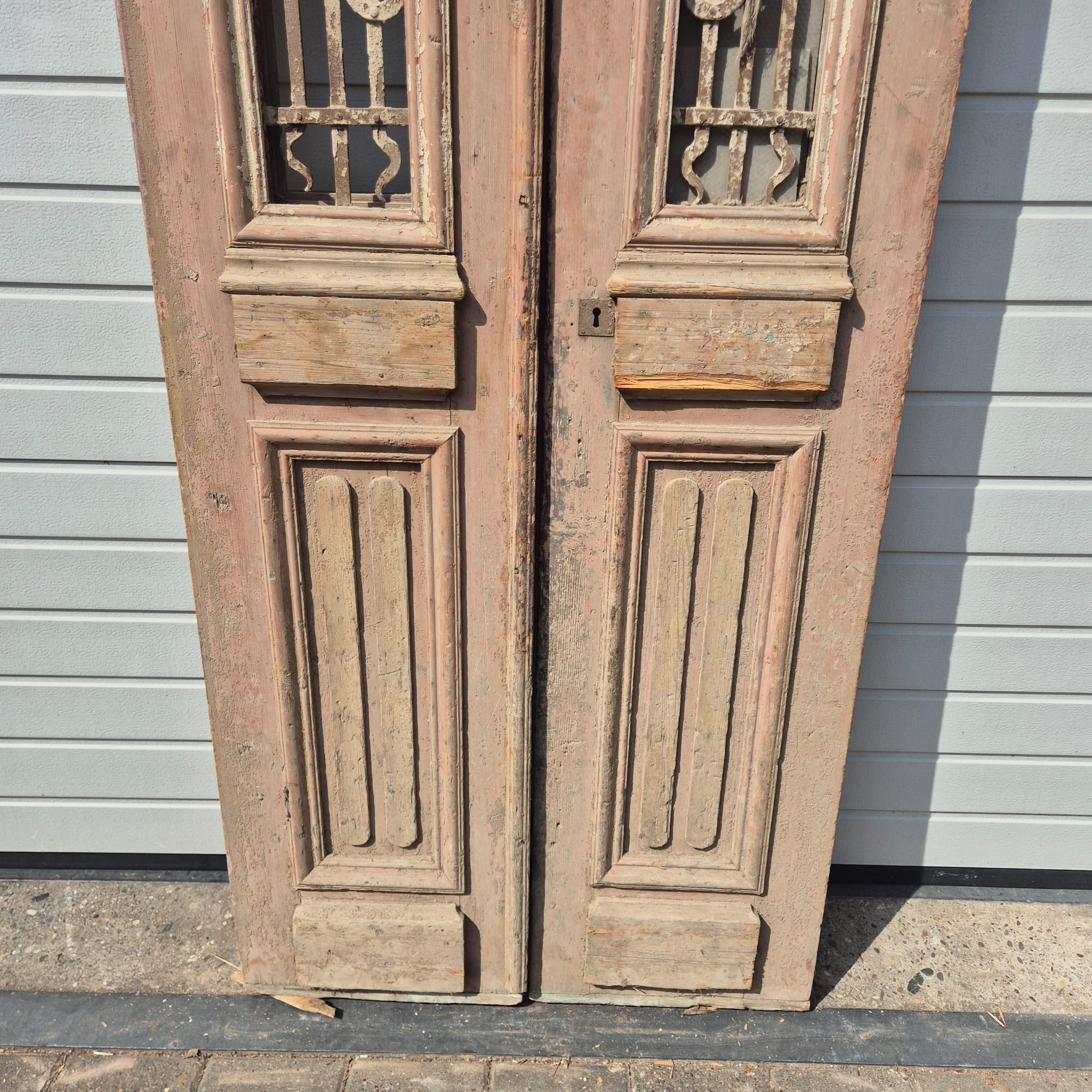 Historisches Design: Die Türflügel präsentieren sich im unrestaurierten Originalzustand mit einer faszinierenden, mehrschichtigen Farbfassung in Beige, die eine einzigartige Patina bildet.