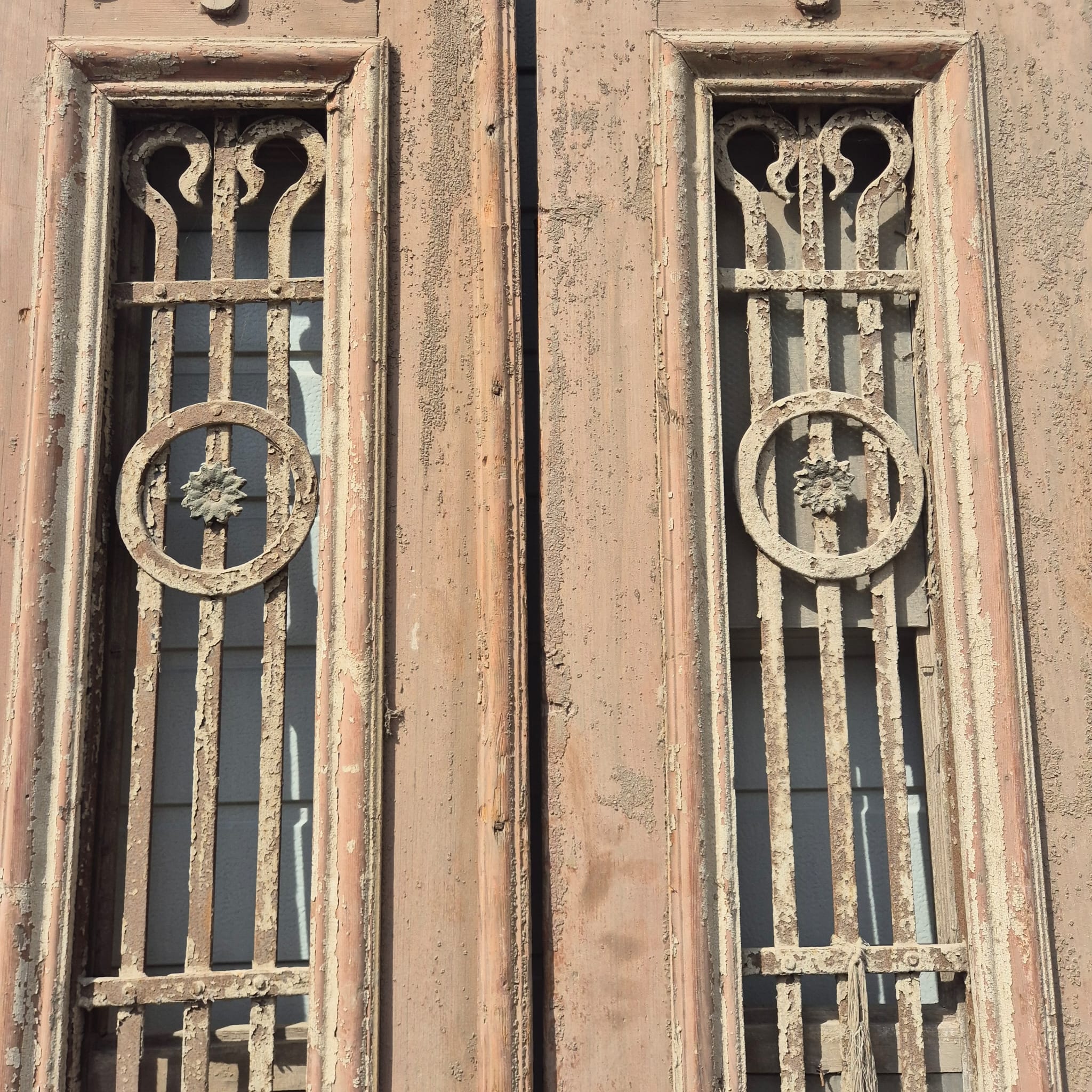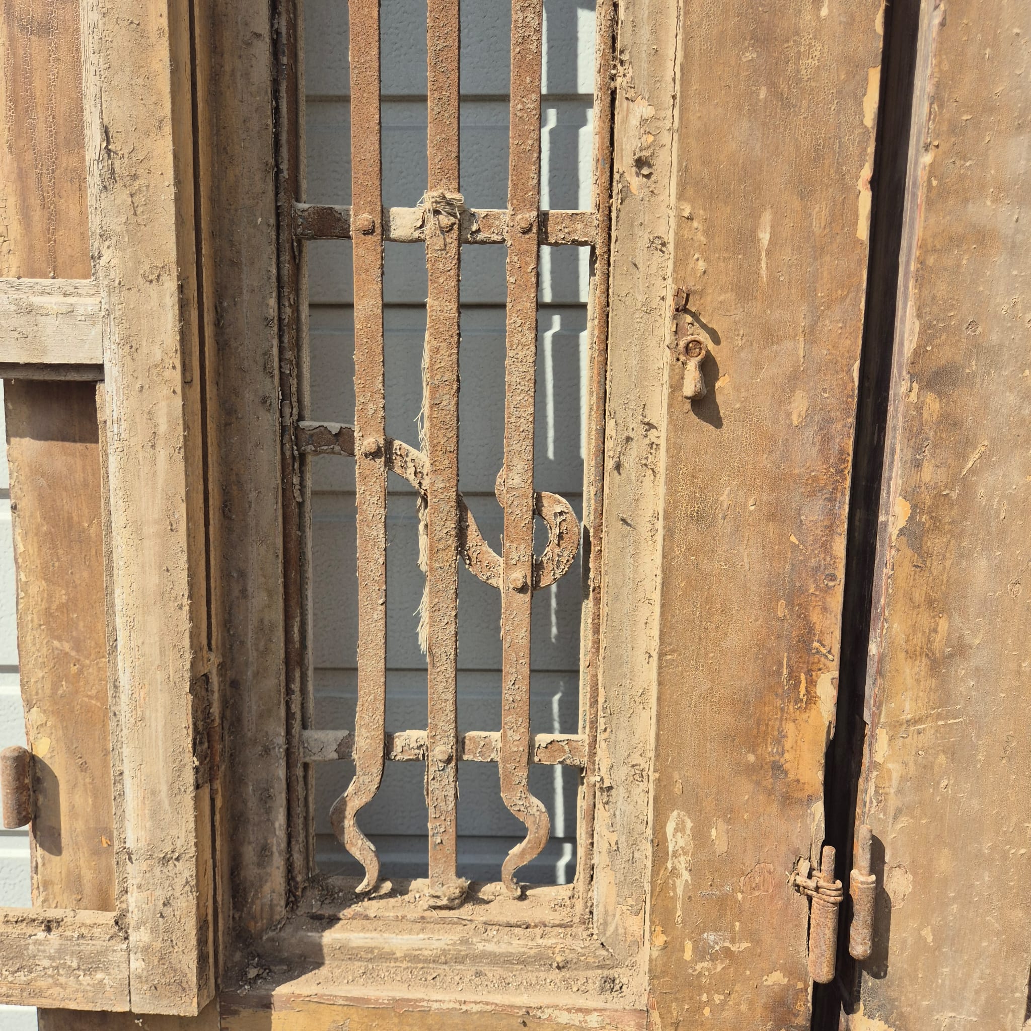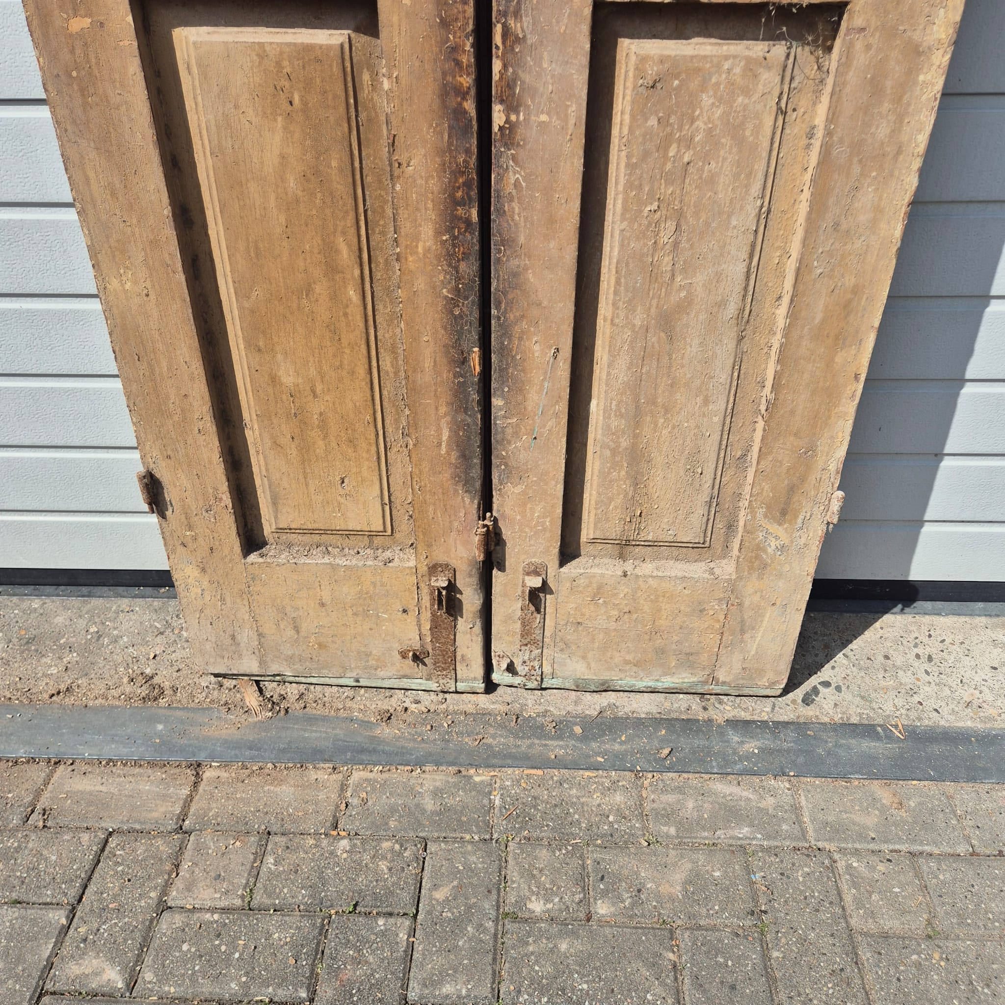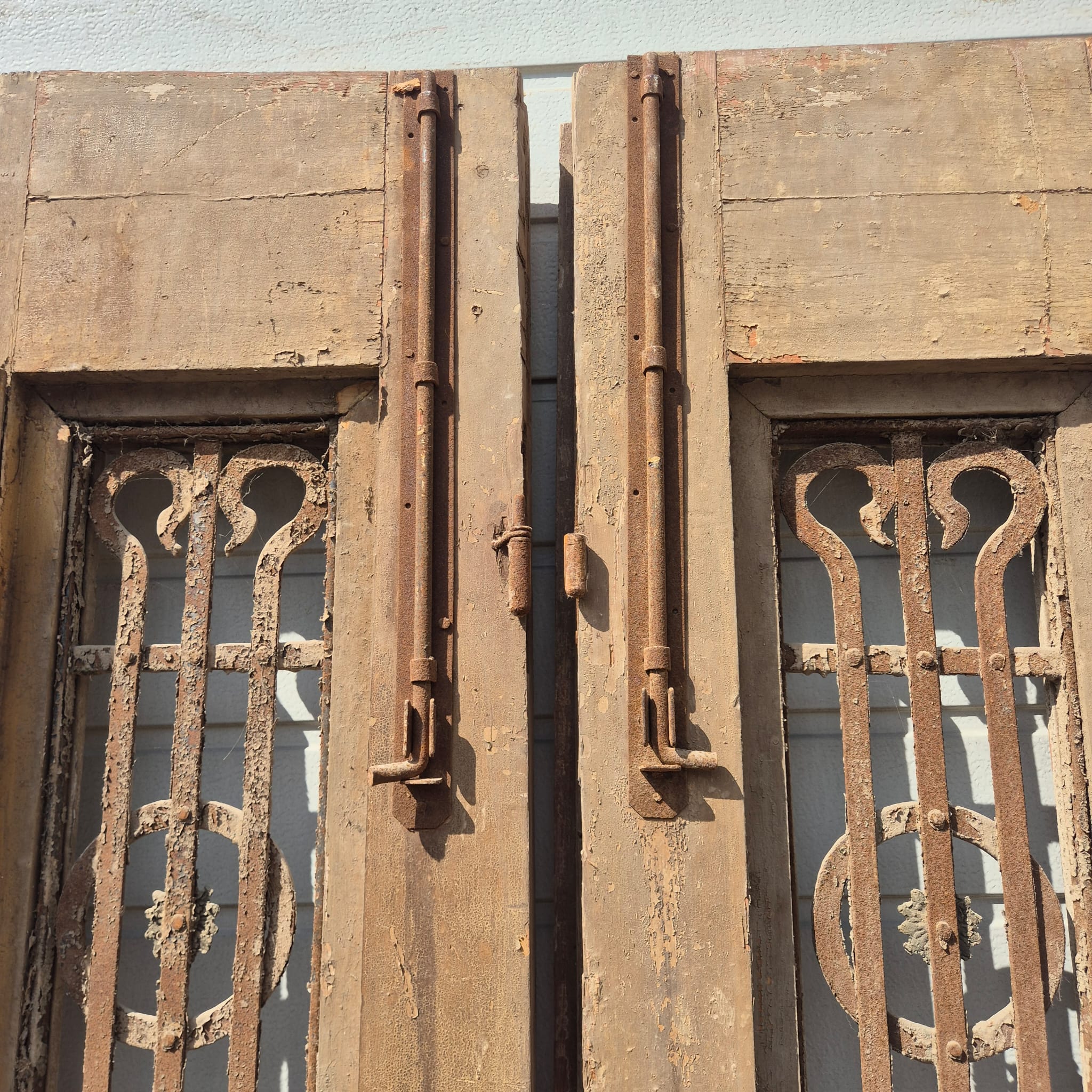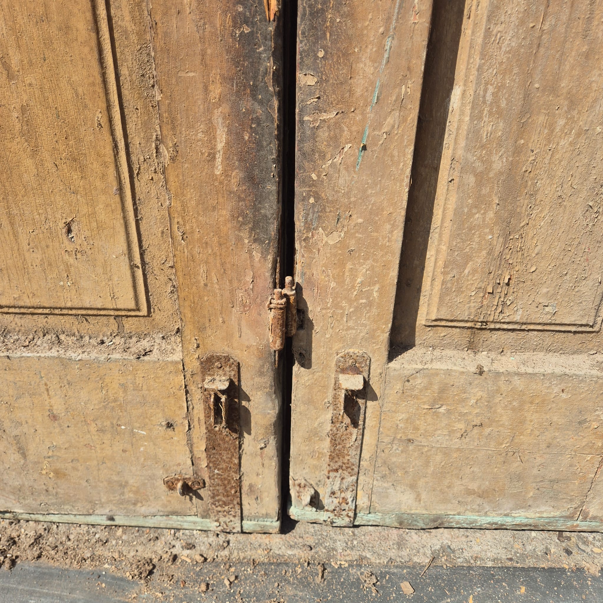 Historisches Design: Die Türflügel präsentieren sich im unrestaurierten Originalzustand mit einer faszinierenden, mehrschichtigen Farbfassung in Beige, die eine einzigartige Patina bildet.