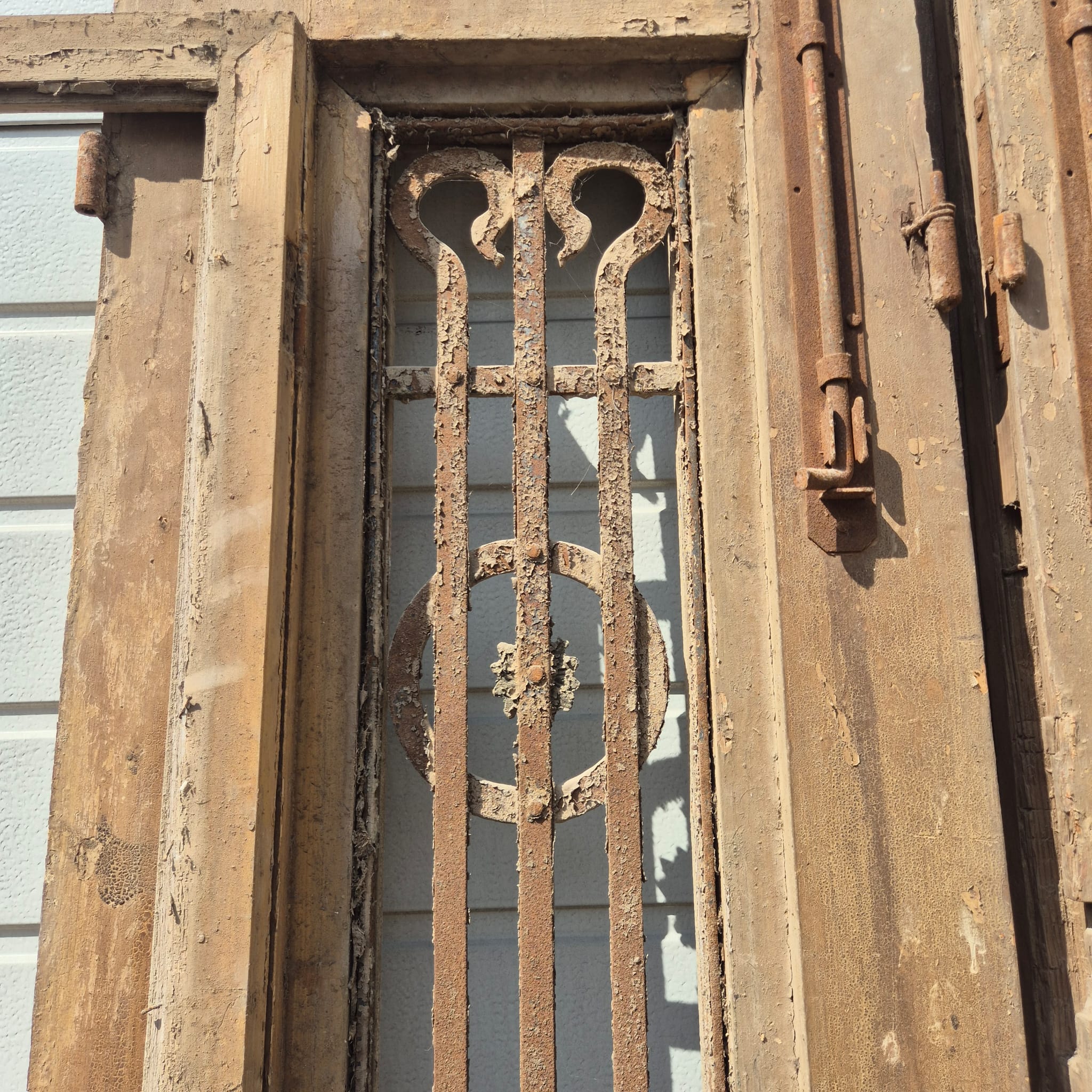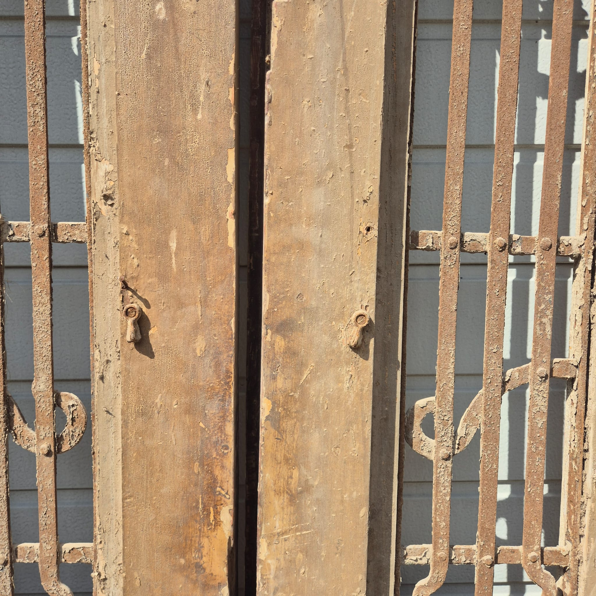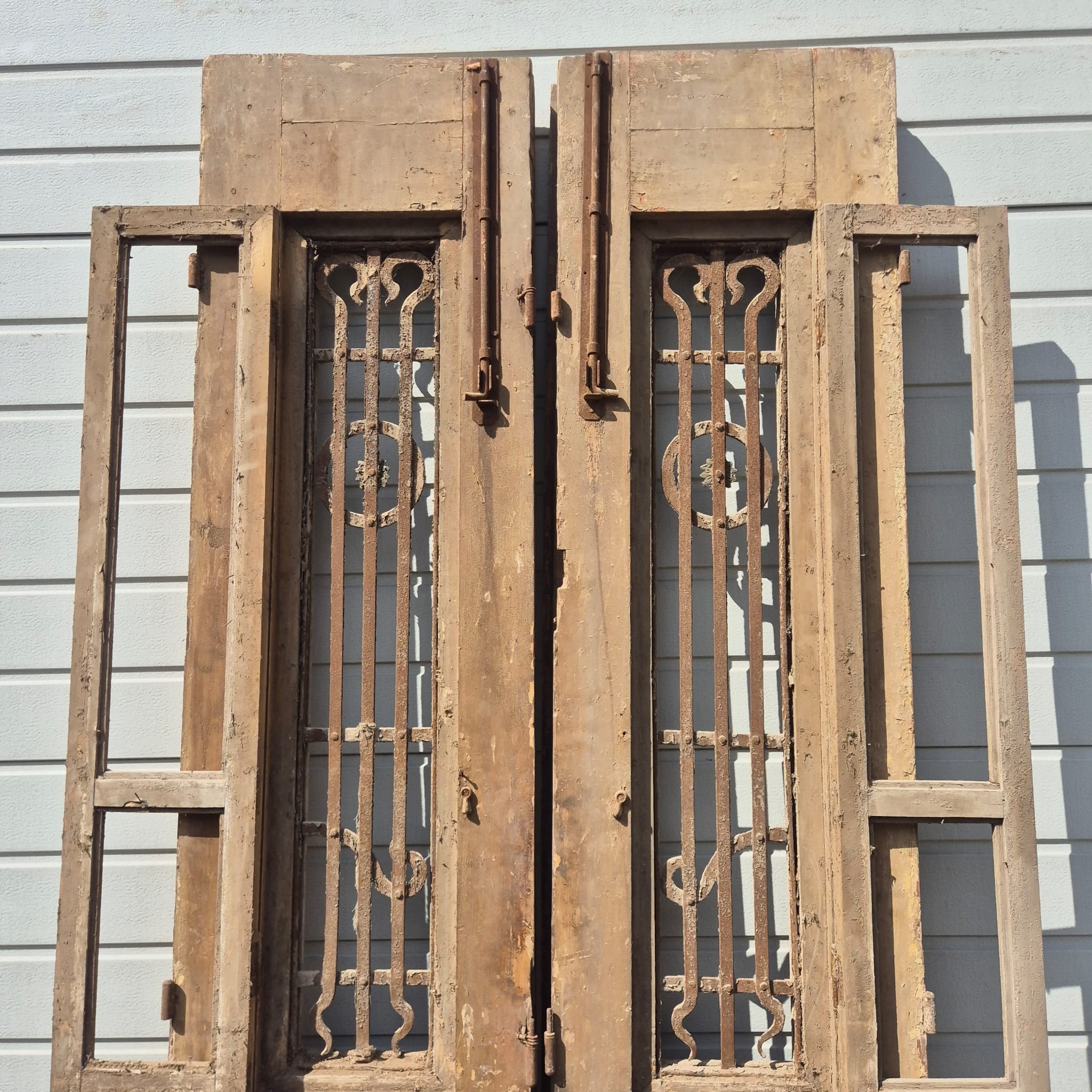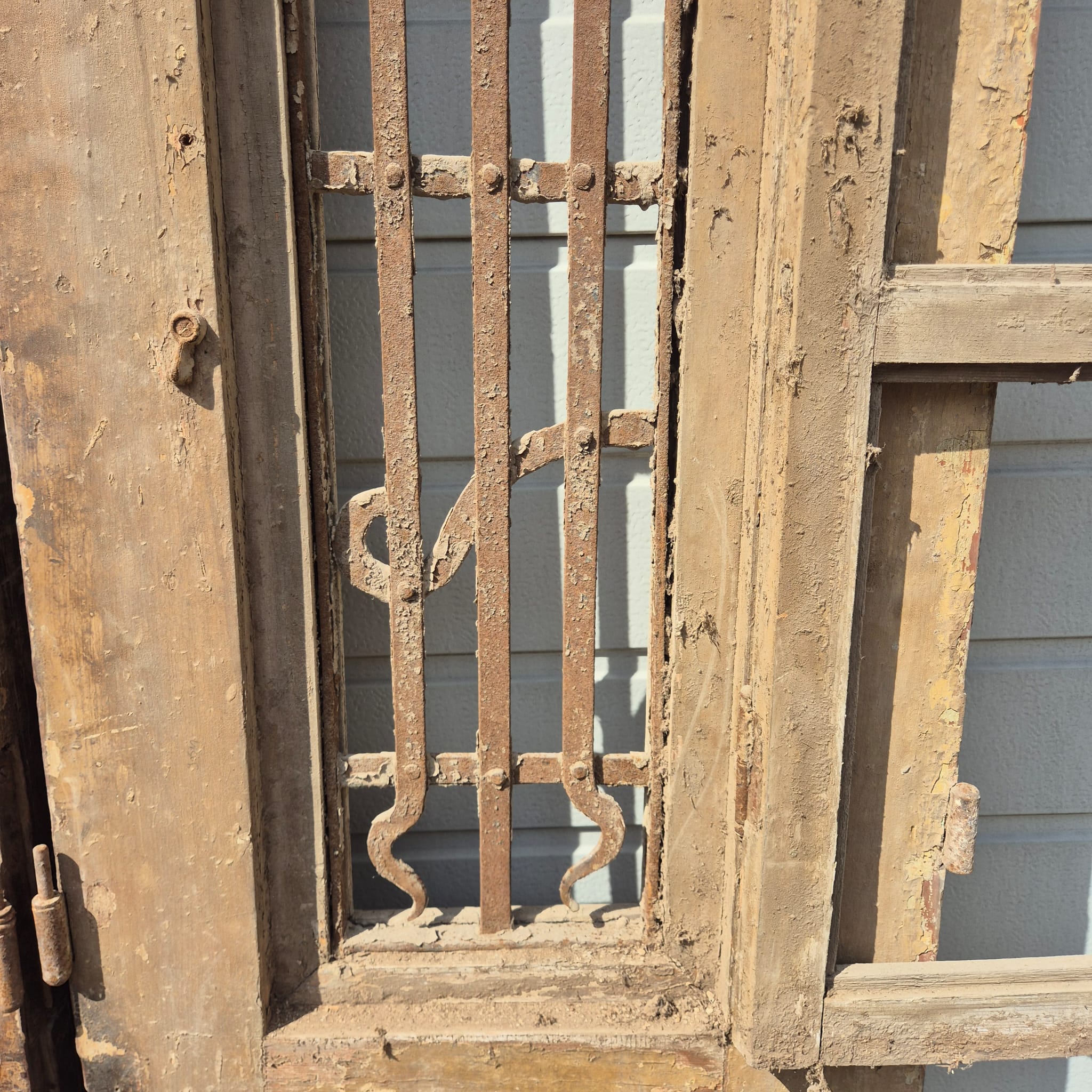 Historisches Design: Die Türflügel präsentieren sich im unrestaurierten Originalzustand mit einer faszinierenden, mehrschichtigen Farbfassung in Beige, die eine einzigartige Patina bildet.
