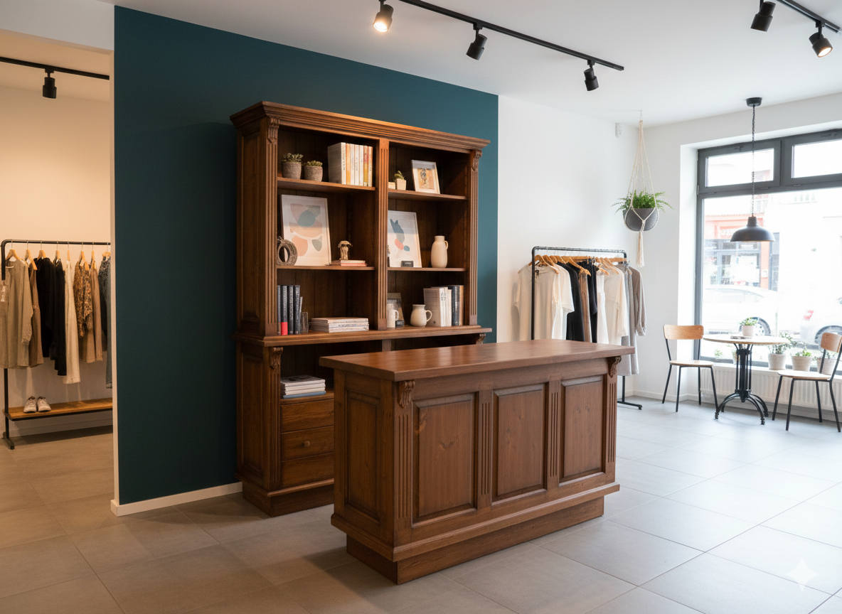 Die Kombination aus Tresen und Verkaufsschrank Modell Yvonne Marrón aus Massivholz besticht durch ihre stilvolle Eleganz und der aufwendigen Verarbeitung. Die Kombination von nostalgischer Optik und moderner Funktionalität ist für alle Ladeneinrichtungen sowie vielen weiteren Einsatzgebieten geeignet. Die Möbel werden komplett fertig montiert geliefert und sind somit sofort einsatzbereit.