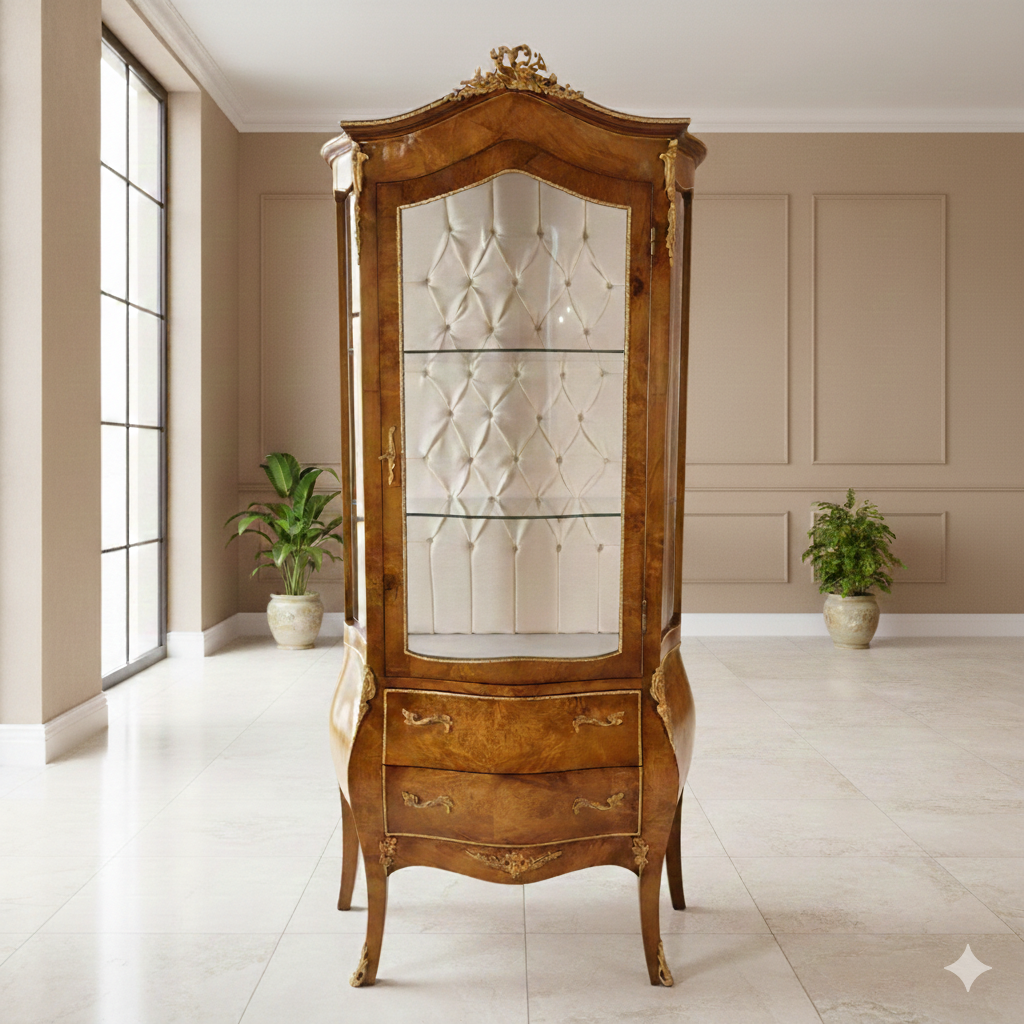 Stilvolle mit 2 Glasböden, goldenen Beschlägen und Innenverkleidung ausgestattete Vitrine im Barockstil. Die in Nussbaum furnierte Vitrine wurde mit gebogenen Glas versehen.