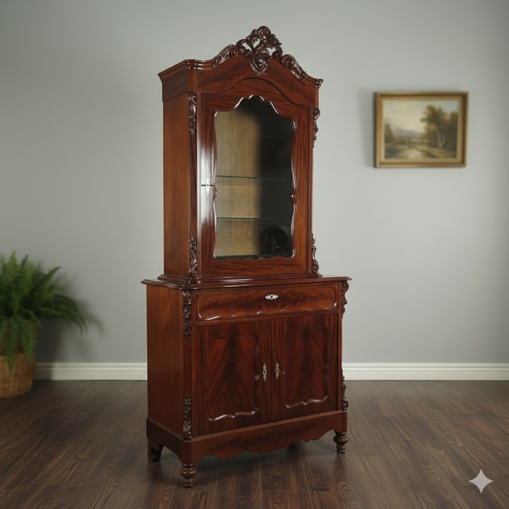 1.259,66€ Exkl. MwSt.Restaurierter Historismus Aufsatzschrank in Mahagoni auf massiv Eiche furniert und von Grund auf Schellack poliert von ca. 1860. Der Schrank befindet sich in einem sehr guten Zustand und weist nahezu keine Gebrauchsspuren auf. Er ist frei von Wurmbefall.