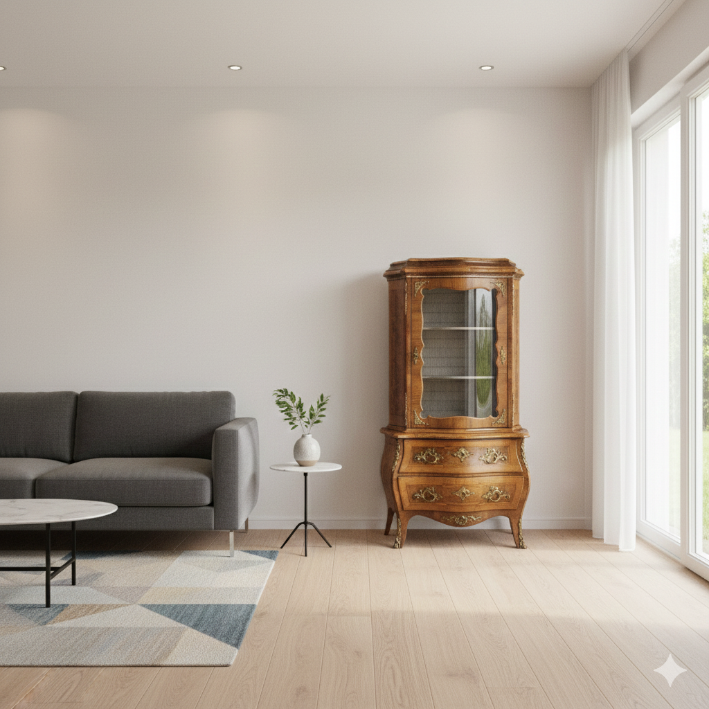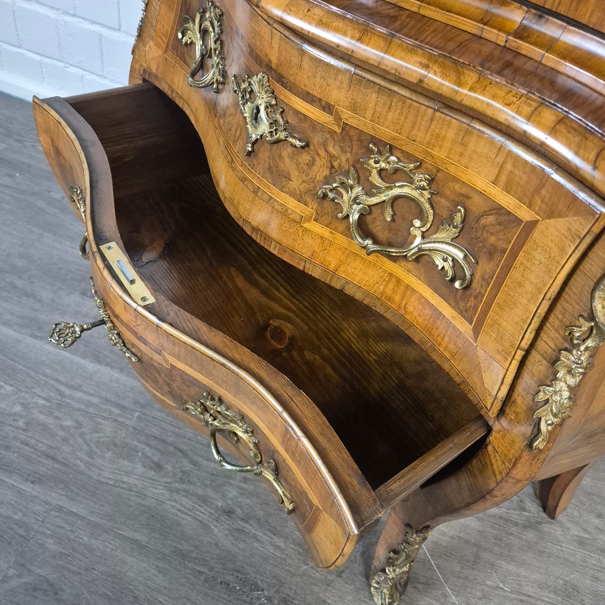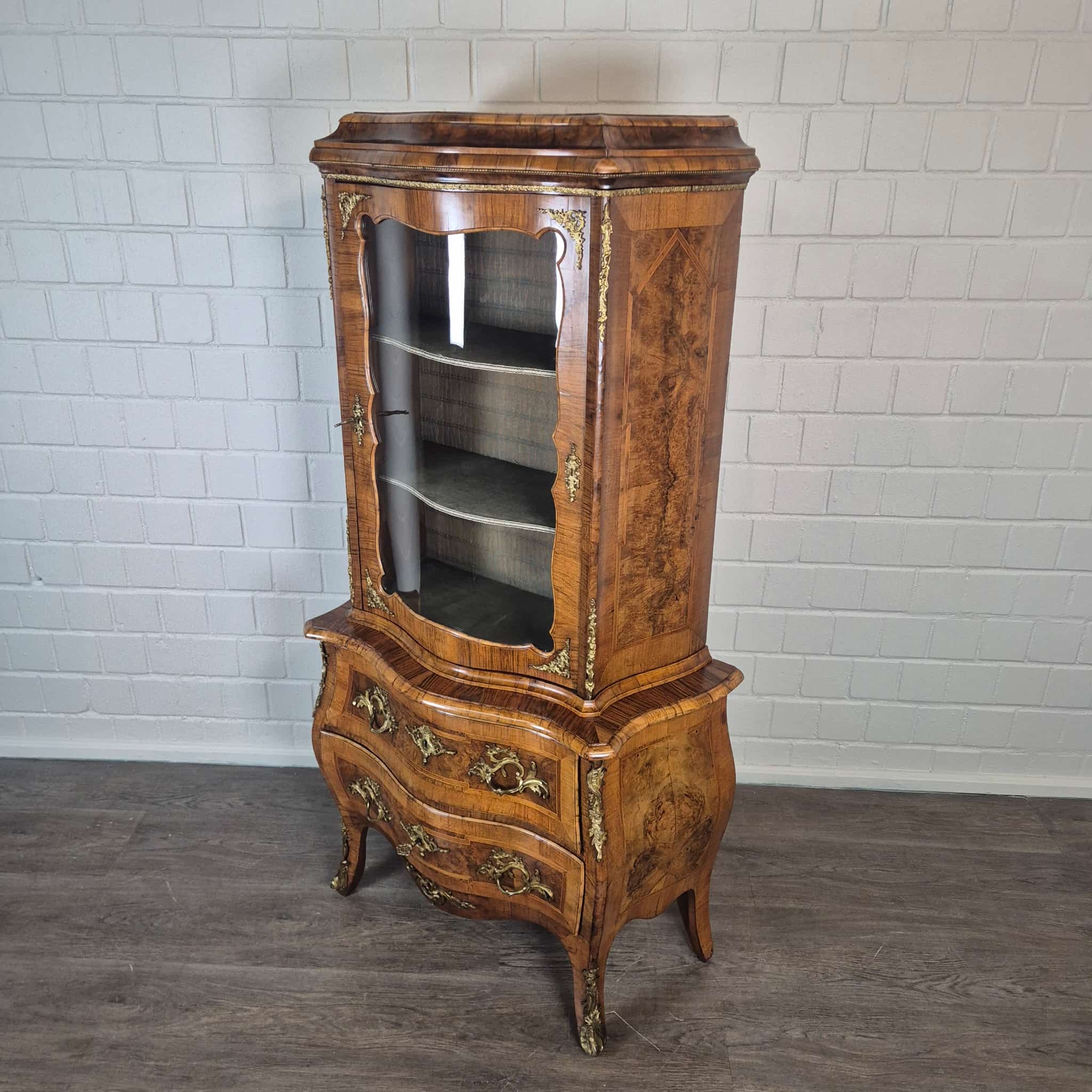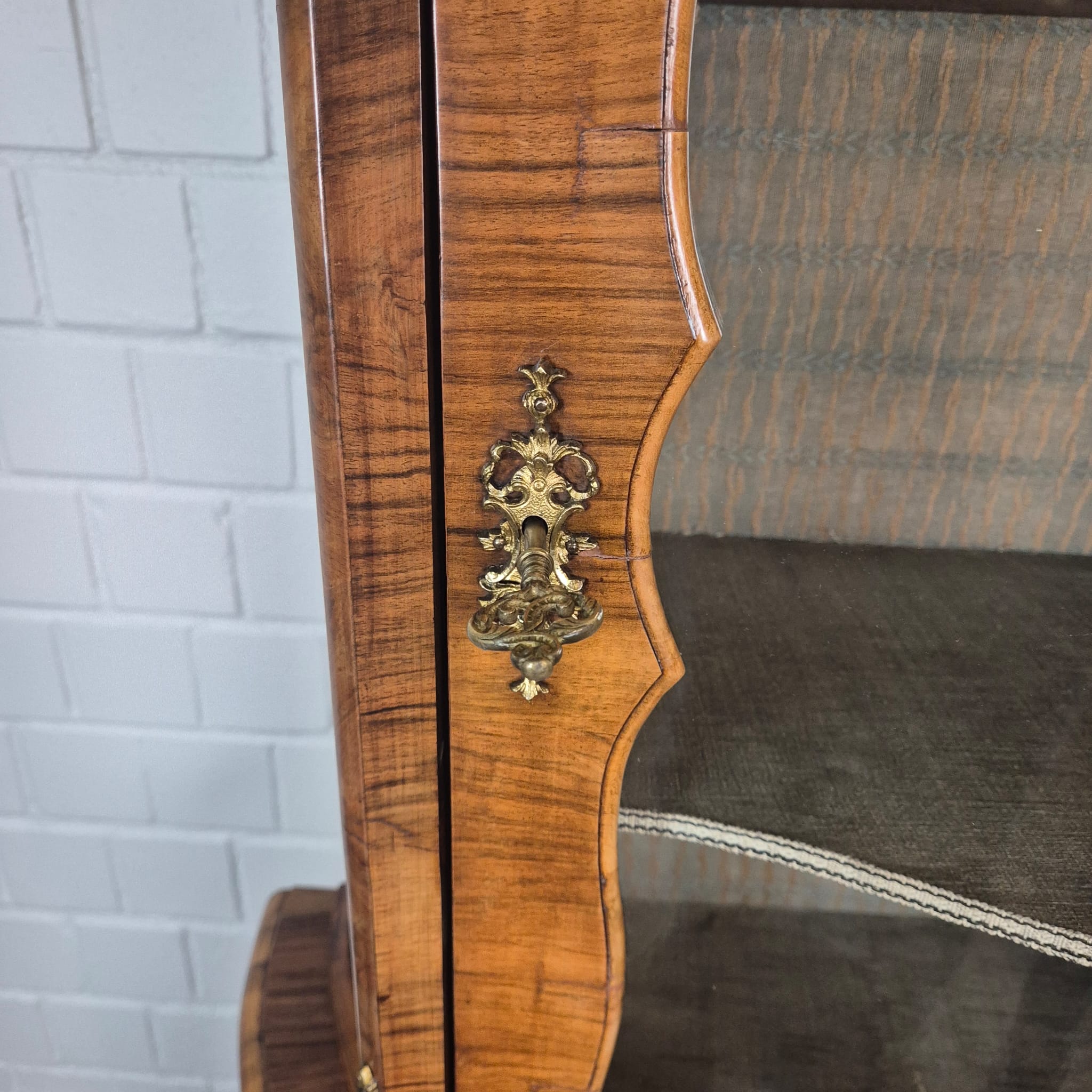 Restaurierte Dresdener Barock Vitrine in Nussbaum furniert und gewachst von ca. 1880. Der Schrank befindet sich in einem guten Zustand und weist nur geringe Gebrauchsspuren auf.