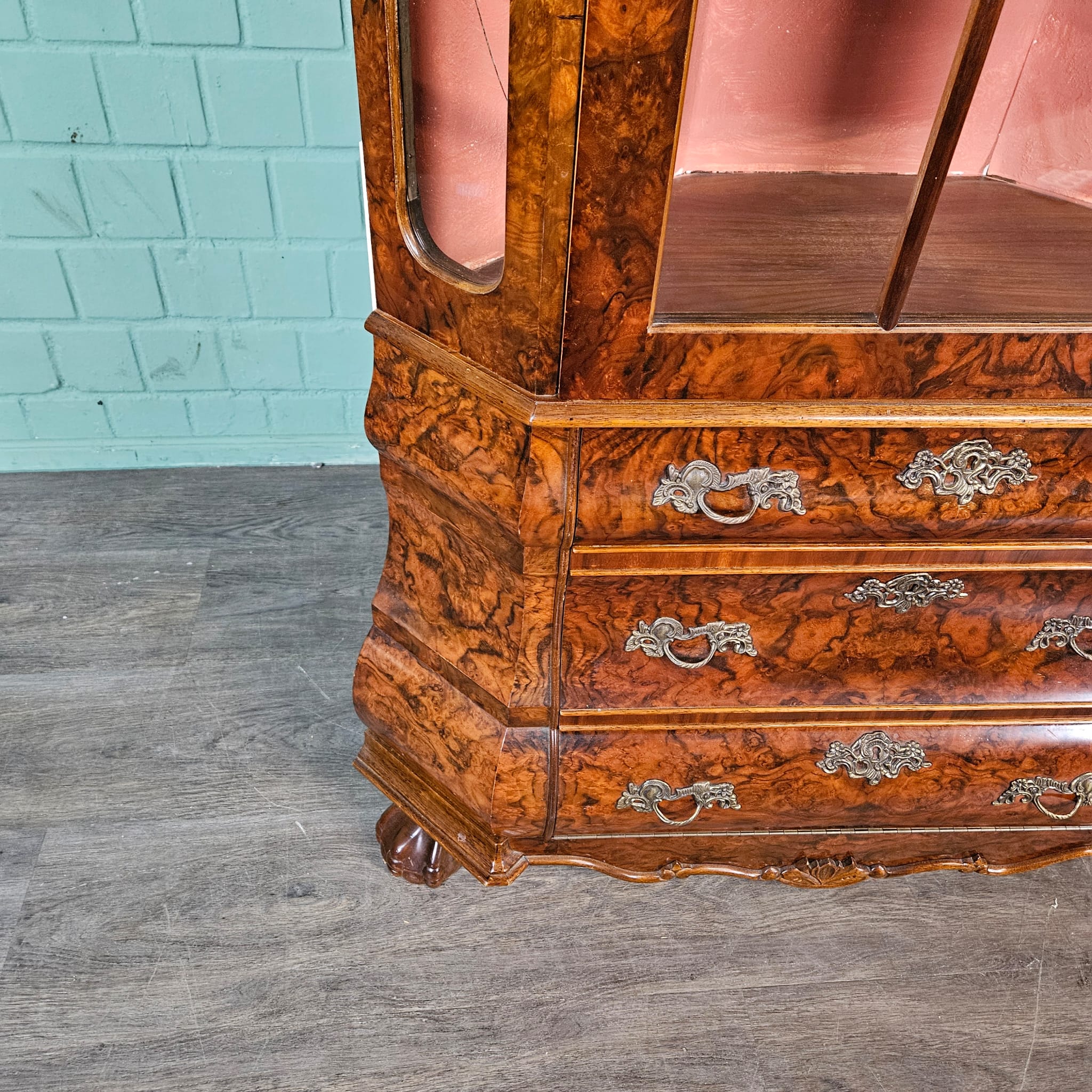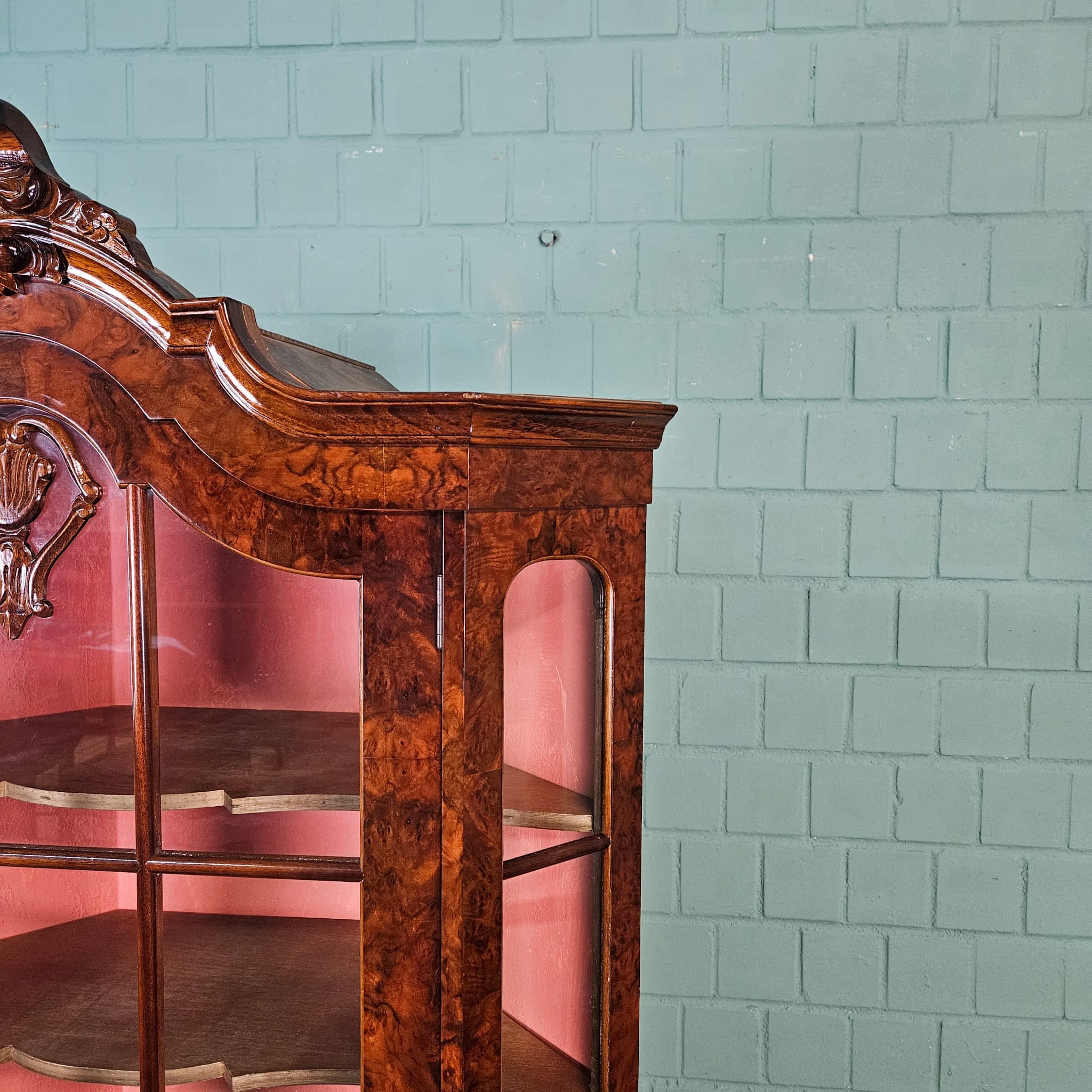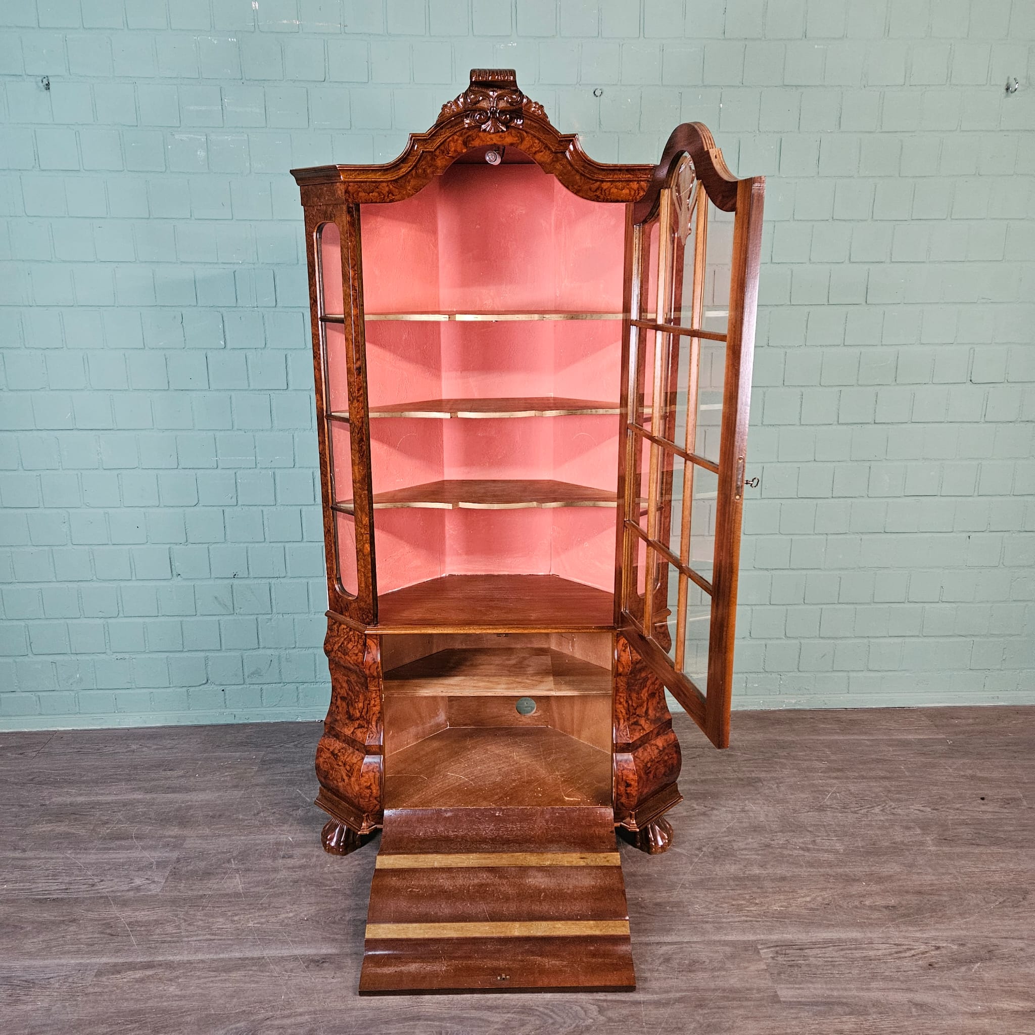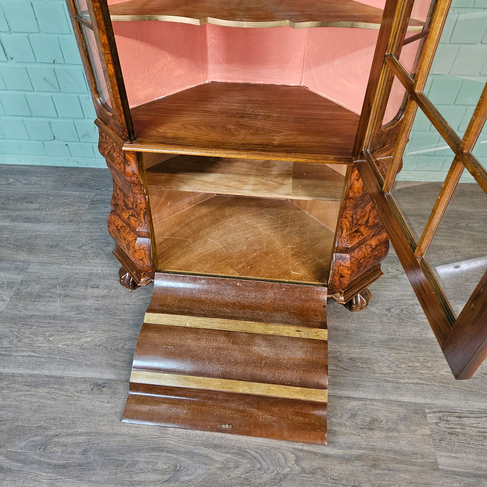 Restaurierte Neubarock Eck-Vitrine in Nussbaum furniert. Der ca. 30 Jahre alte Eckschrank befindet sich in einem guten Zustand und weist nur geringe Gebrauchsspuren auf.