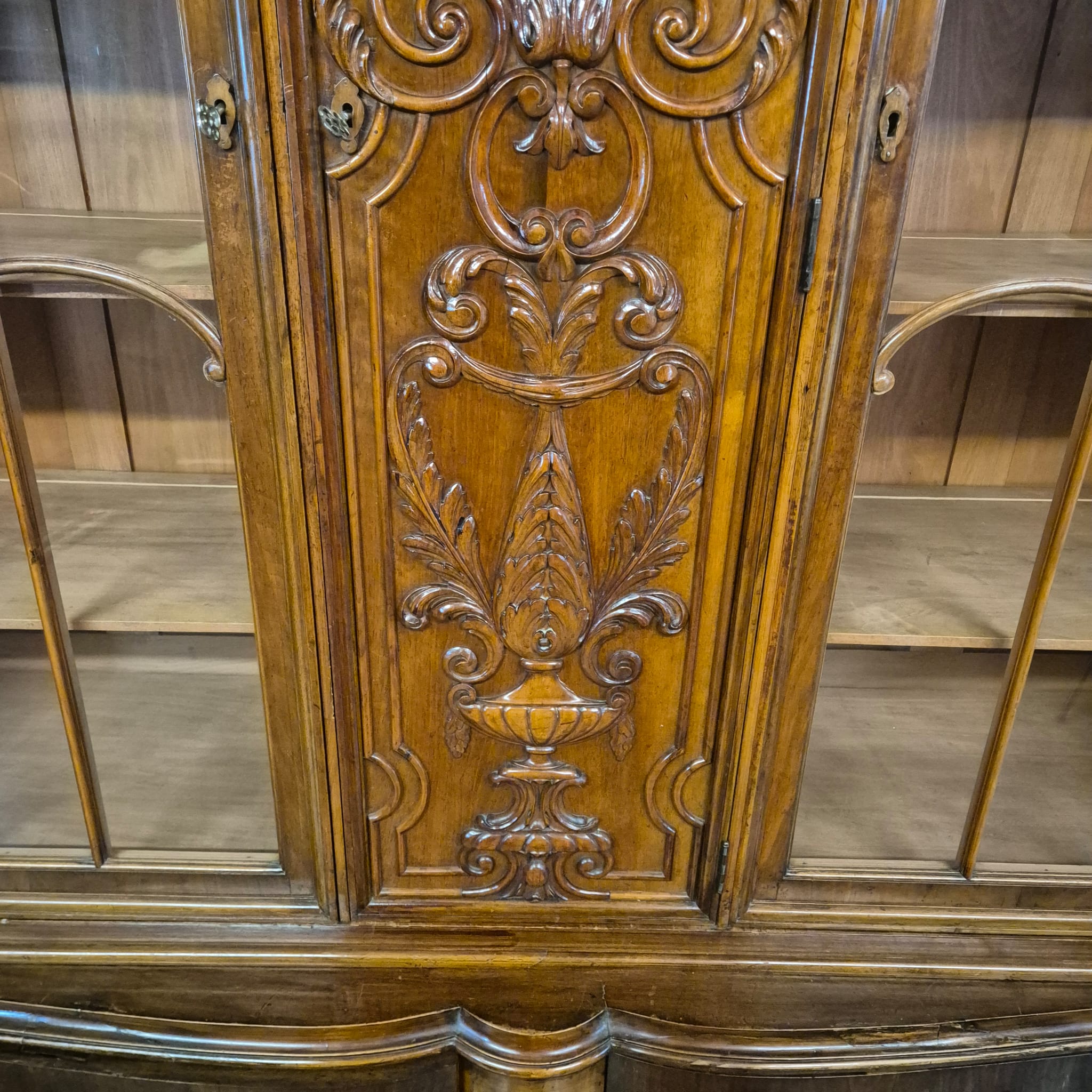 Restaurierte Neubarock Vitrine in Nussbaum furniert und lackiert von ca. 1900. Der Schrank befindet sich in einem guten Zustand und weist nur leichte Gebrauchsspuren auf. Zerlegbar (2-teilig).