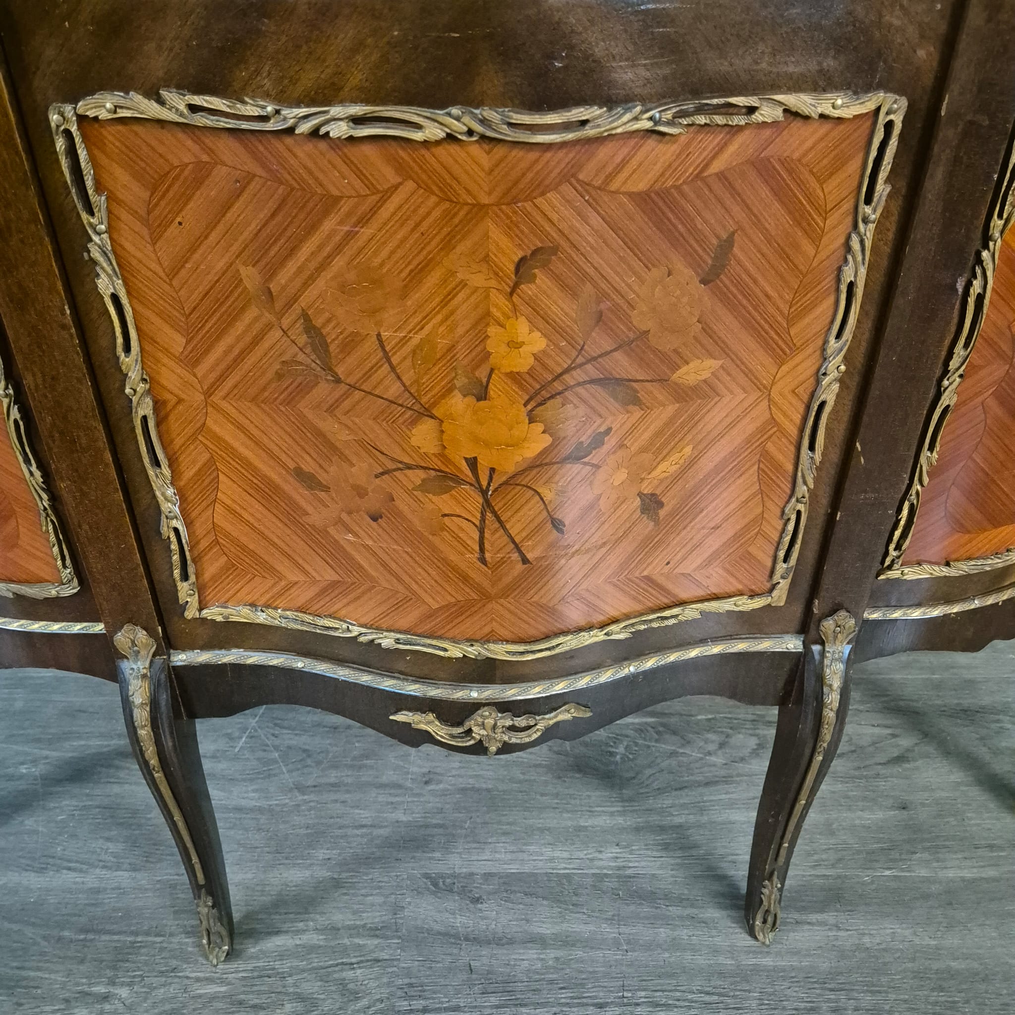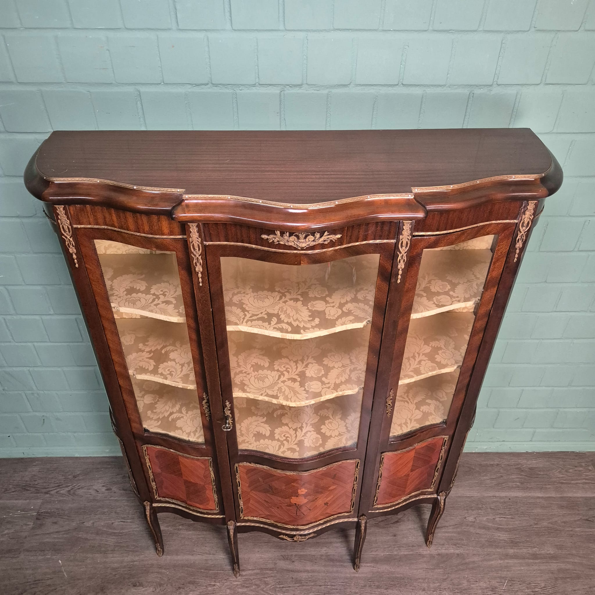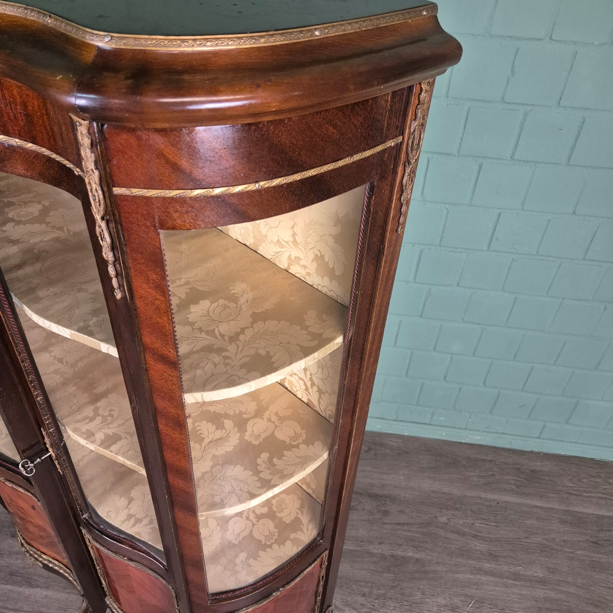 Hochwertige Neubarock Vitrine in Mahagoni furniert und lackiert von ca. 1930. Der mit Beschlägen aus Bronze versehene Schrank befindet sich in einem sehr guten Zustand und weist nur minimale Gebrauchsspuren auf.