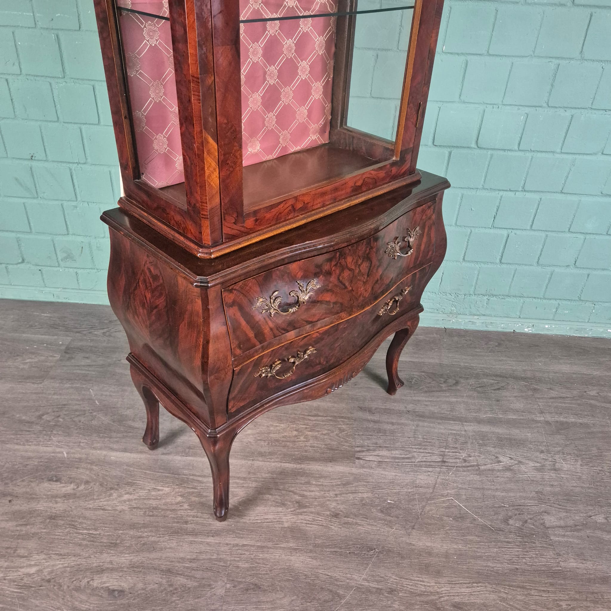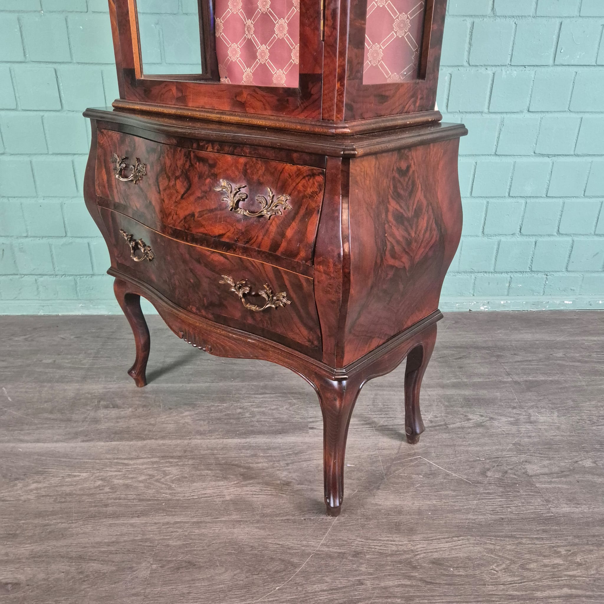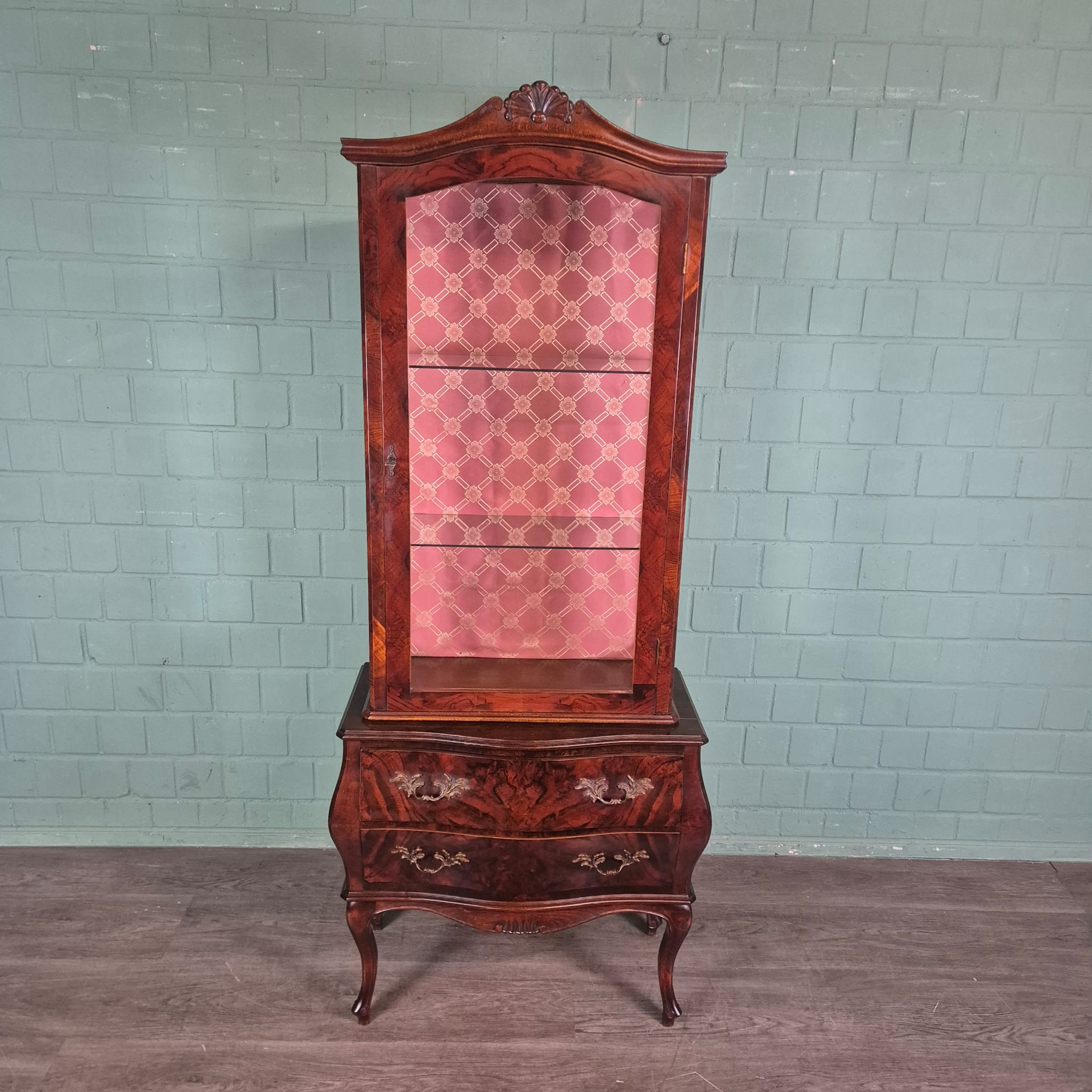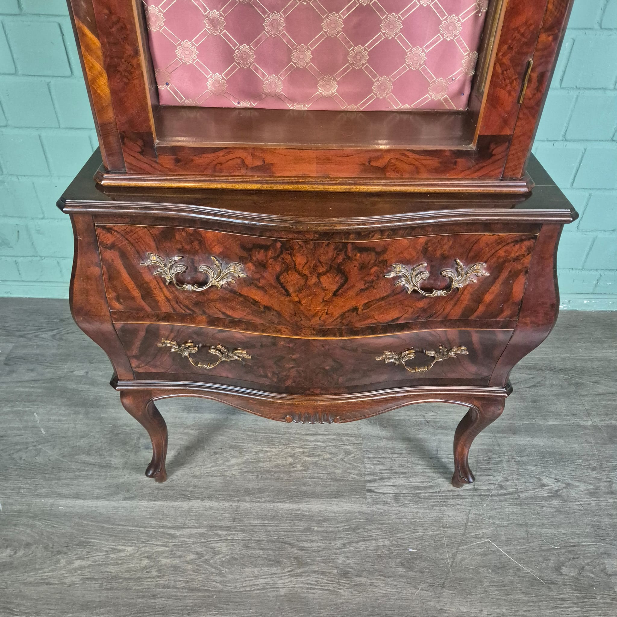 Stilvolle Neubarock Vitrine in Nussbaum furniert von ca. 1950. Der dreiseitig verglaste Schrank befindet sich in einem sehr guten Zustand und weist nur minimale Gebrauchsspuren auf. Zerlegbar (2-teilig).
