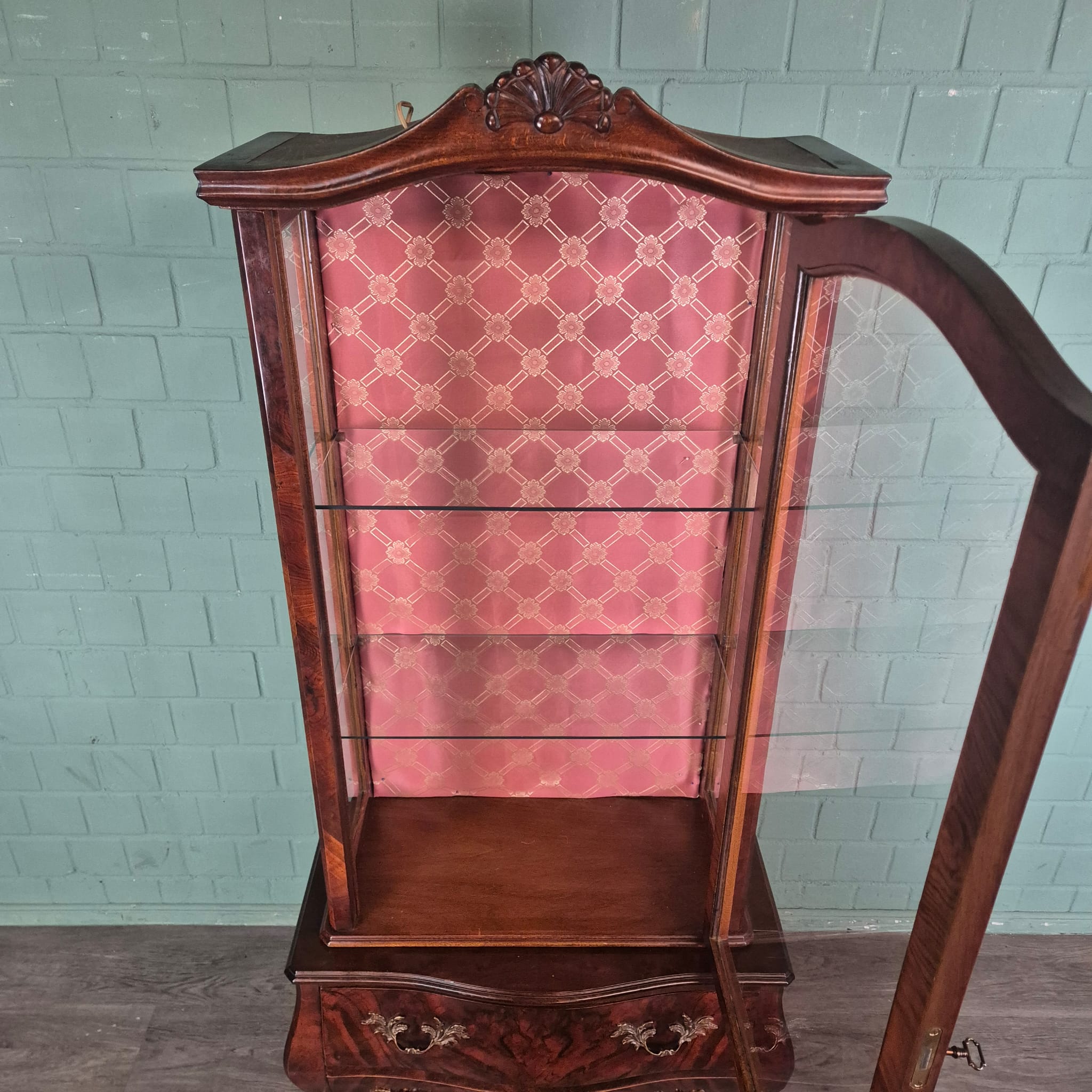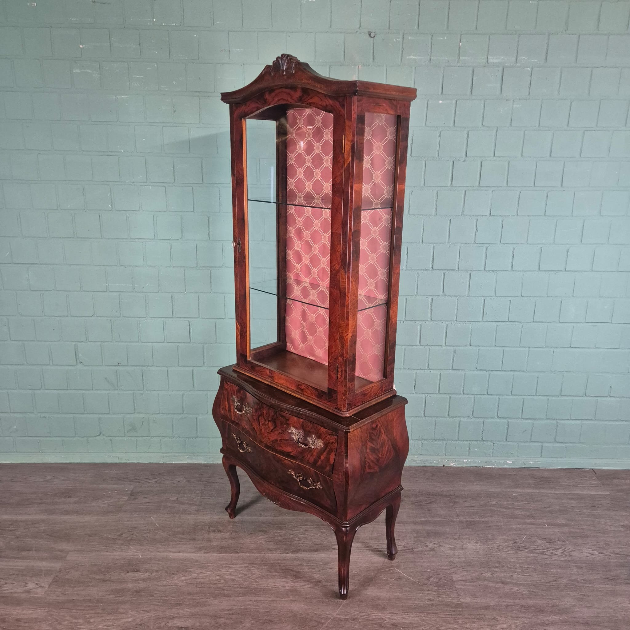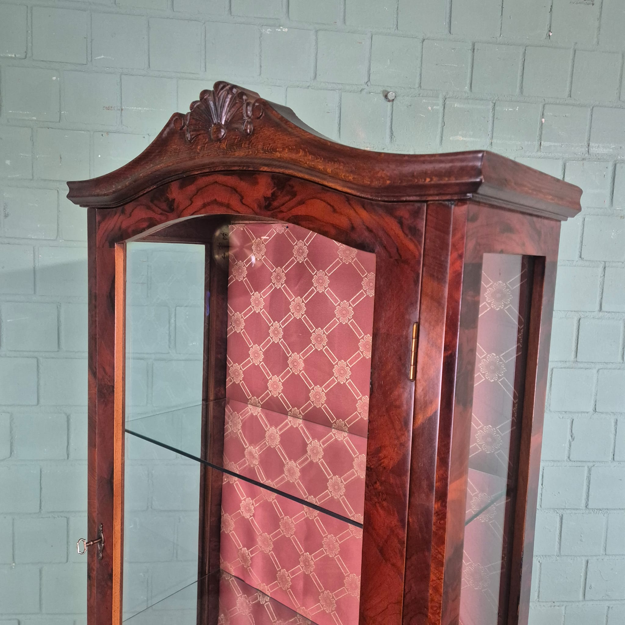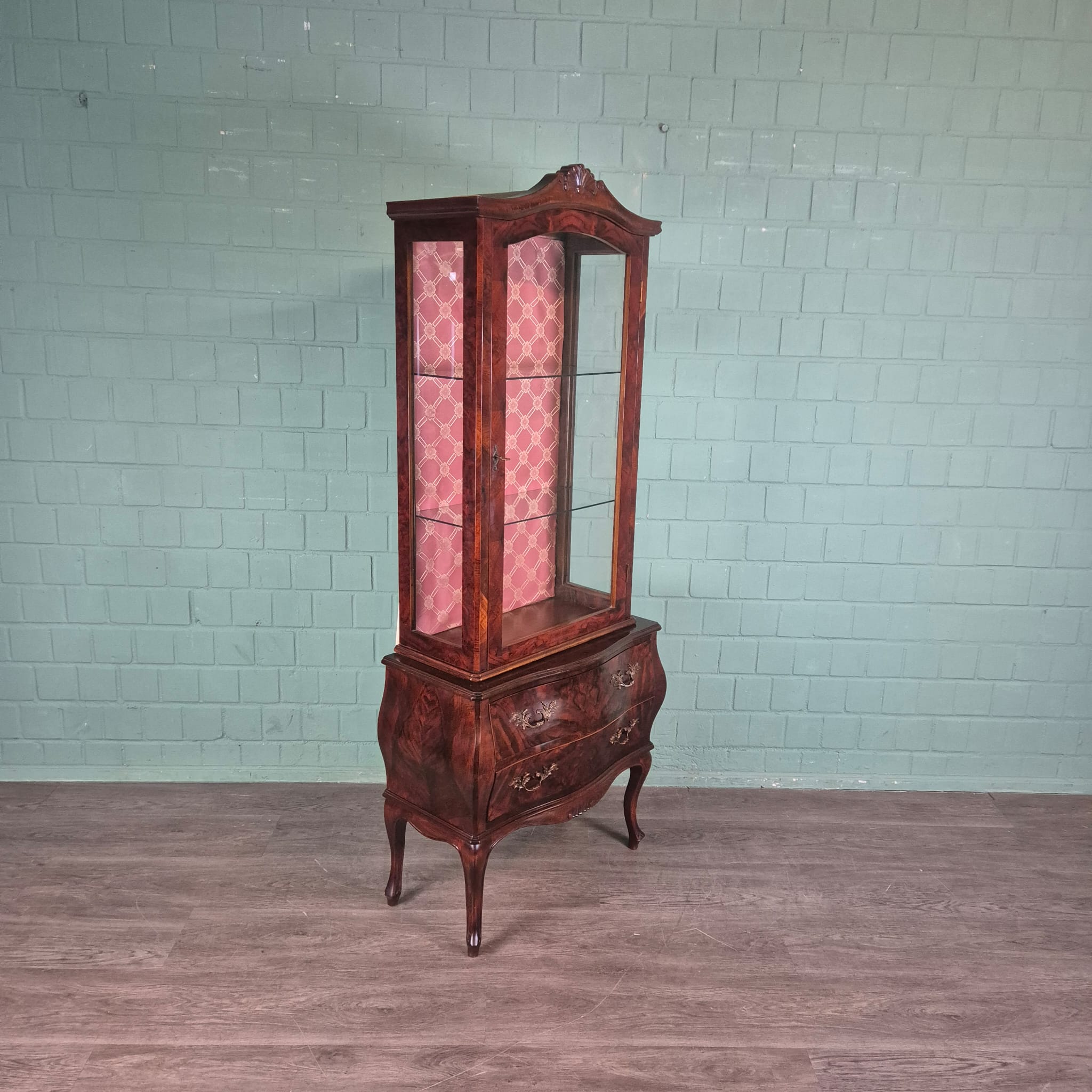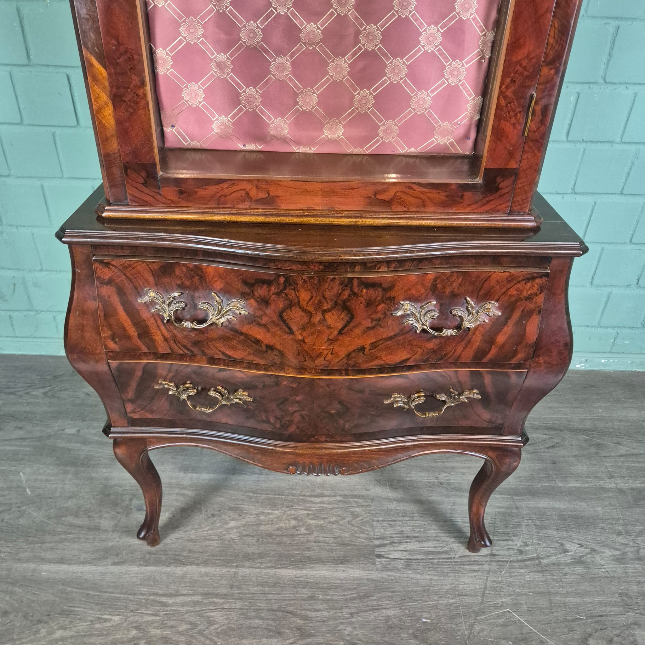 Stilvolle Neubarock Vitrine in Nussbaum furniert von ca. 1950. Der dreiseitig verglaste Schrank befindet sich in einem sehr guten Zustand und weist nur minimale Gebrauchsspuren auf. Zerlegbar (2-teilig).