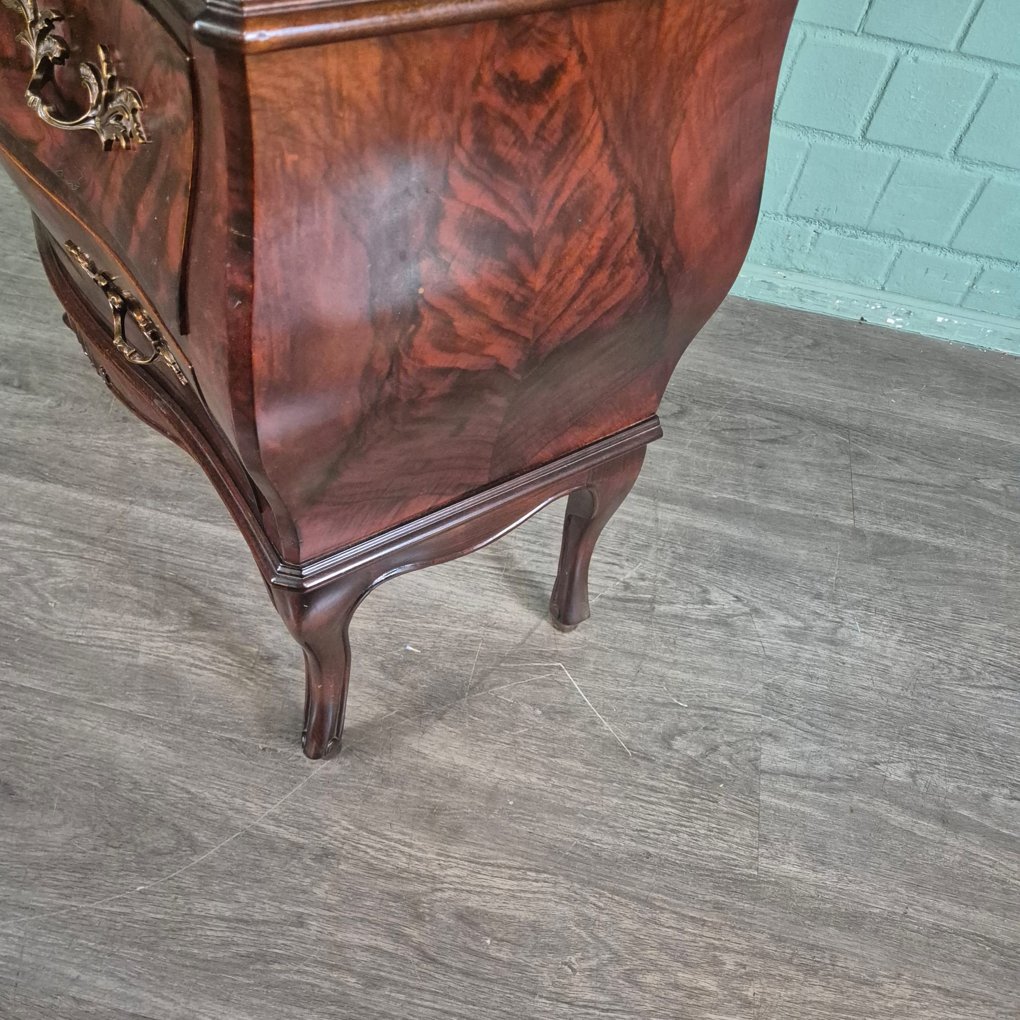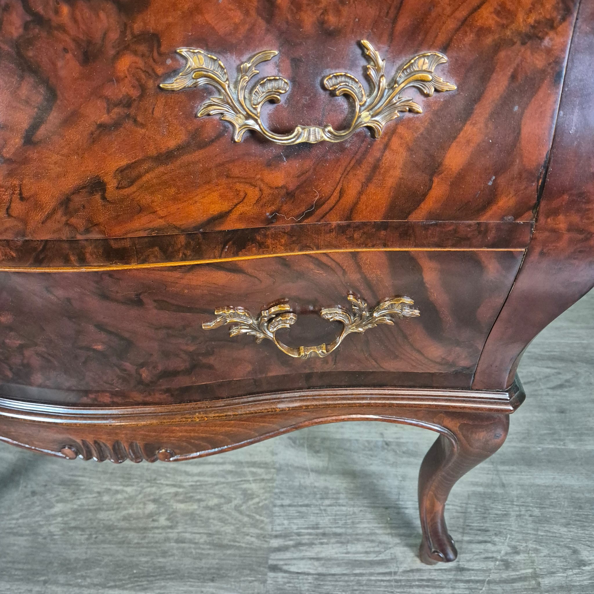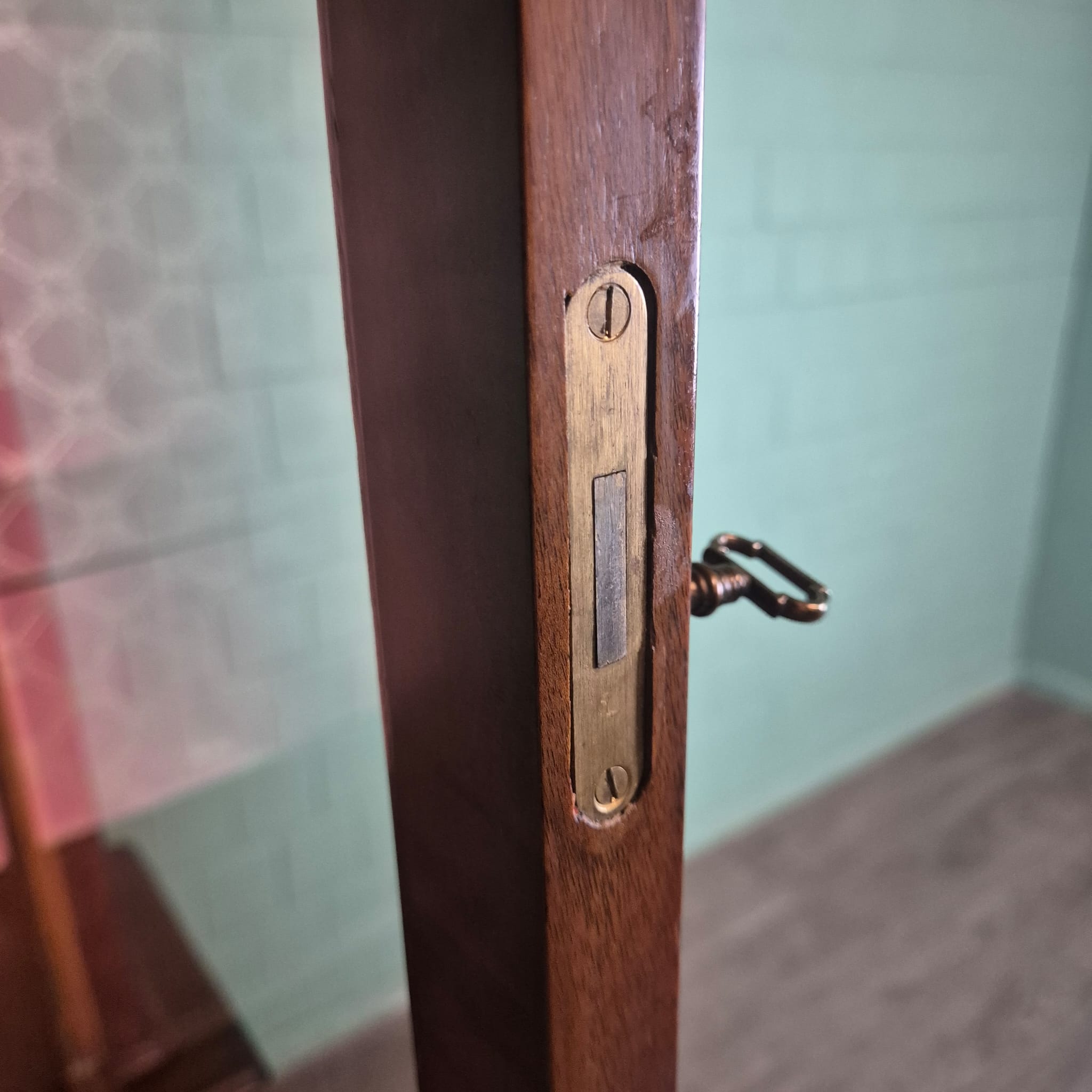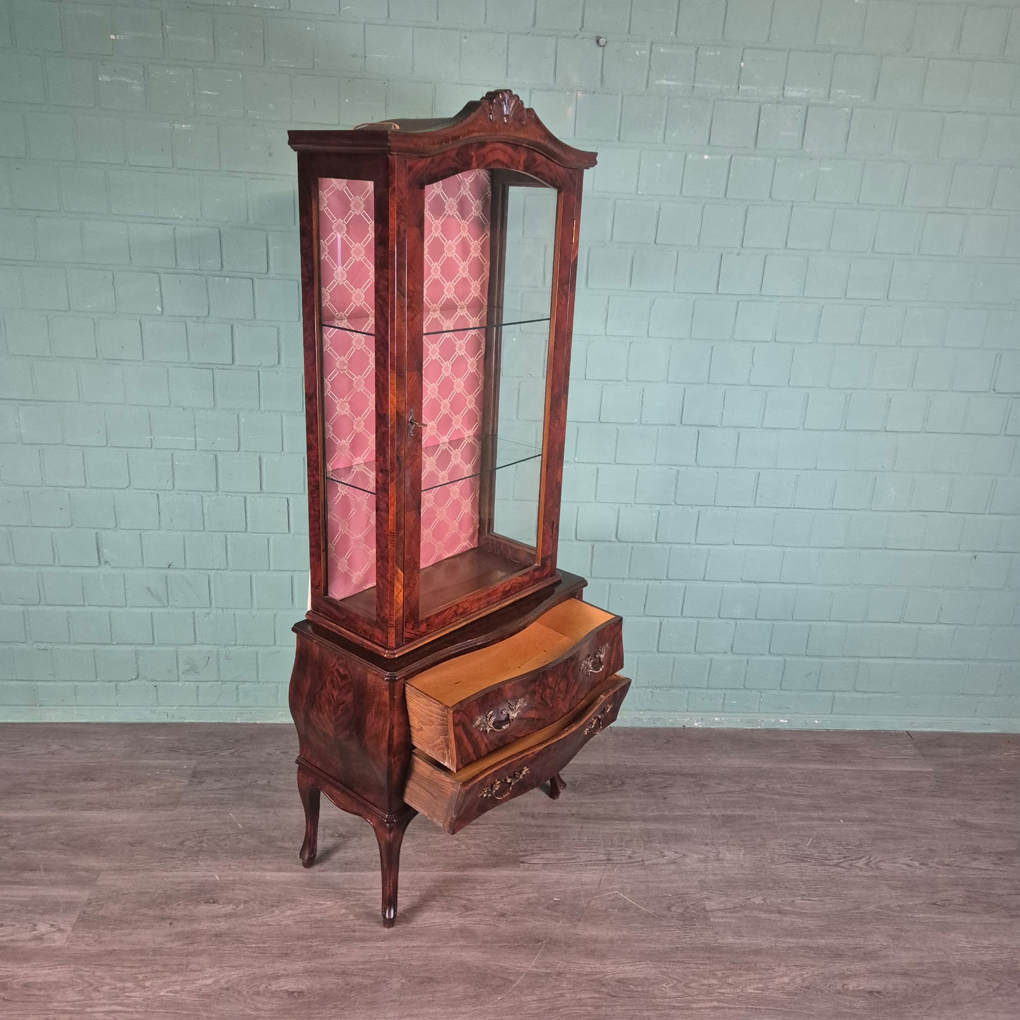 Stilvolle Neubarock Vitrine in Nussbaum furniert von ca. 1950. Der dreiseitig verglaste Schrank befindet sich in einem sehr guten Zustand und weist nur minimale Gebrauchsspuren auf. Zerlegbar (2-teilig).