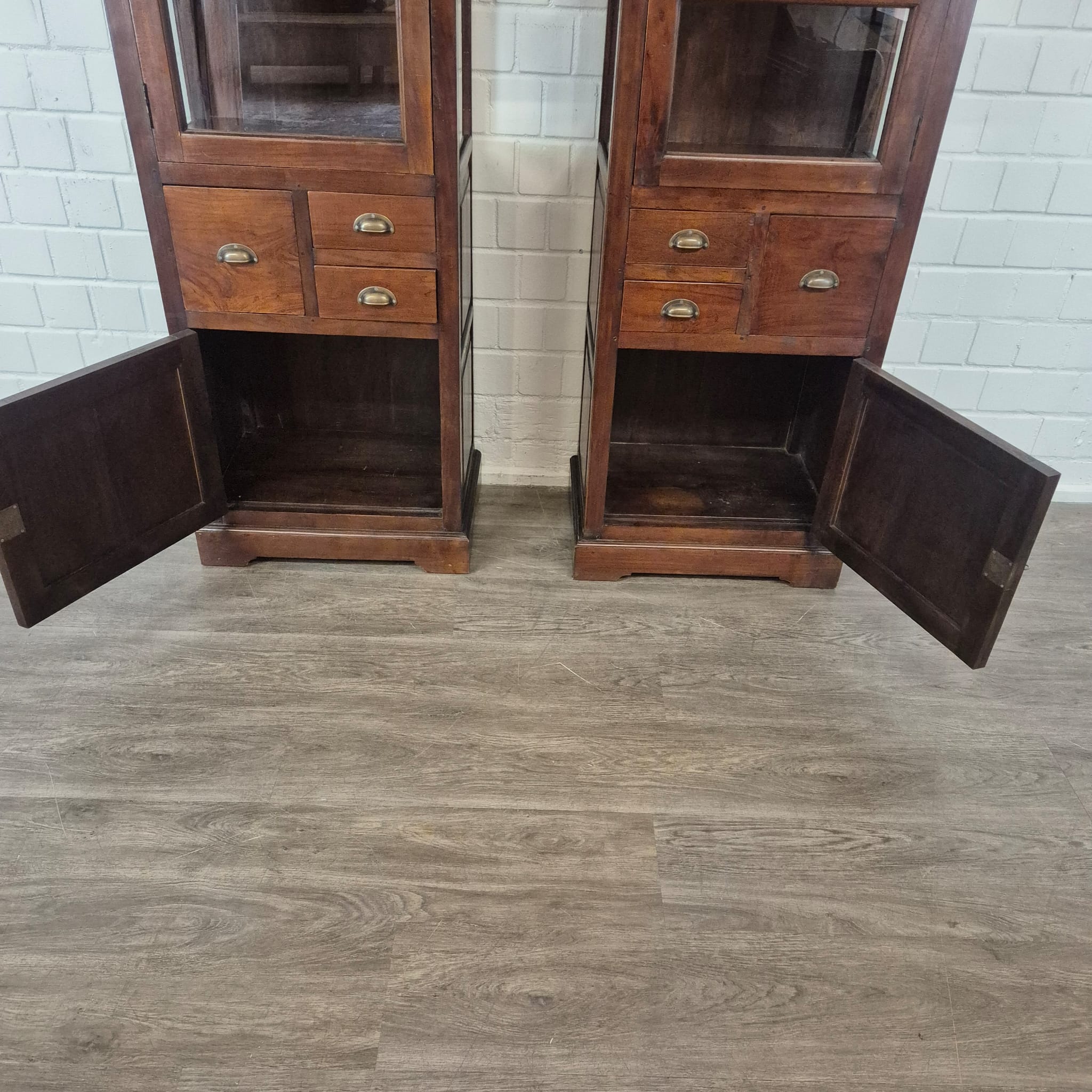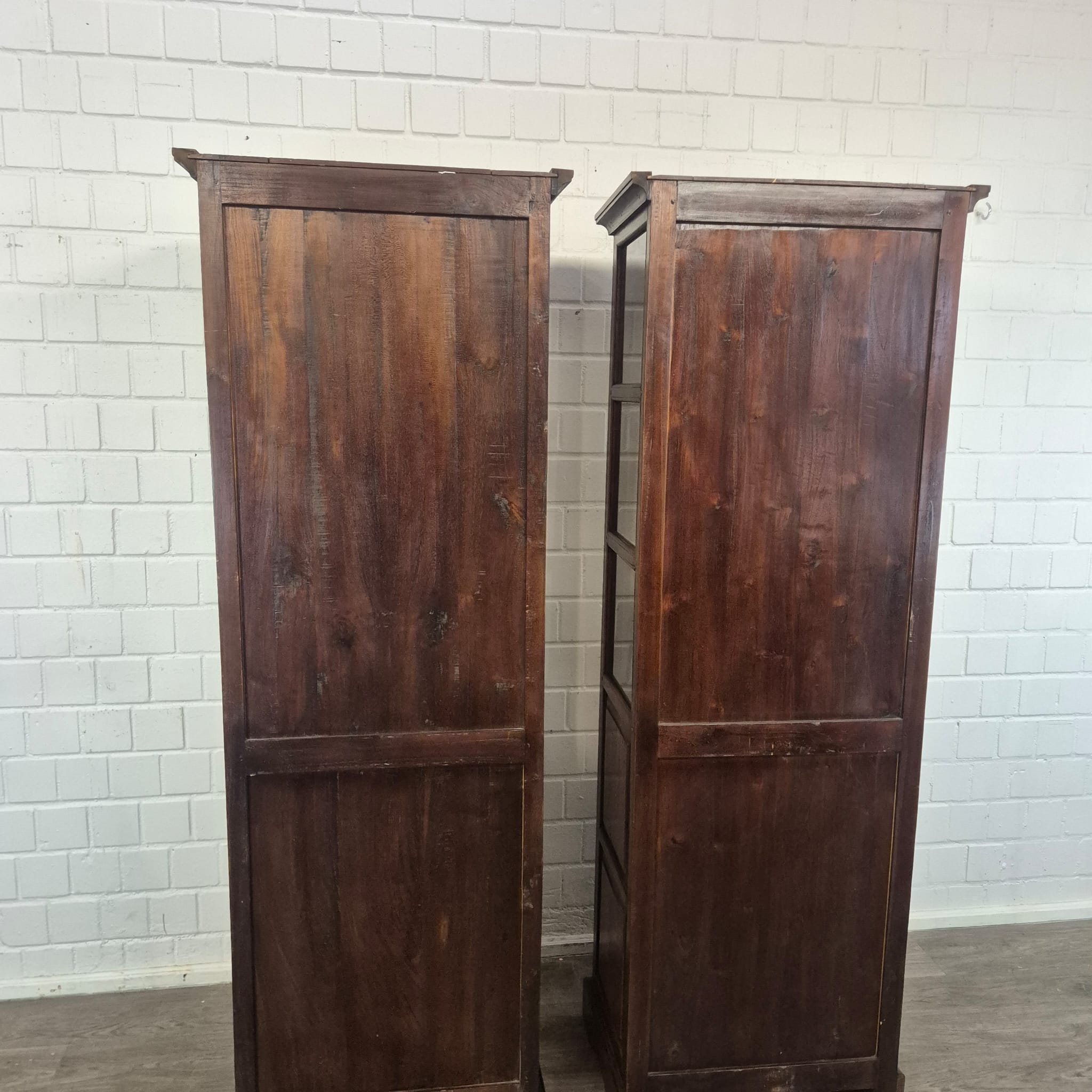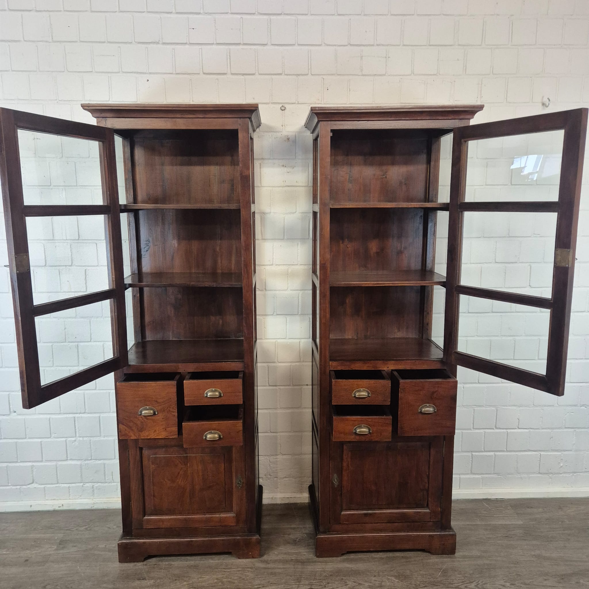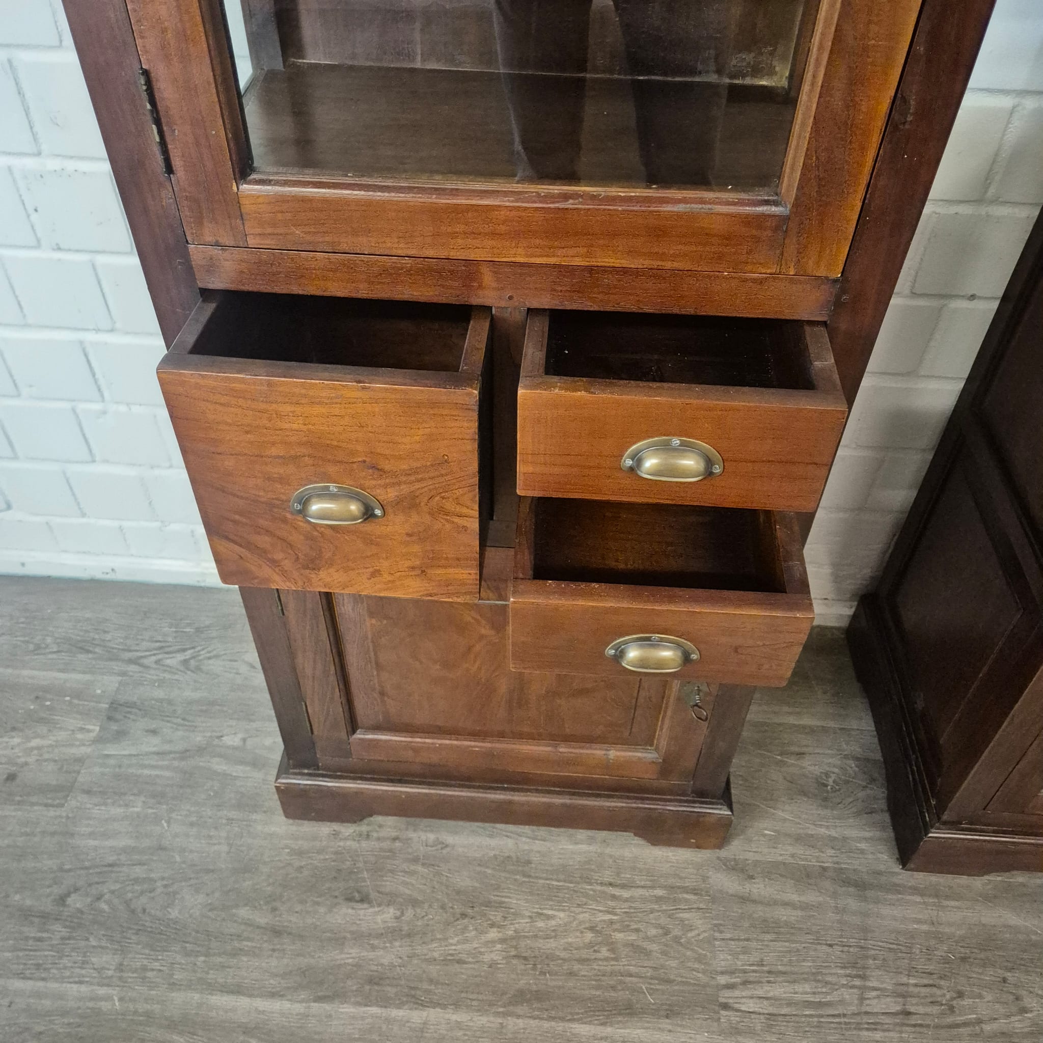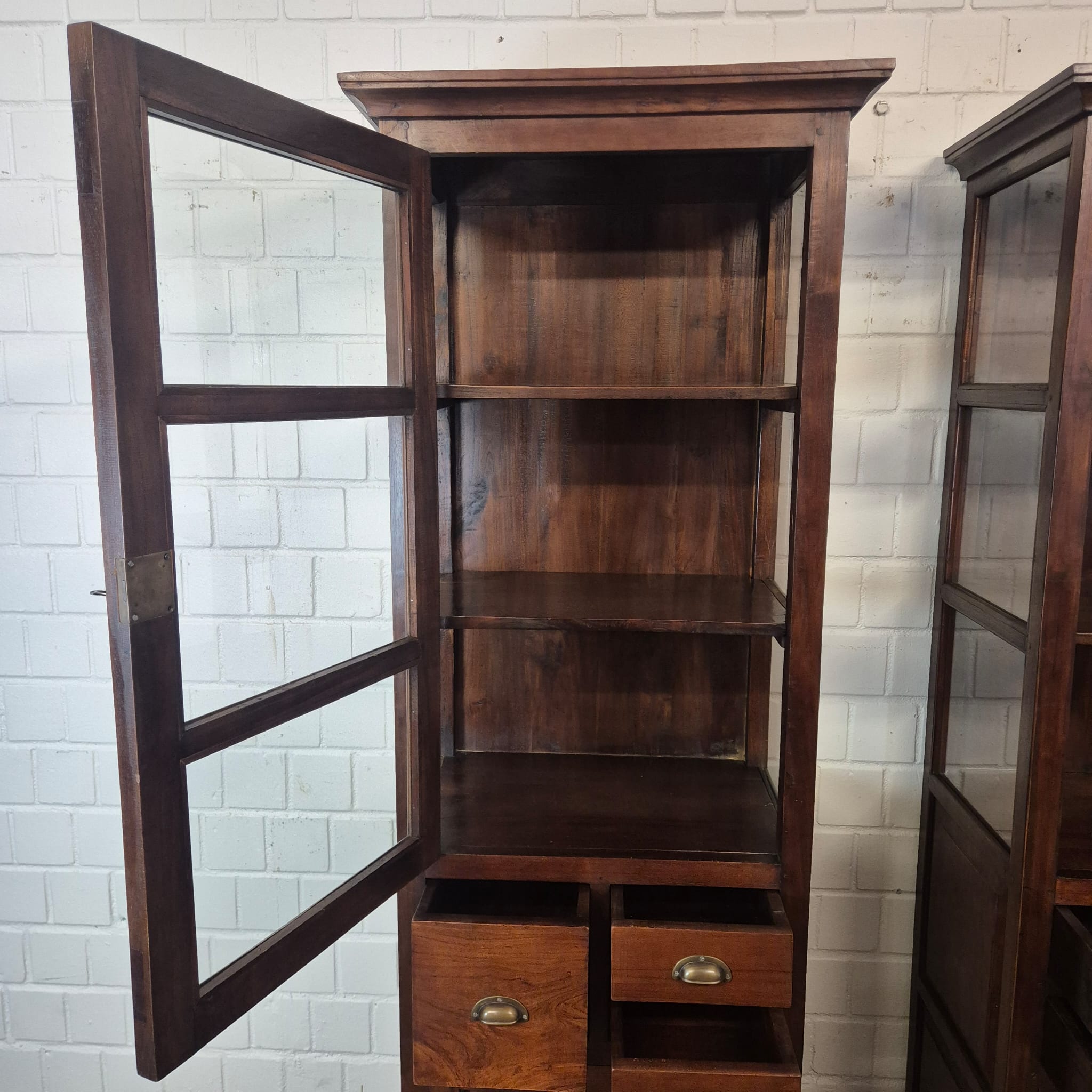 Diese aufwendig gestaltete Vitrine aus massiv Teakholz (lackiert) erhält seine besondere Wirkung durch natürliche Unregelmäßigkeiten im Holz. Diese entstehen durch das verwendete Edelholz mit seinen verschiedenen Strukturen, welche diesem Stück einen eigentümlichen Charakter verleihen und es zu einem Unikat machen. Machart und Farbton des Holzes tragen sehr zum optischen Wert dieses Möbels bei, das sowohl dekorative Möglichkeiten als auch genügend Stauraum bietet. Stückpreis (Setpreis 1099,00 Euro).
