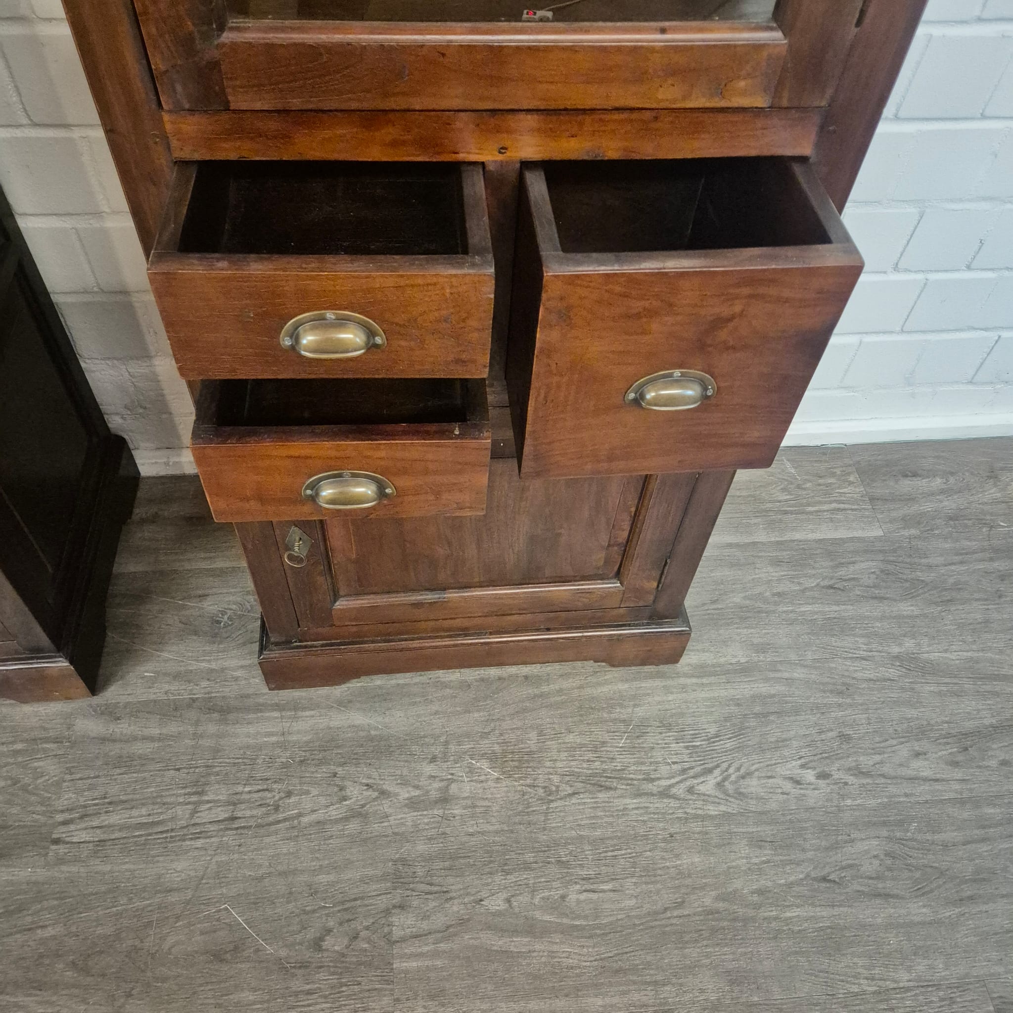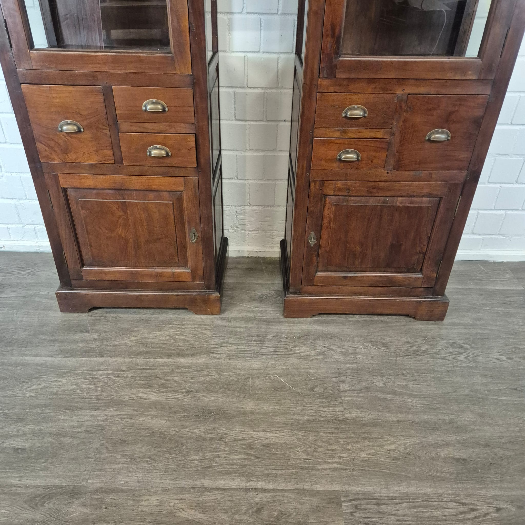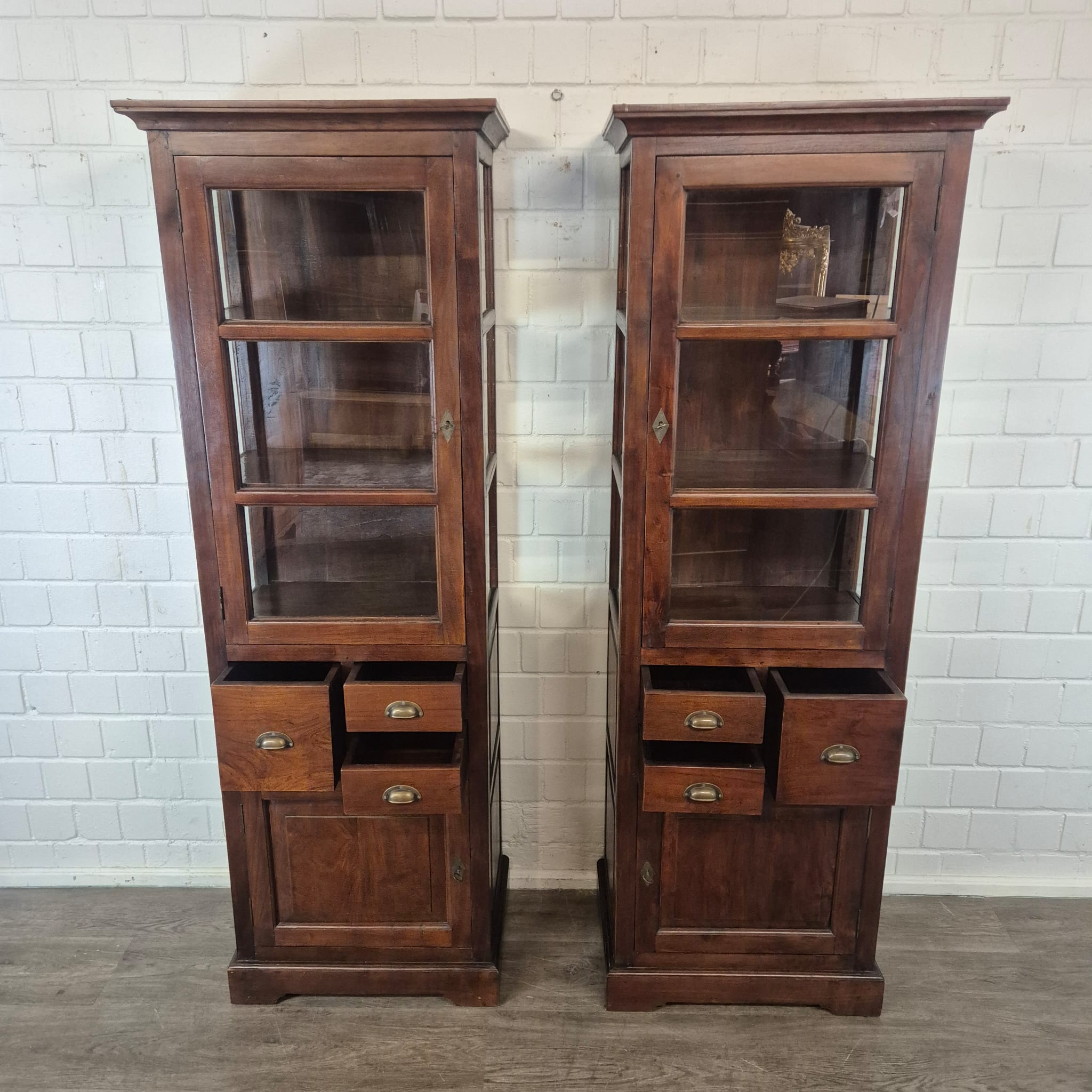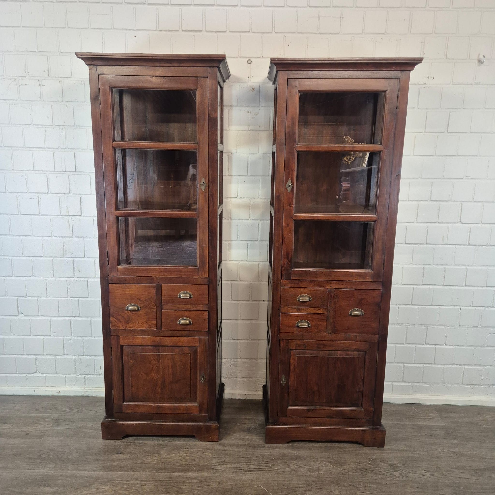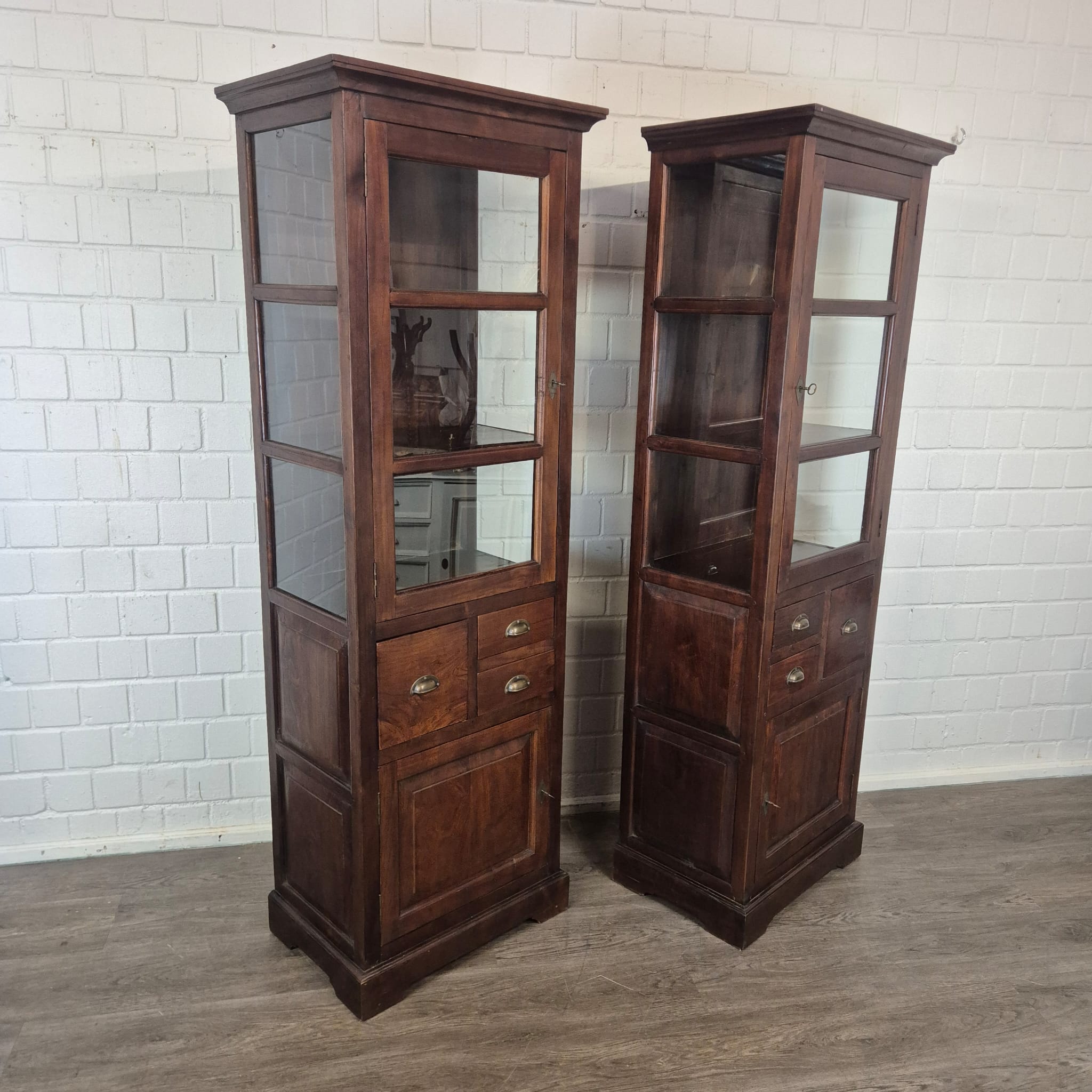 Diese aufwendig gestaltete Vitrine aus massiv Teakholz (lackiert) erhält seine besondere Wirkung durch natürliche Unregelmäßigkeiten im Holz. Diese entstehen durch das verwendete Edelholz mit seinen verschiedenen Strukturen, welche diesem Stück einen eigentümlichen Charakter verleihen und es zu einem Unikat machen. Machart und Farbton des Holzes tragen sehr zum optischen Wert dieses Möbels bei, das sowohl dekorative Möglichkeiten als auch genügend Stauraum bietet. Stückpreis (Setpreis 1099,00 Euro).