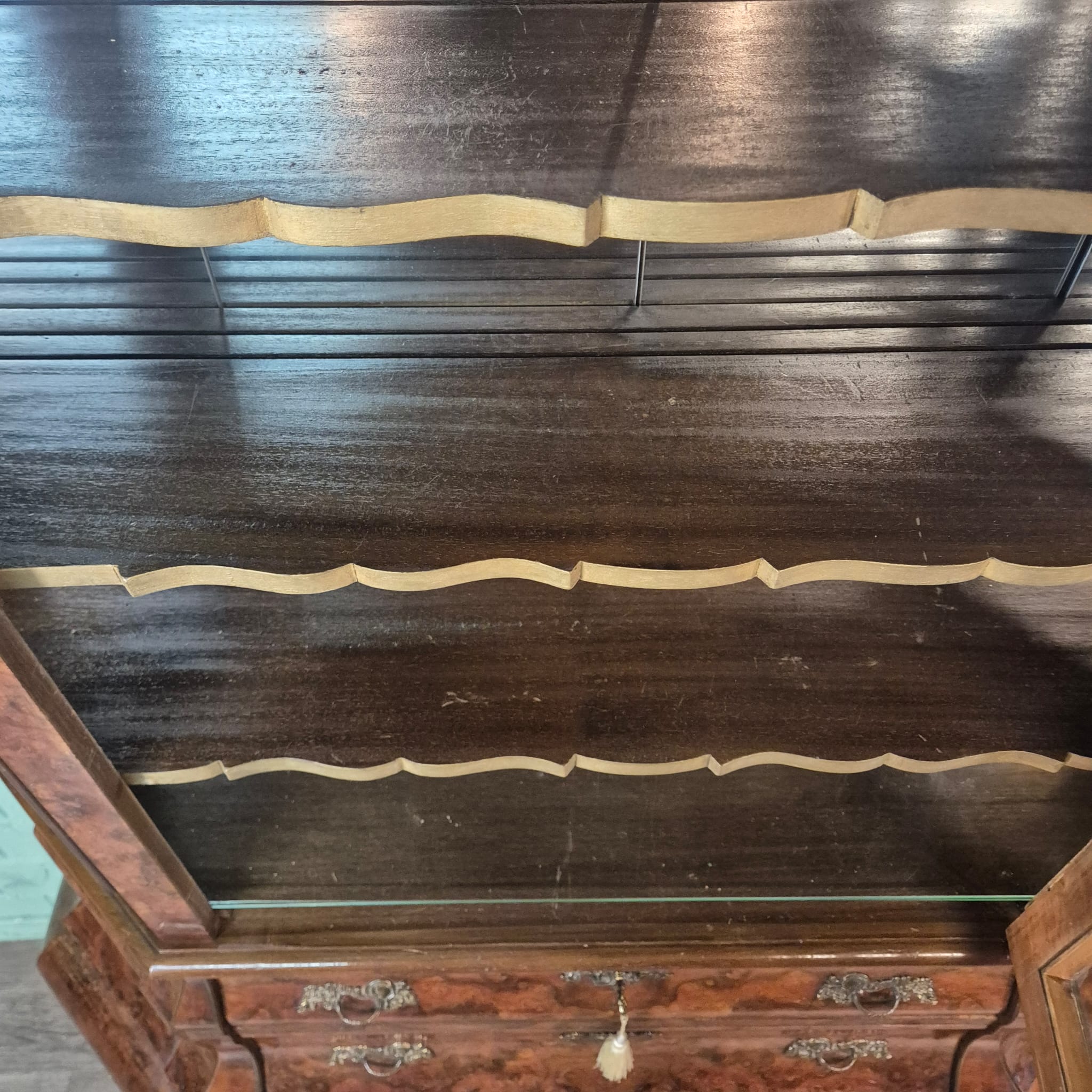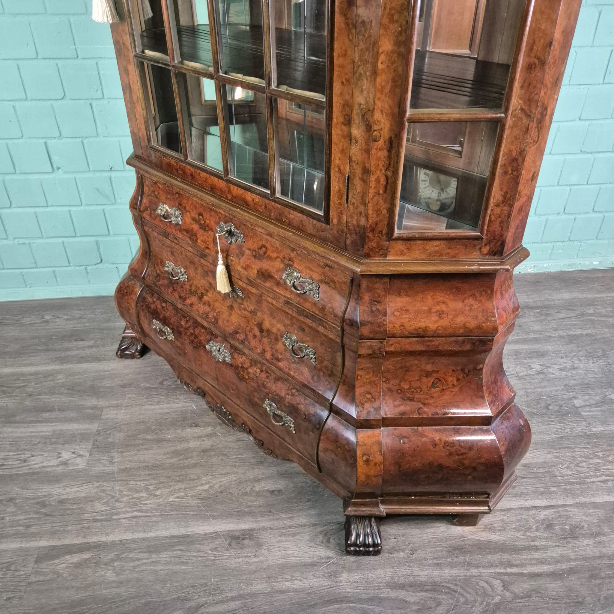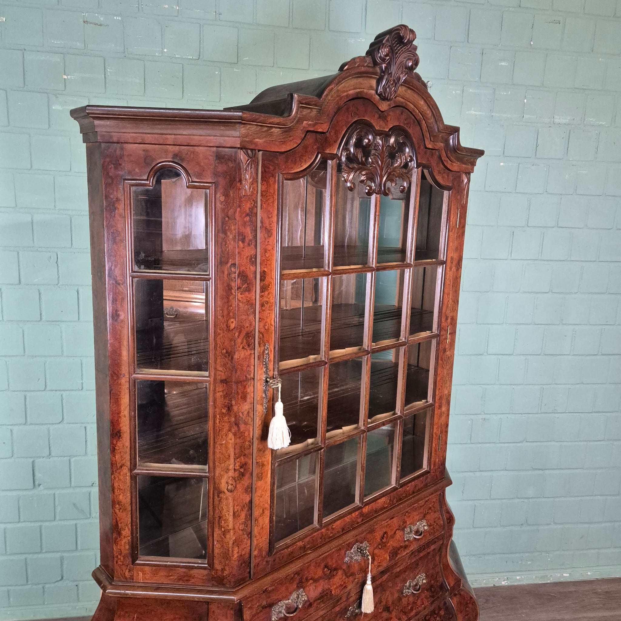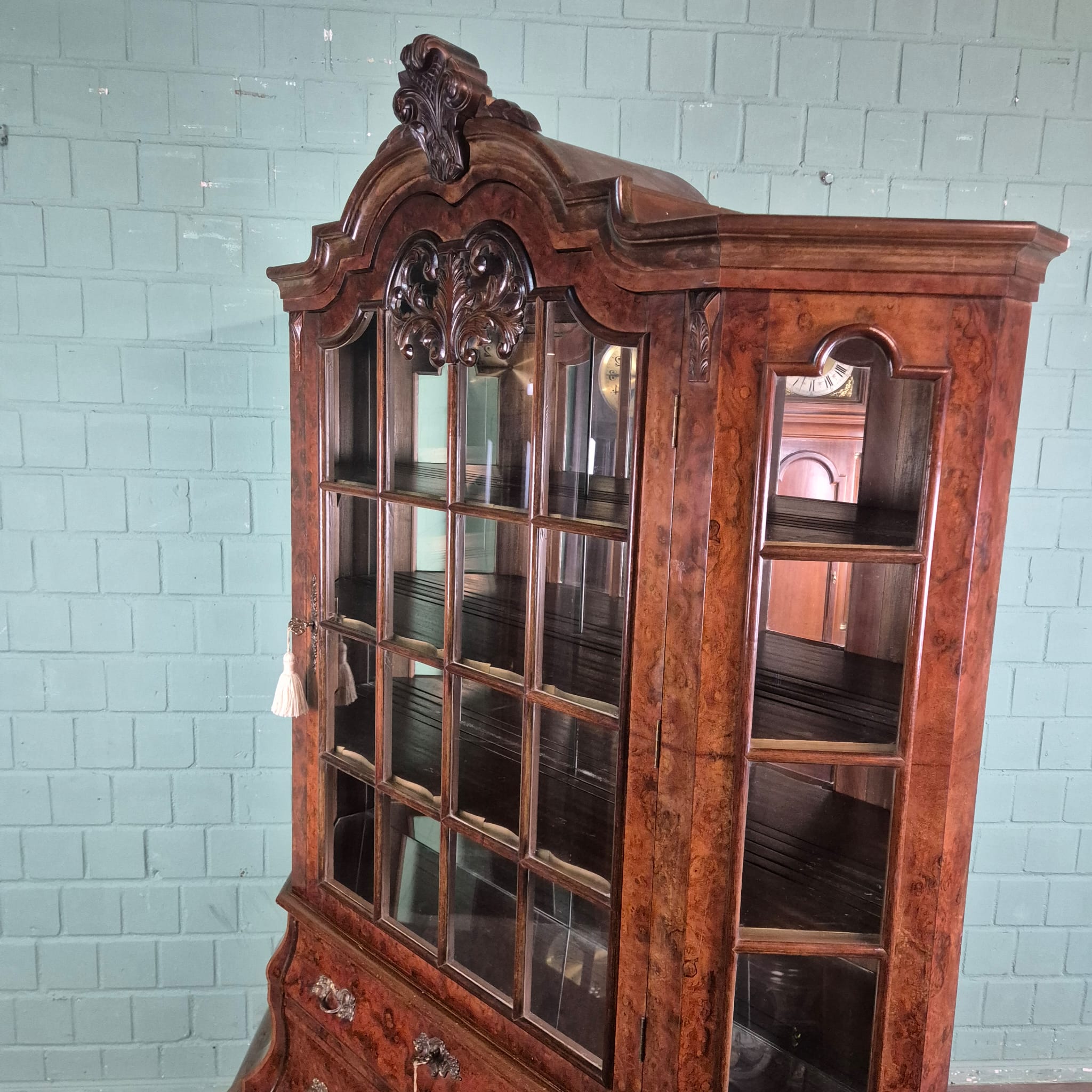 Stilvolle Neubarock Vitrine in Nussbaum furniert und lackiert von ca. 1970. Der dreiseitig verglaste Schrank befindet sich in einem guten Zustand und weist nur leichte Gebrauchsspuren auf. Zerlegbar (2-teilig).