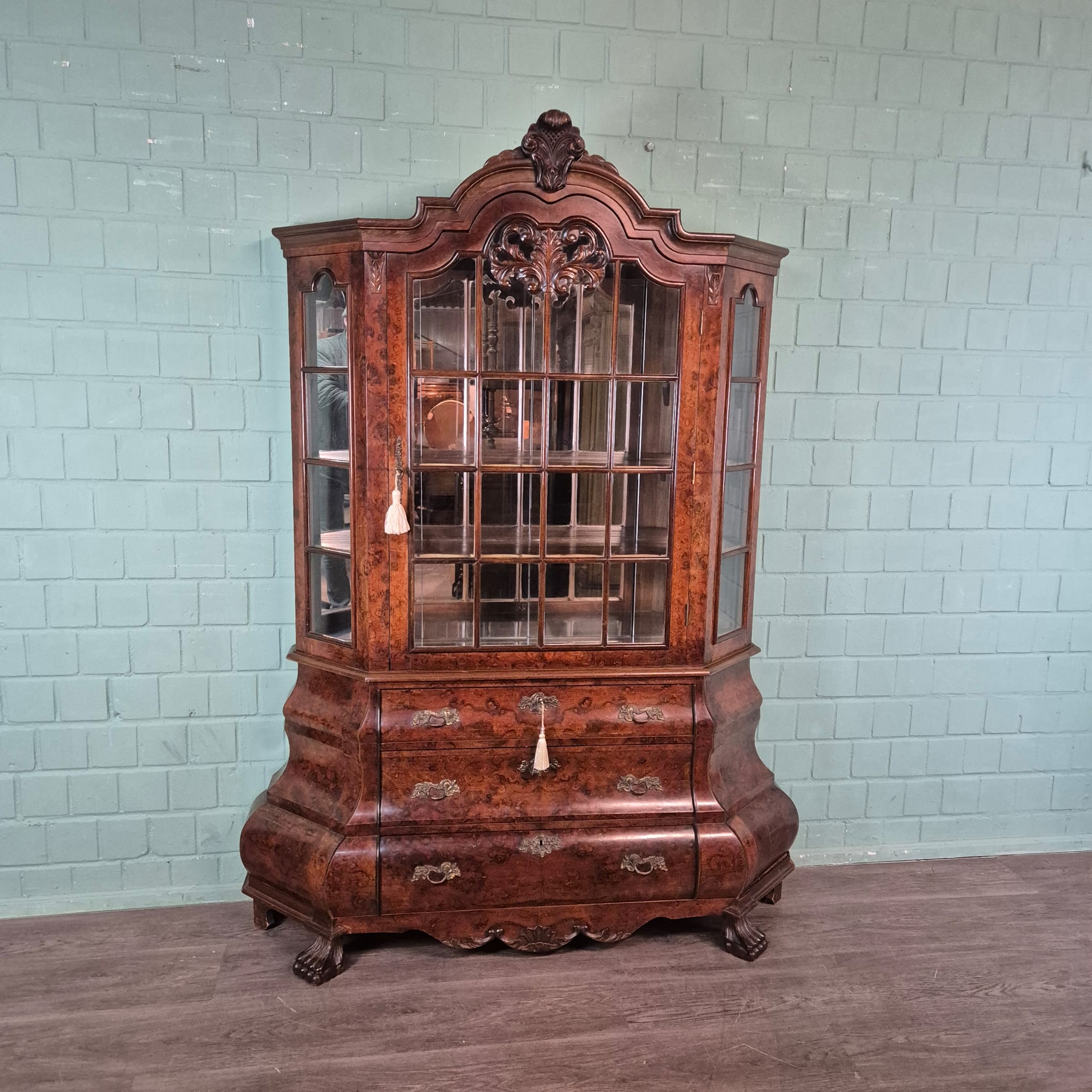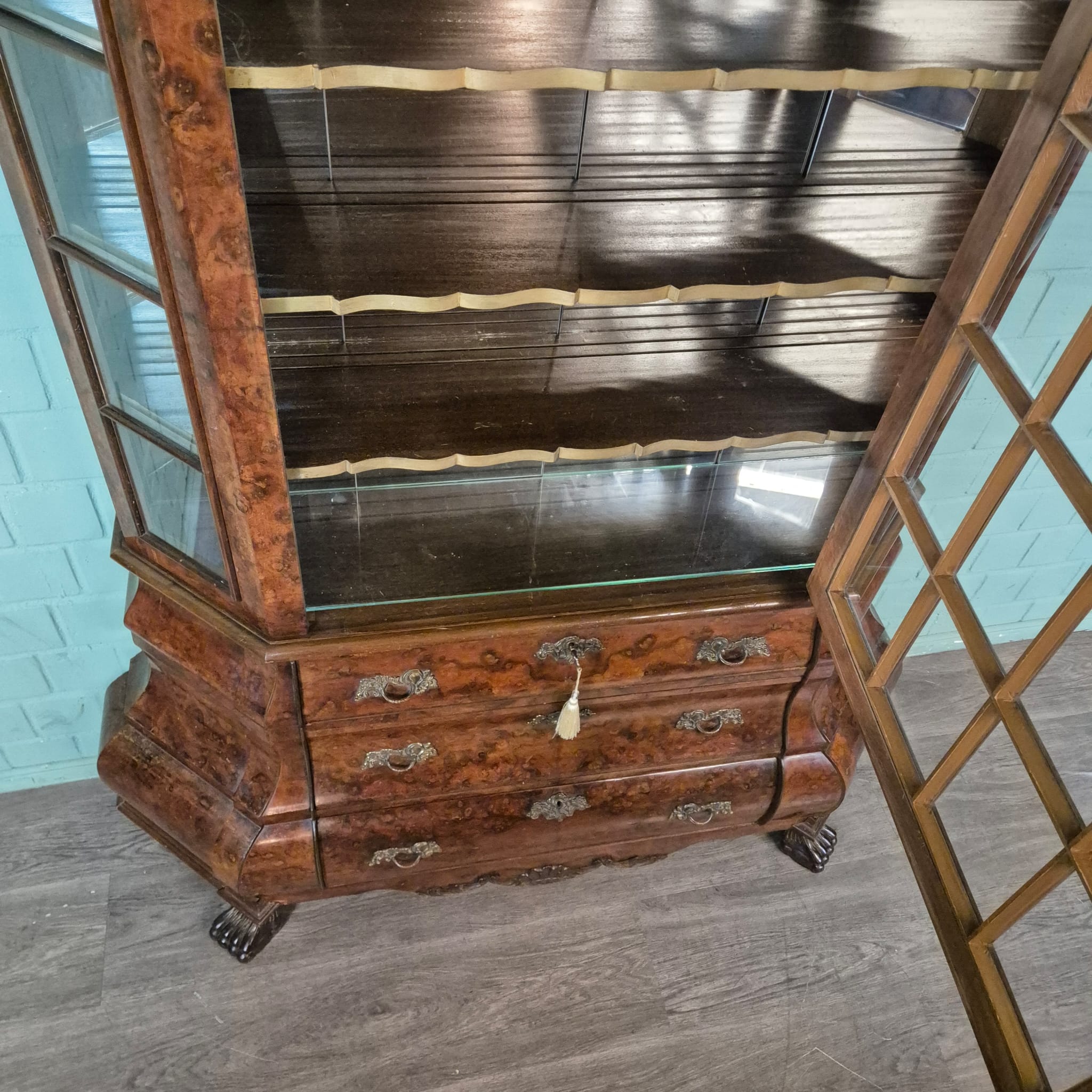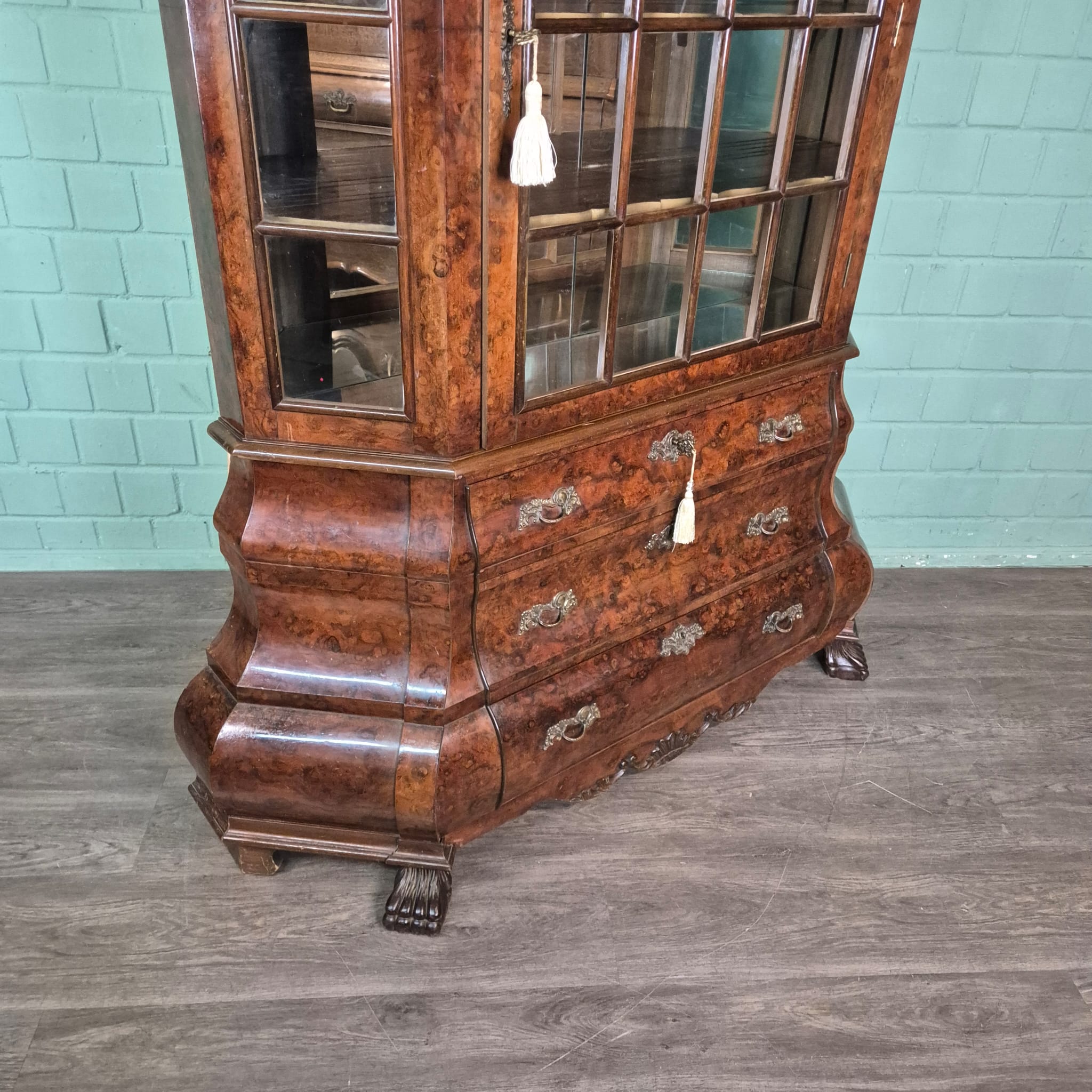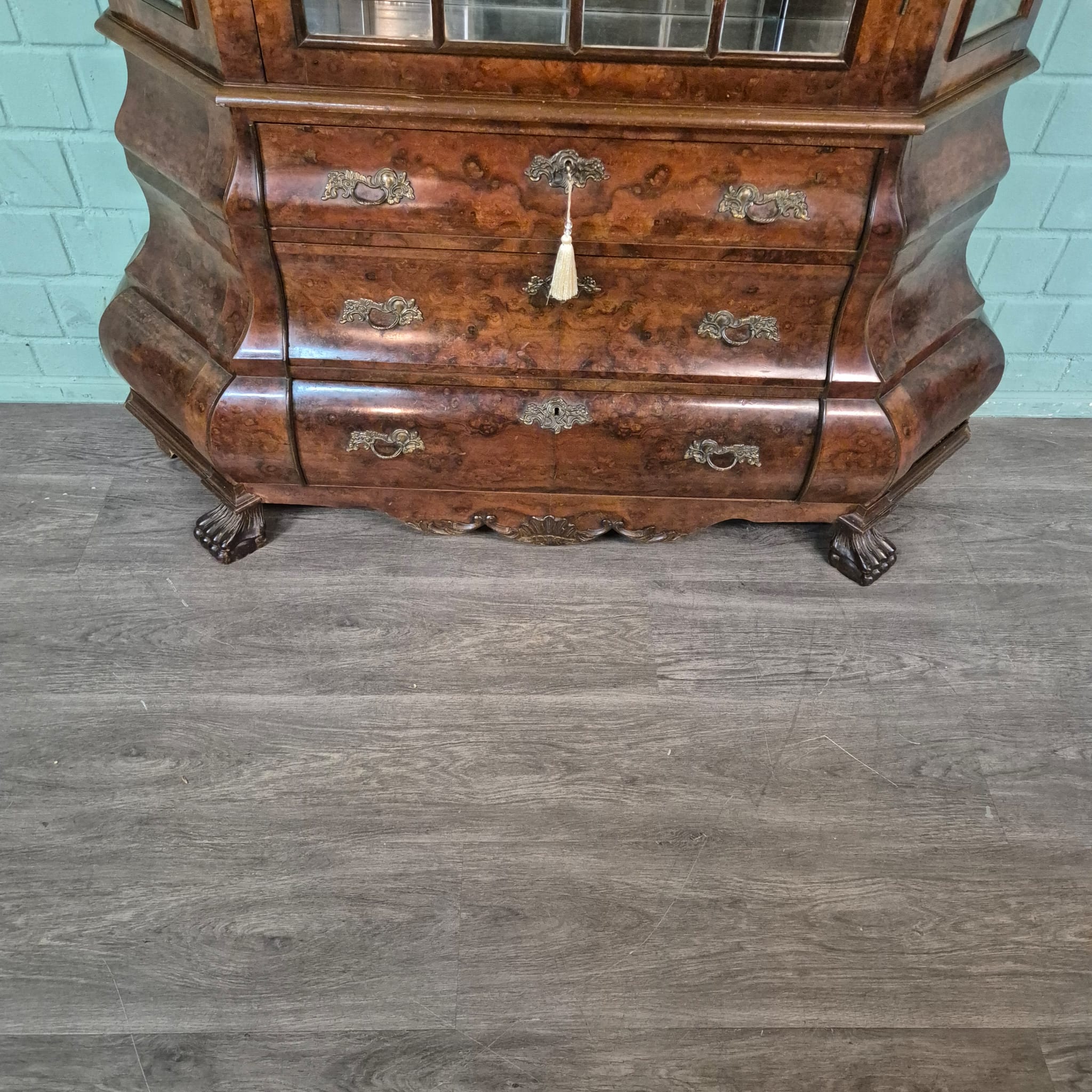 Stilvolle Neubarock Vitrine in Nussbaum furniert und lackiert von ca. 1970. Der dreiseitig verglaste Schrank befindet sich in einem guten Zustand und weist nur leichte Gebrauchsspuren auf. Zerlegbar (2-teilig).