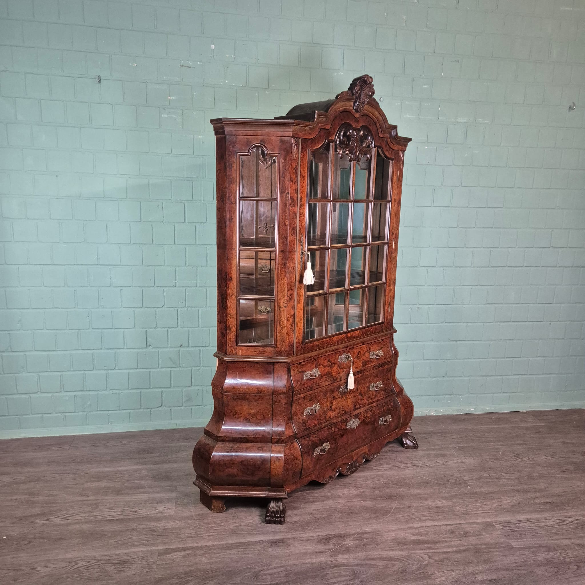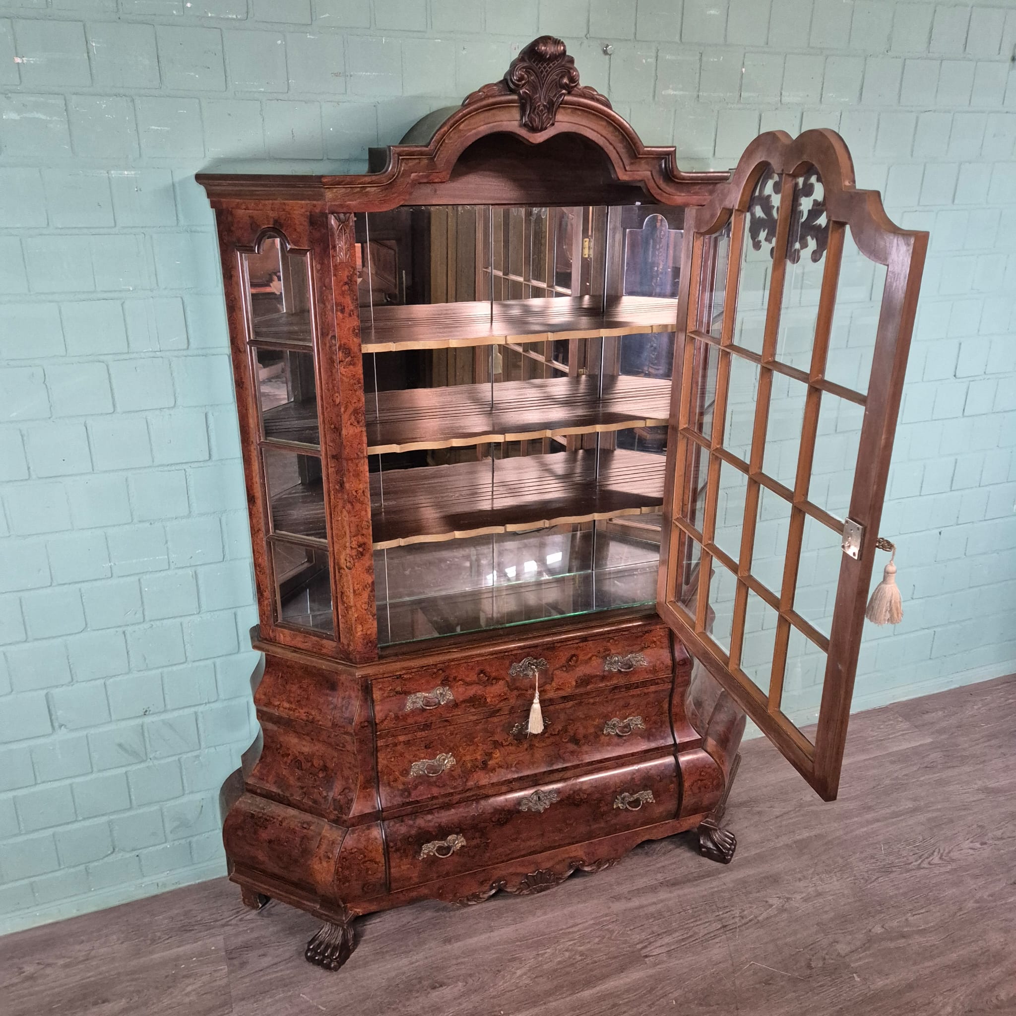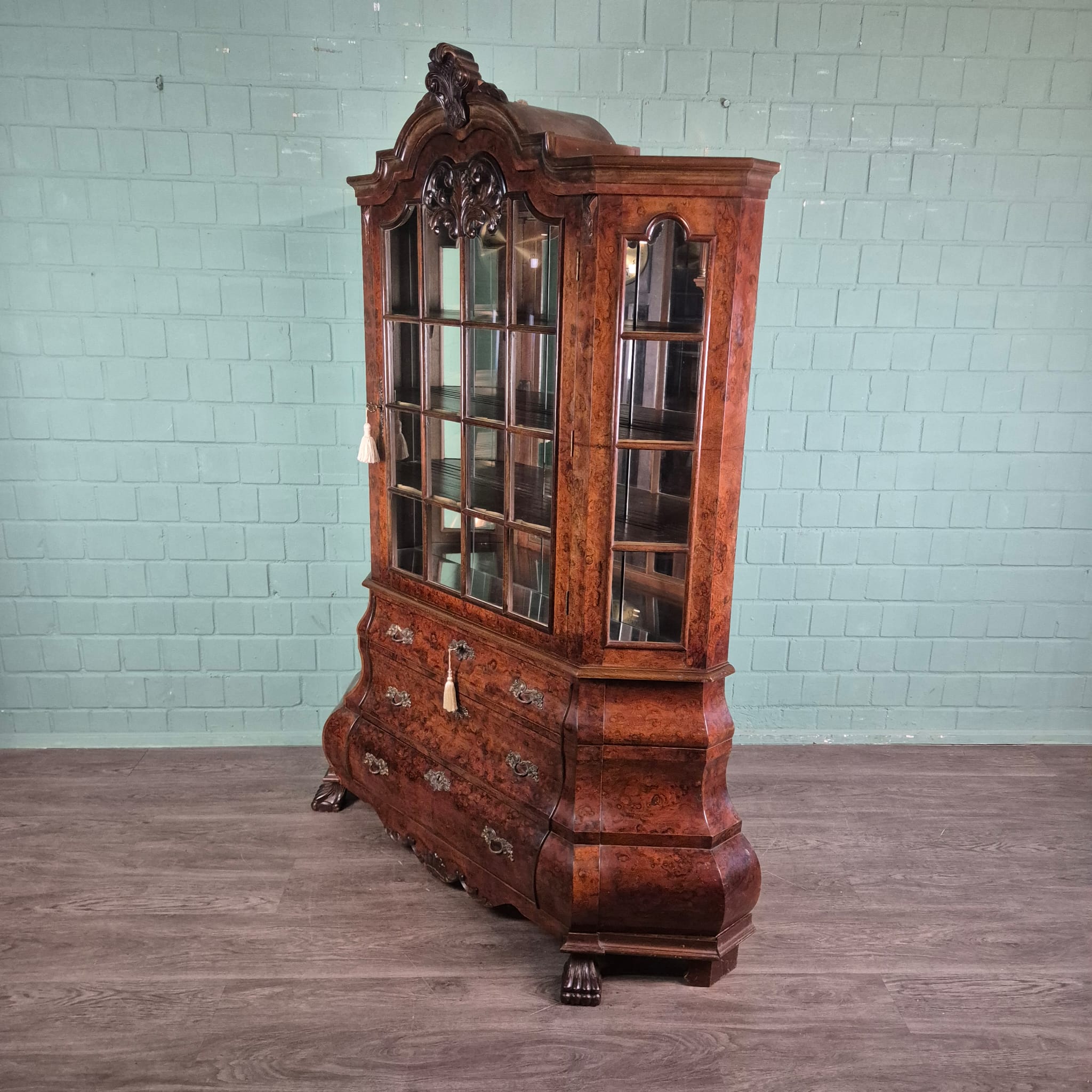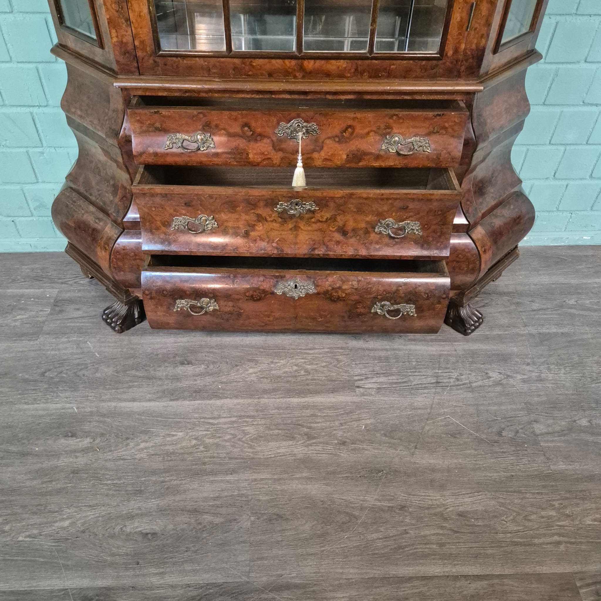 Stilvolle Neubarock Vitrine in Nussbaum furniert und lackiert von ca. 1970. Der dreiseitig verglaste Schrank befindet sich in einem guten Zustand und weist nur leichte Gebrauchsspuren auf. Zerlegbar (2-teilig).