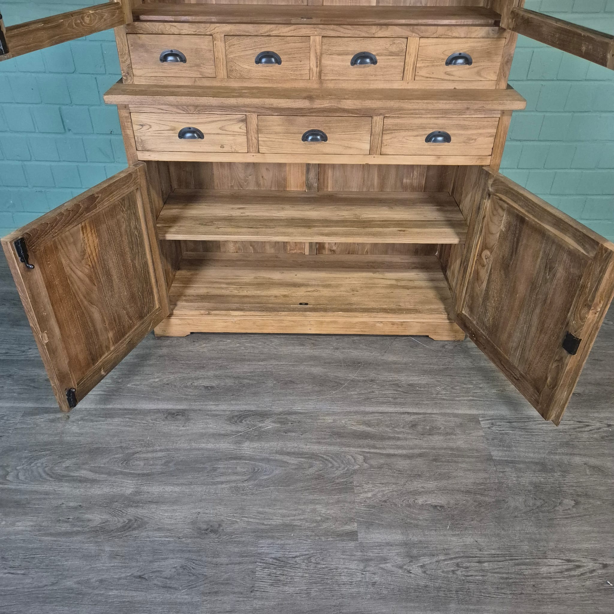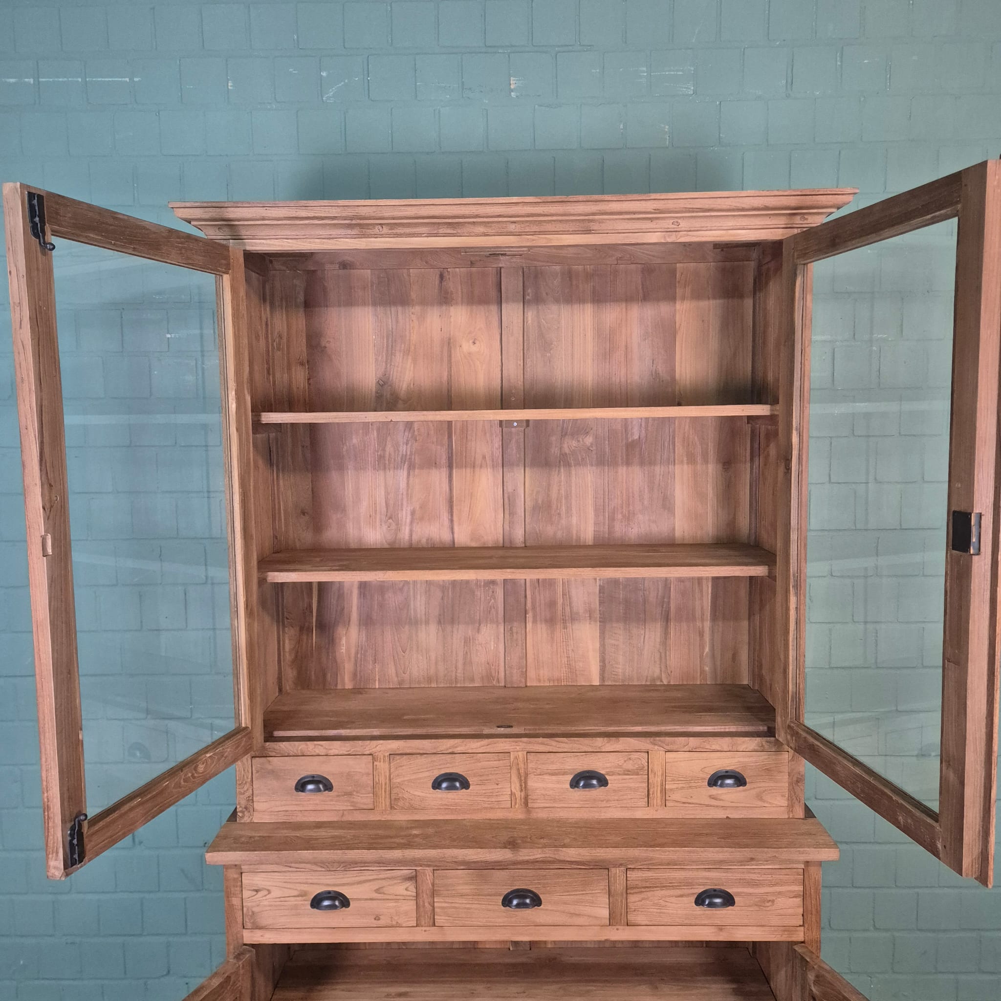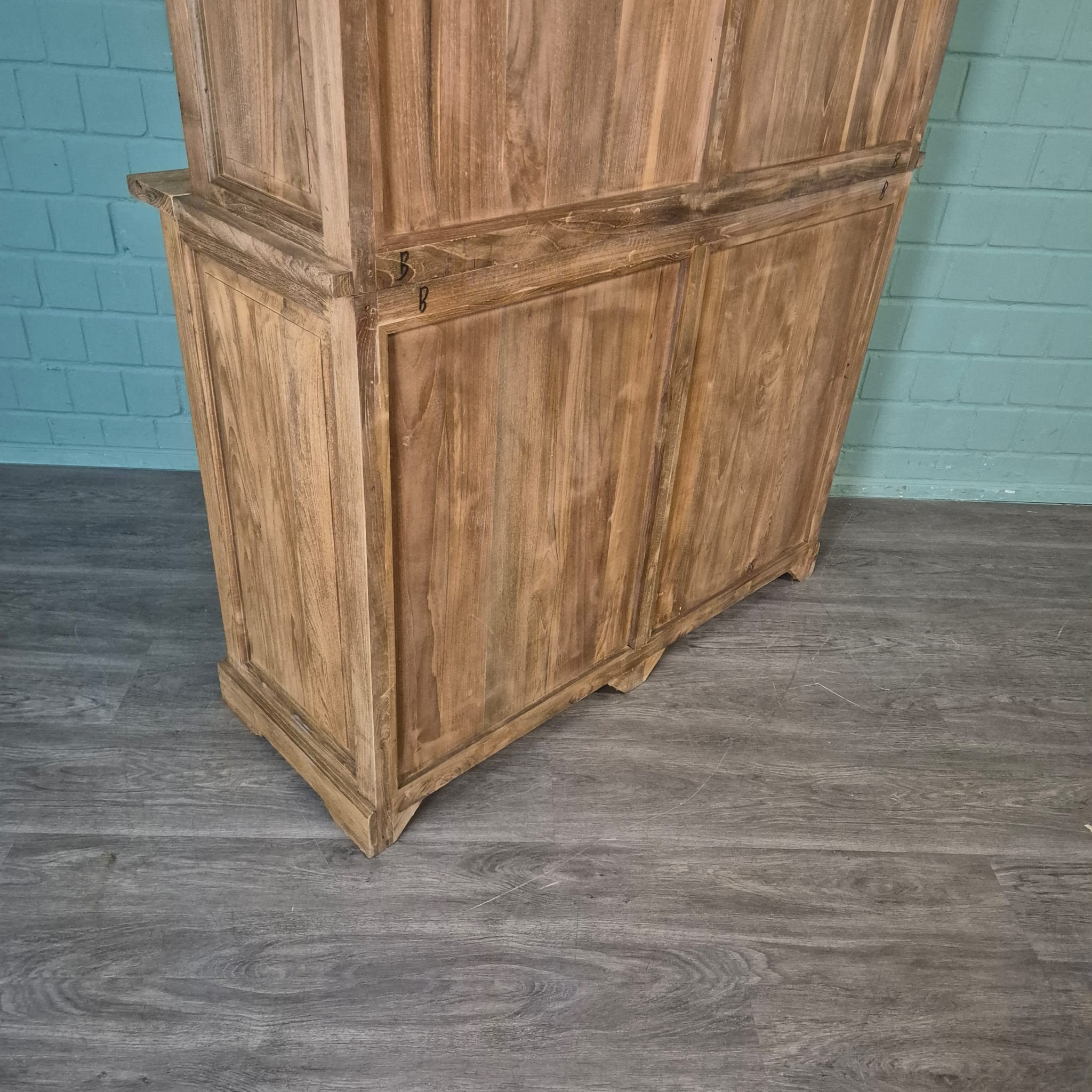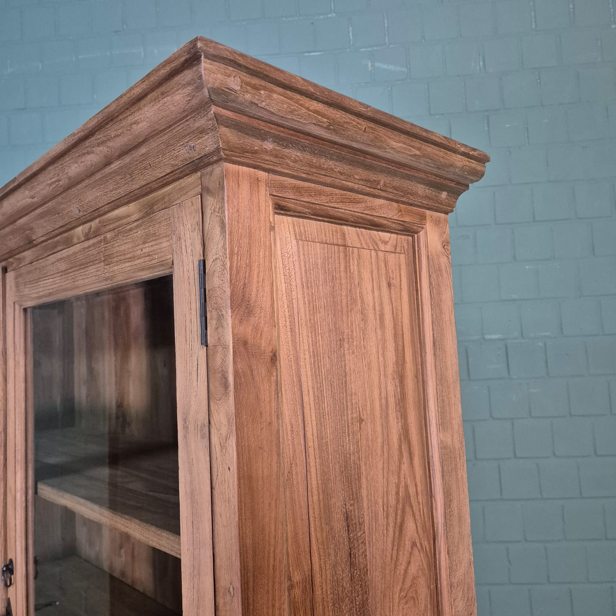Dieser aufwendig gestaltete Schrank aus massiv Teakholz erhält seine besondere Wirkung durch natürliche Unregelmäßigkeiten im Holz. Diese entstehen durch das verwendete Edelholz mit seinen verschiedenen Strukturen, welche diesem Stück einen eigentümlichen Charakter verleihen und es zu einem Unikat machen. Machart und Farbton des Holzes tragen sehr zum optischen Wert dieses Möbels bei, das sowohl dekorative Möglichkeiten als auch genügend Stauraum bietet. Zerlegbar (2-teilig).
