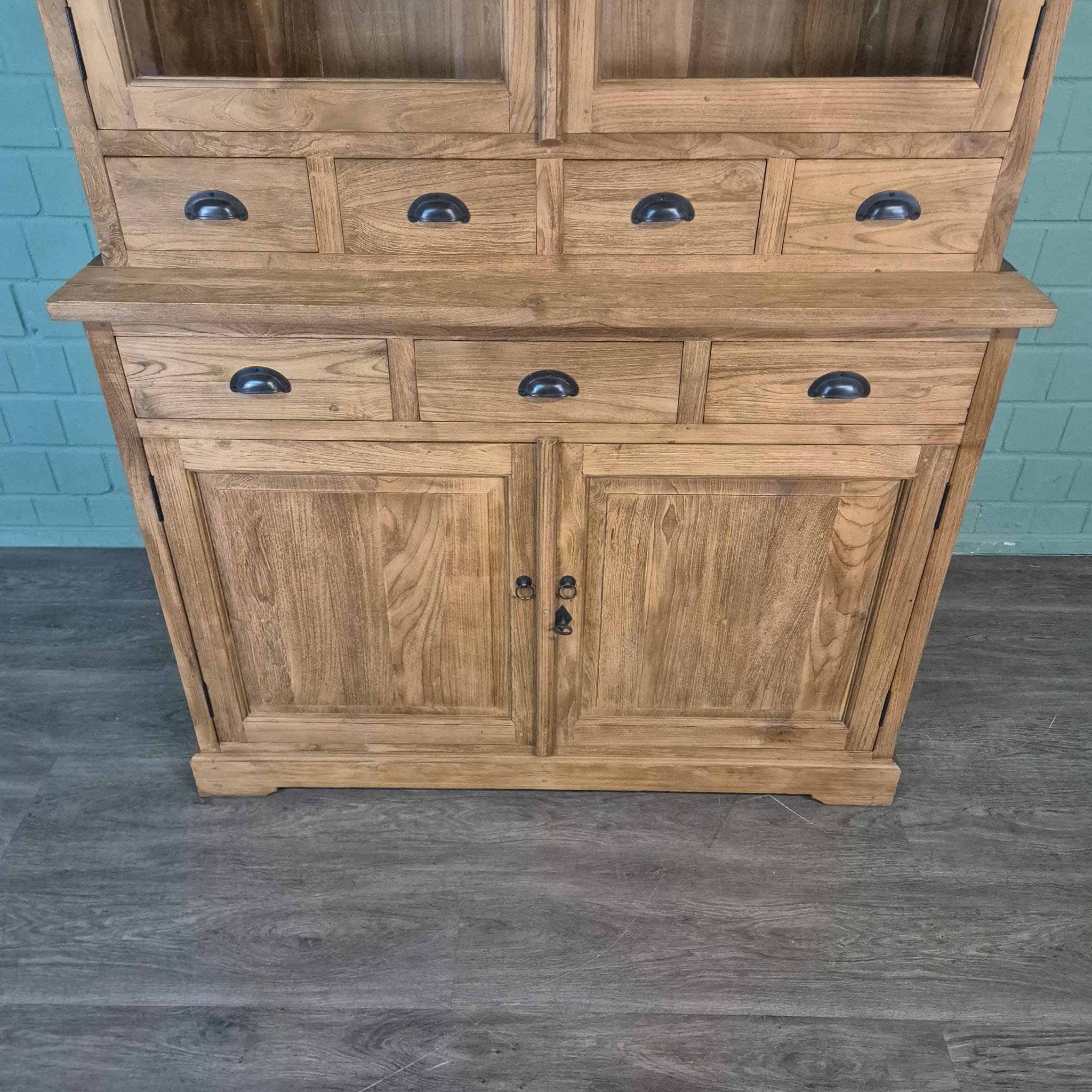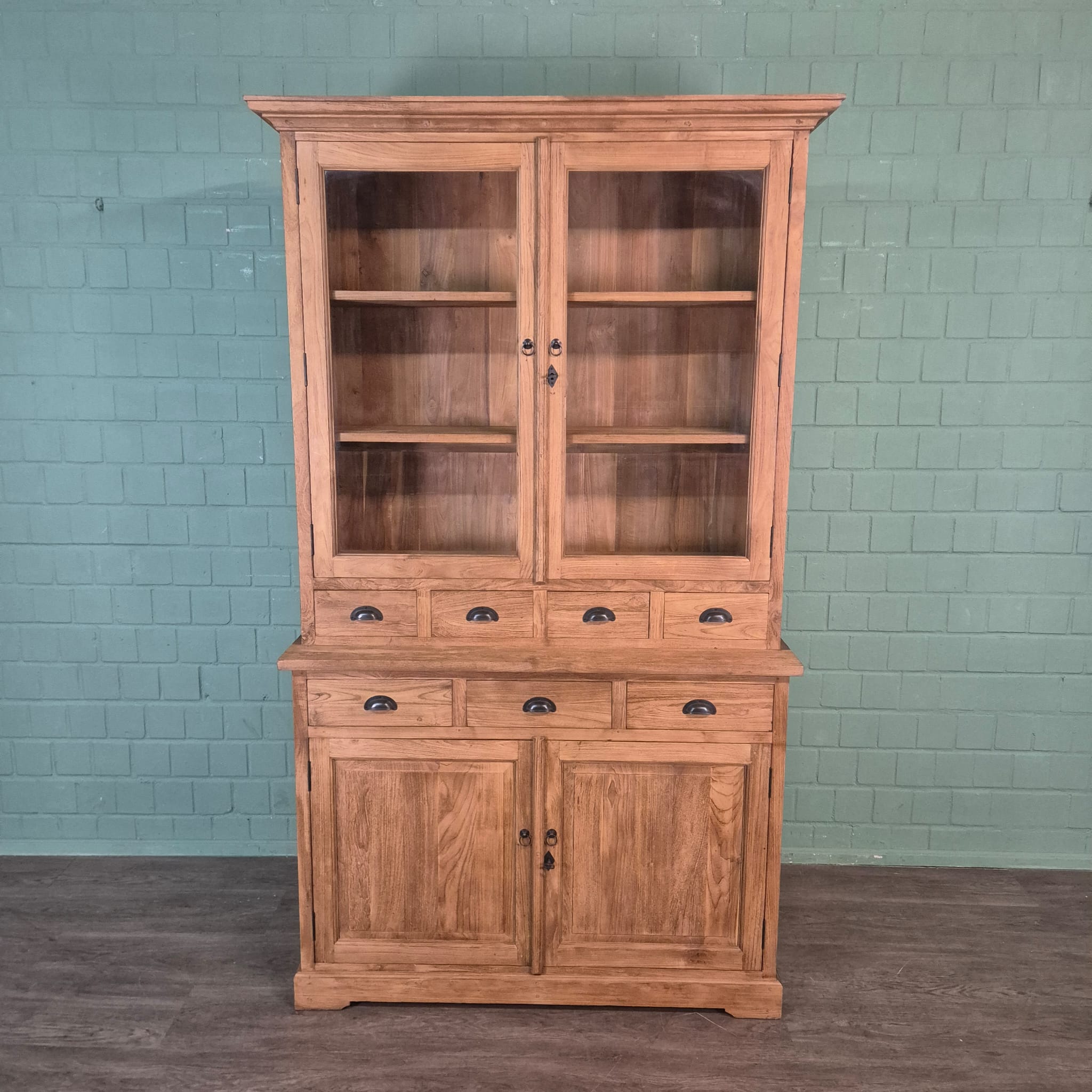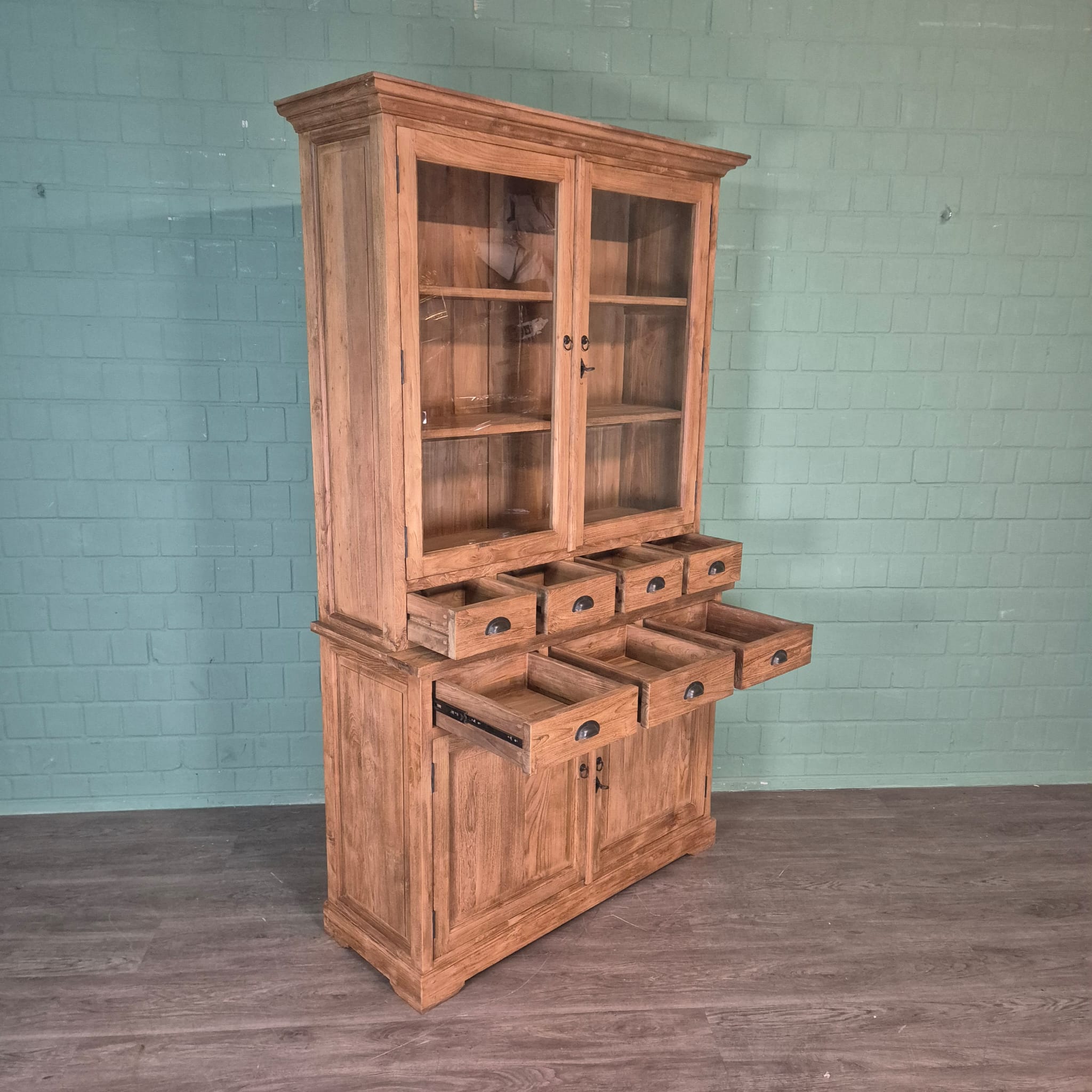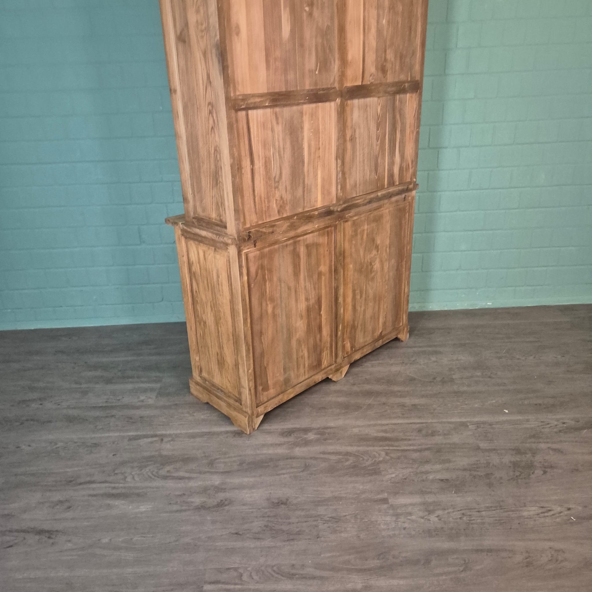 Dieser aufwendig gestaltete Schrank aus massiv Teakholz erhält seine besondere Wirkung durch natürliche Unregelmäßigkeiten im Holz. Diese entstehen durch das verwendete Edelholz mit seinen verschiedenen Strukturen, welche diesem Stück einen eigentümlichen Charakter verleihen und es zu einem Unikat machen. Machart und Farbton des Holzes tragen sehr zum optischen Wert dieses Möbels bei, das sowohl dekorative Möglichkeiten als auch genügend Stauraum bietet. Zerlegbar (2-teilig).