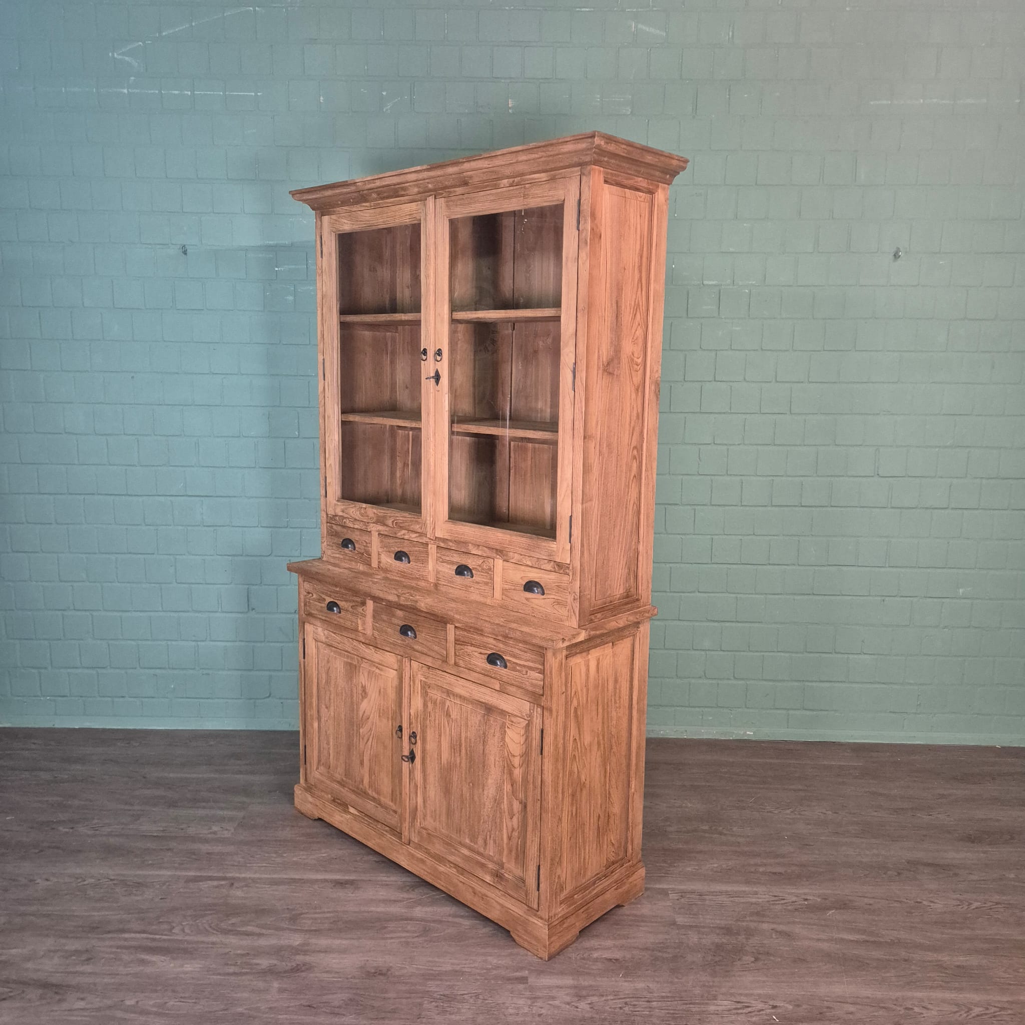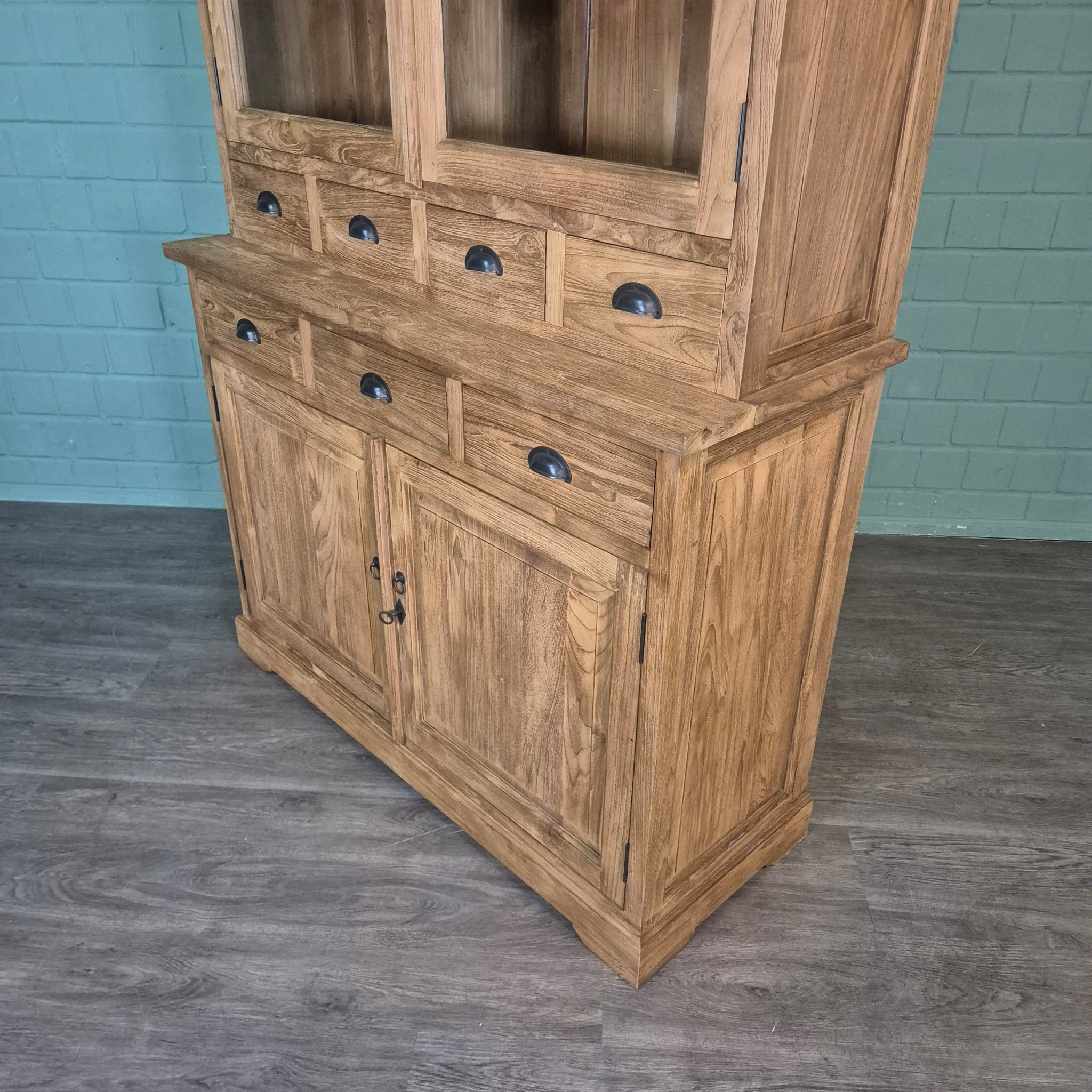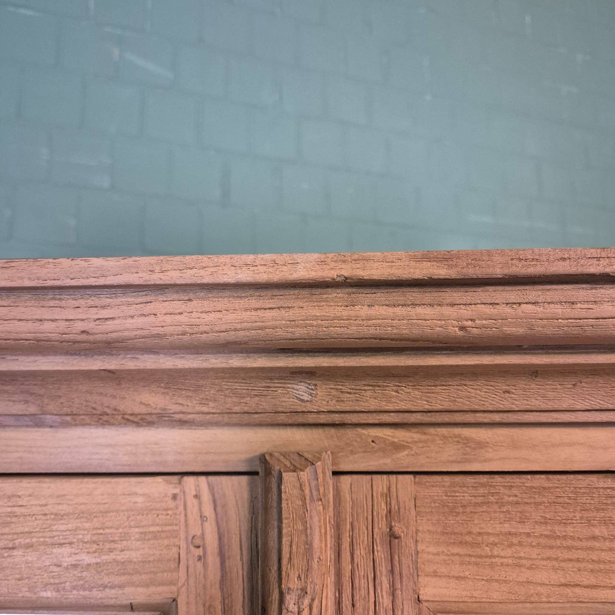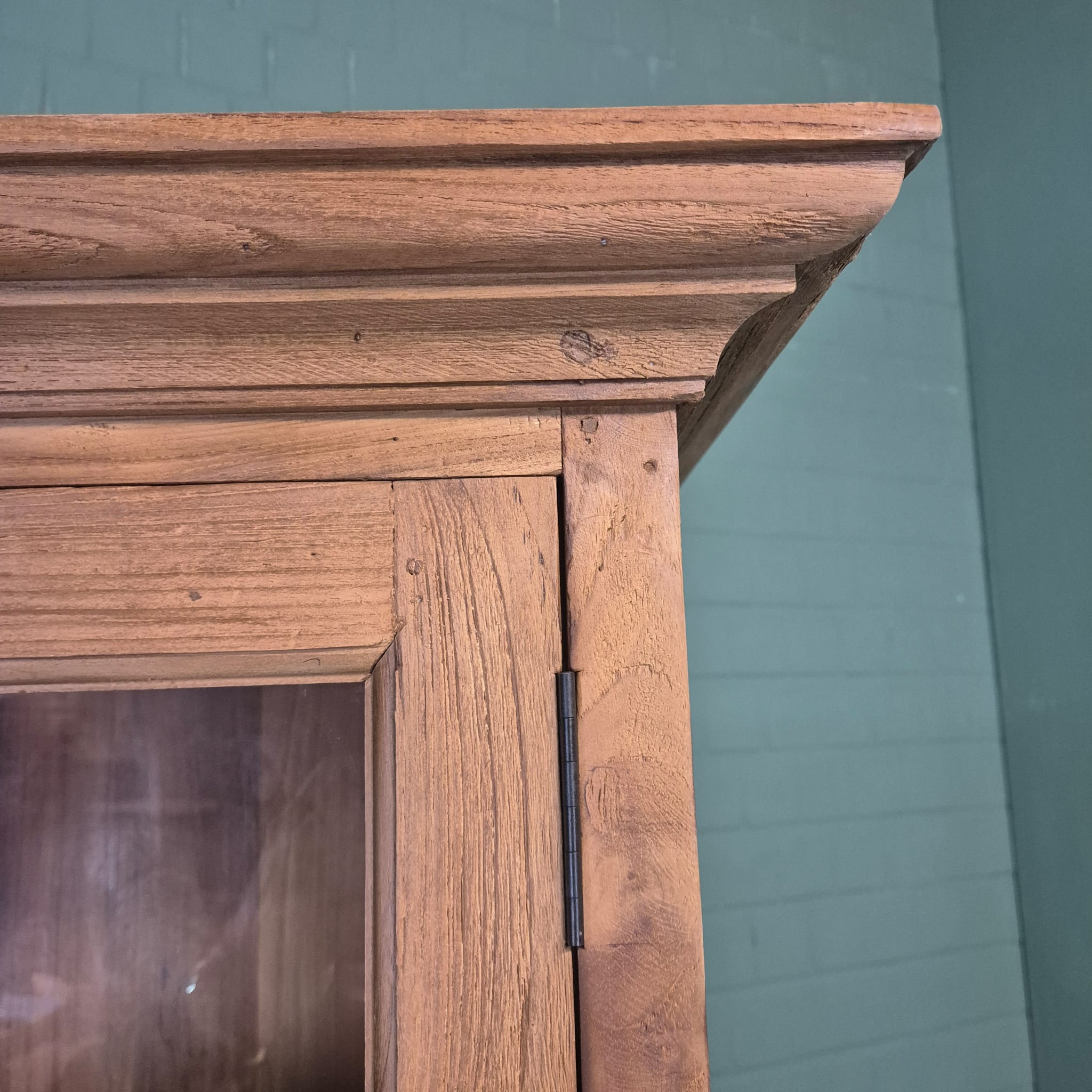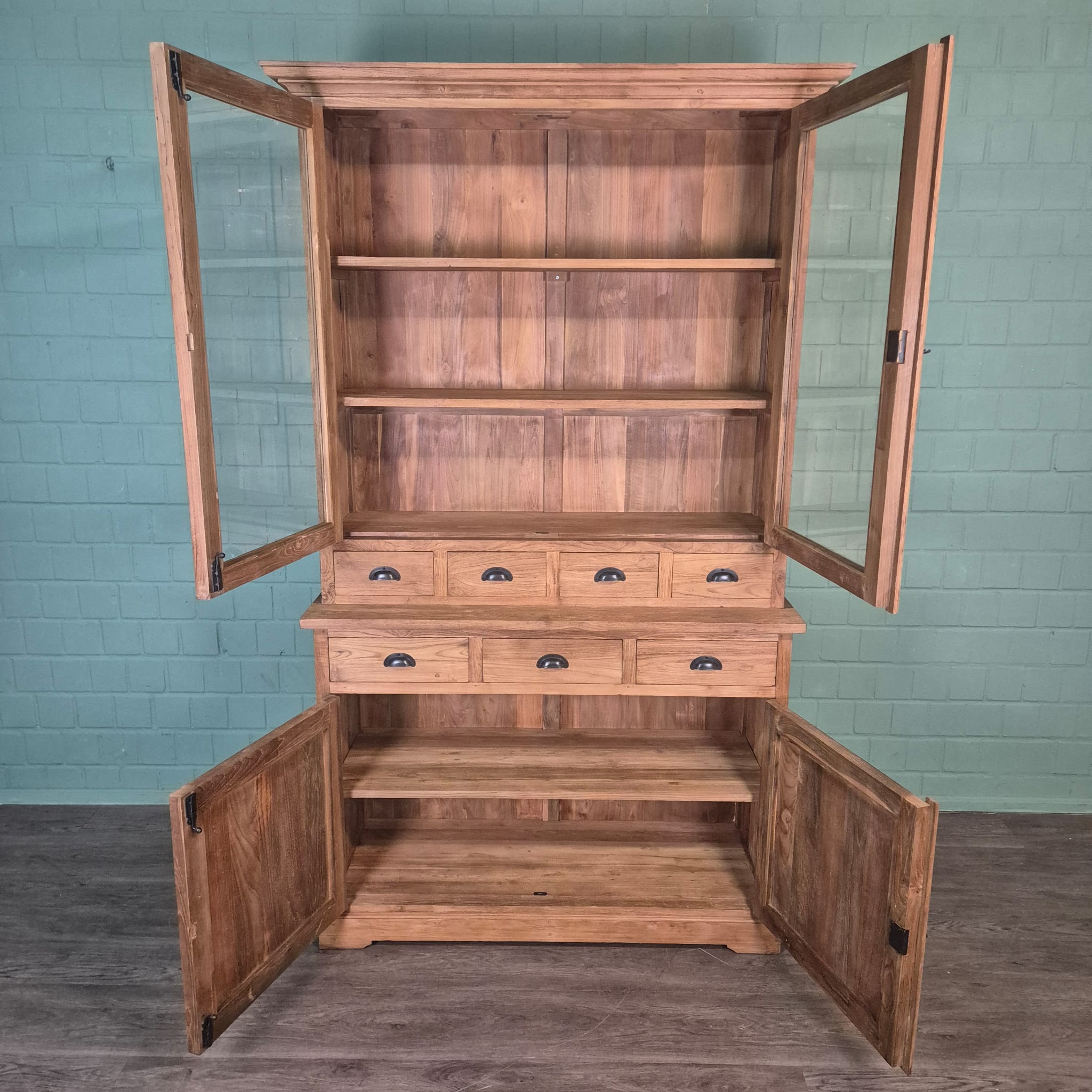 Dieser aufwendig gestaltete Schrank aus massiv Teakholz erhält seine besondere Wirkung durch natürliche Unregelmäßigkeiten im Holz. Diese entstehen durch das verwendete Edelholz mit seinen verschiedenen Strukturen, welche diesem Stück einen eigentümlichen Charakter verleihen und es zu einem Unikat machen. Machart und Farbton des Holzes tragen sehr zum optischen Wert dieses Möbels bei, das sowohl dekorative Möglichkeiten als auch genügend Stauraum bietet. Zerlegbar (2-teilig).