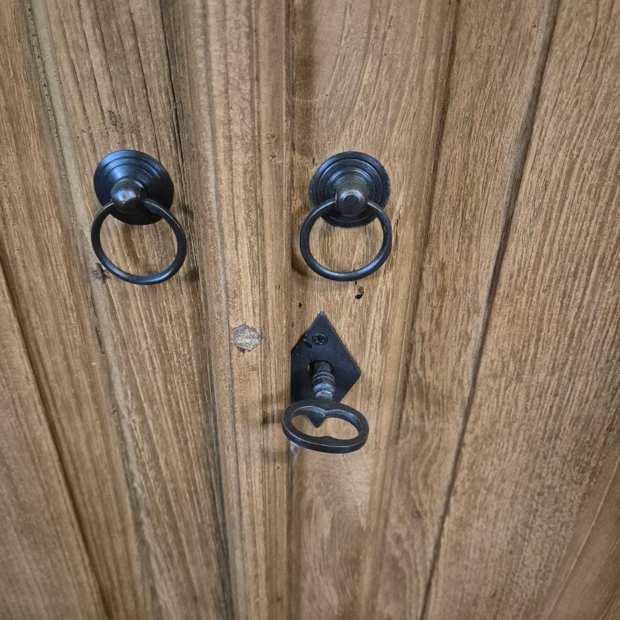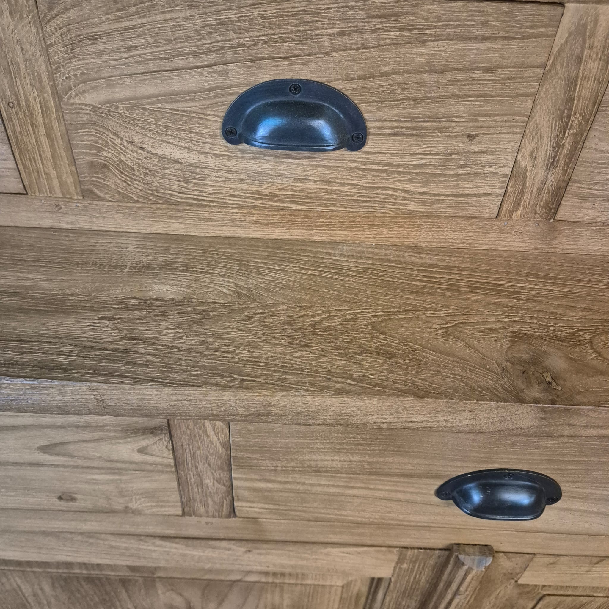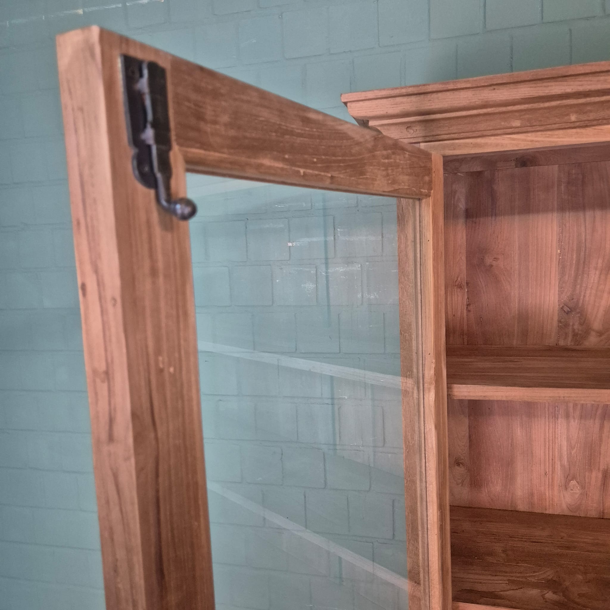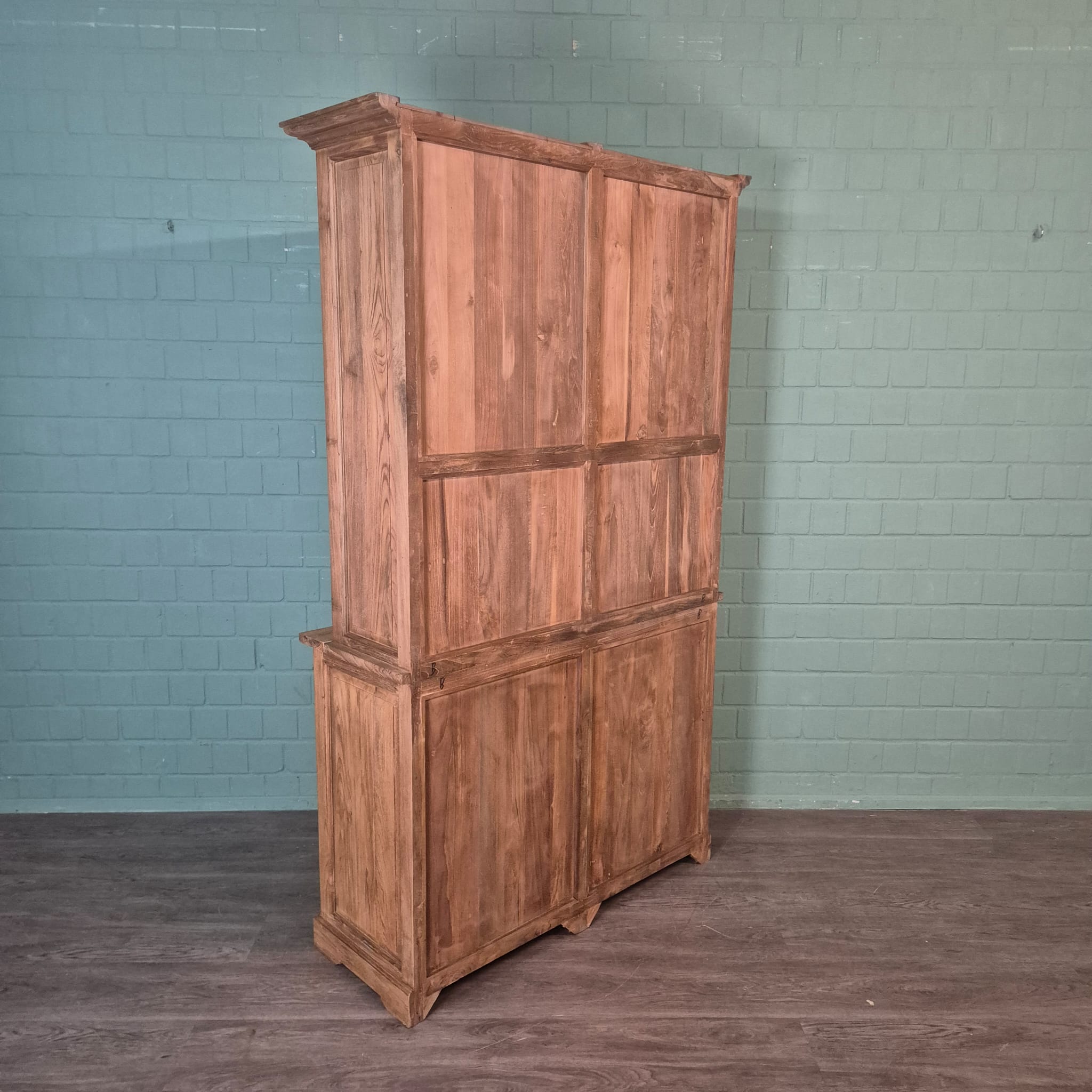 Dieser aufwendig gestaltete Schrank aus massiv Teakholz erhält seine besondere Wirkung durch natürliche Unregelmäßigkeiten im Holz. Diese entstehen durch das verwendete Edelholz mit seinen verschiedenen Strukturen, welche diesem Stück einen eigentümlichen Charakter verleihen und es zu einem Unikat machen. Machart und Farbton des Holzes tragen sehr zum optischen Wert dieses Möbels bei, das sowohl dekorative Möglichkeiten als auch genügend Stauraum bietet. Zerlegbar (2-teilig).