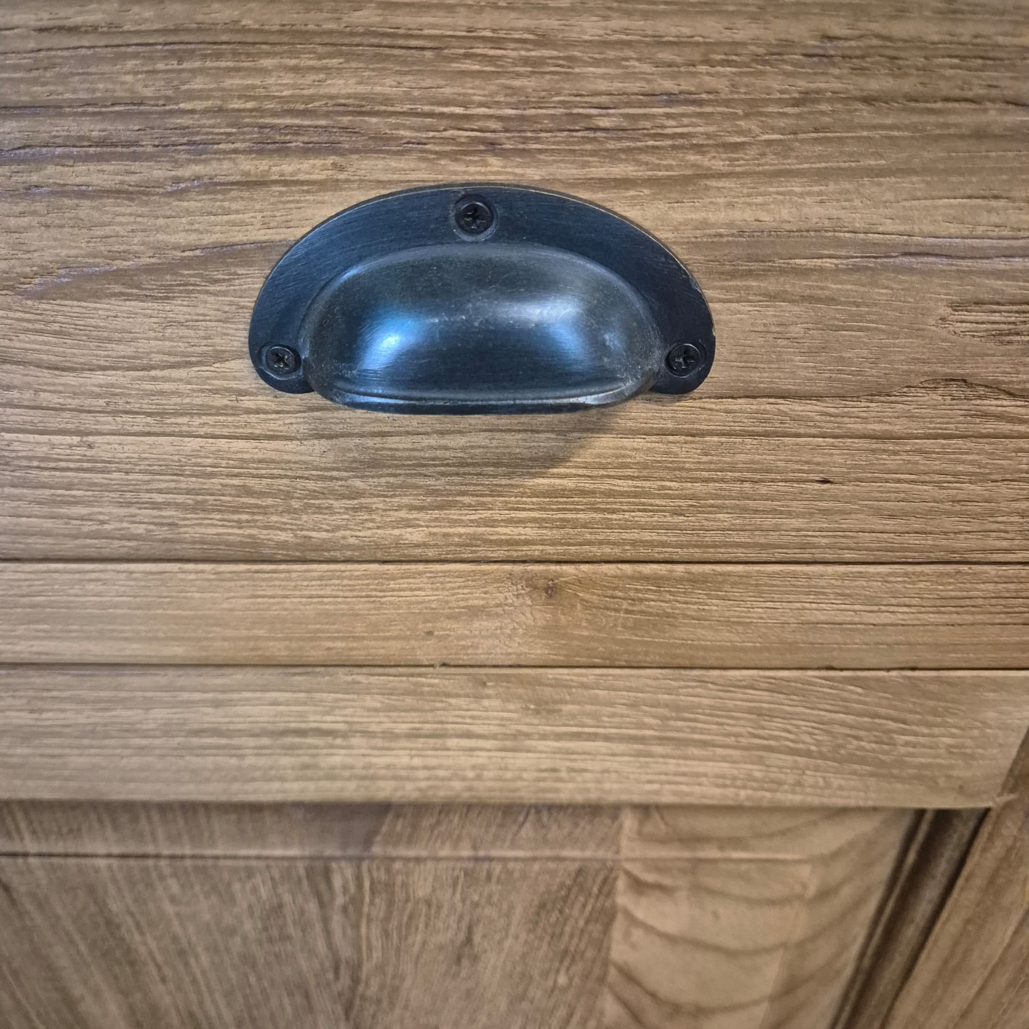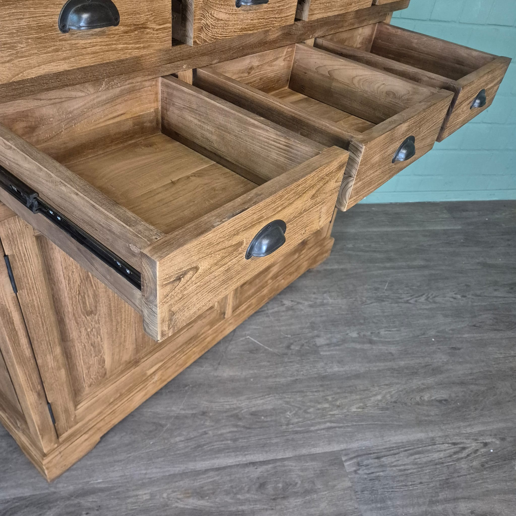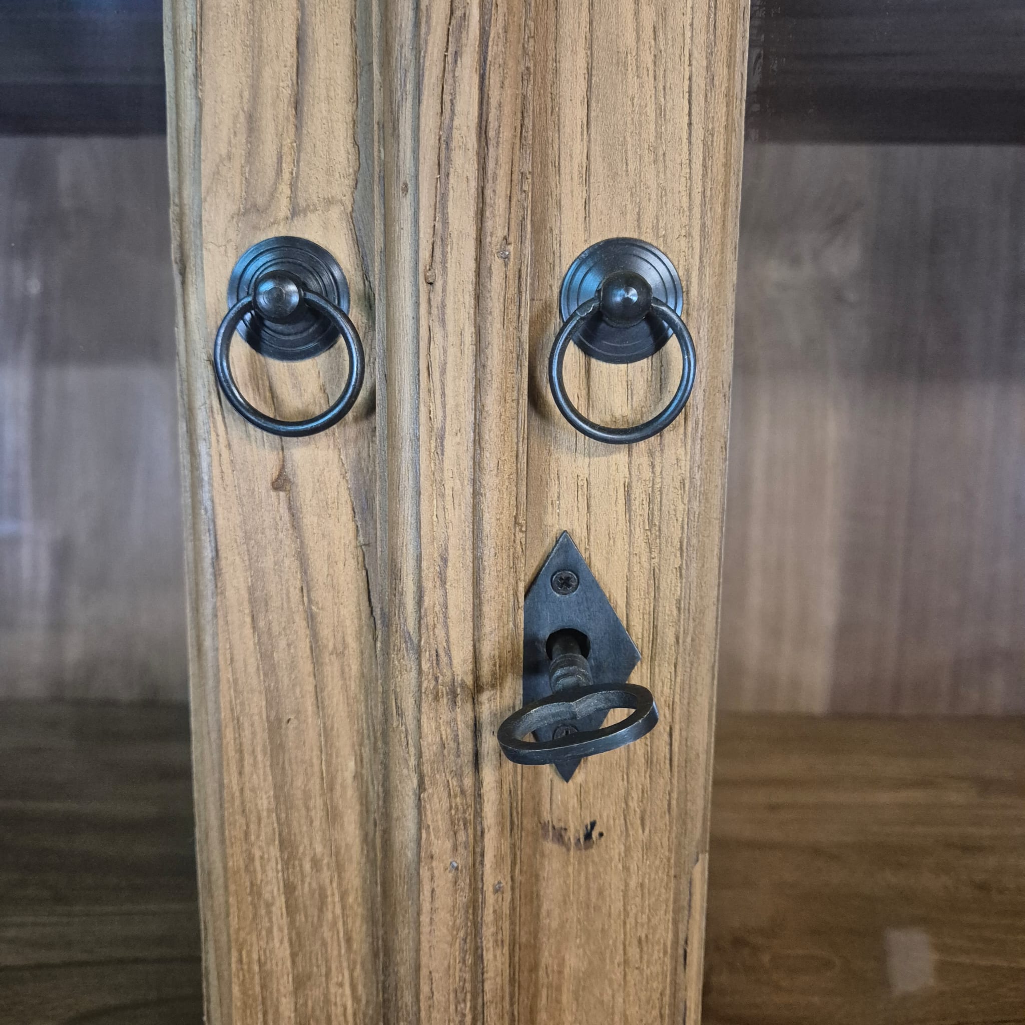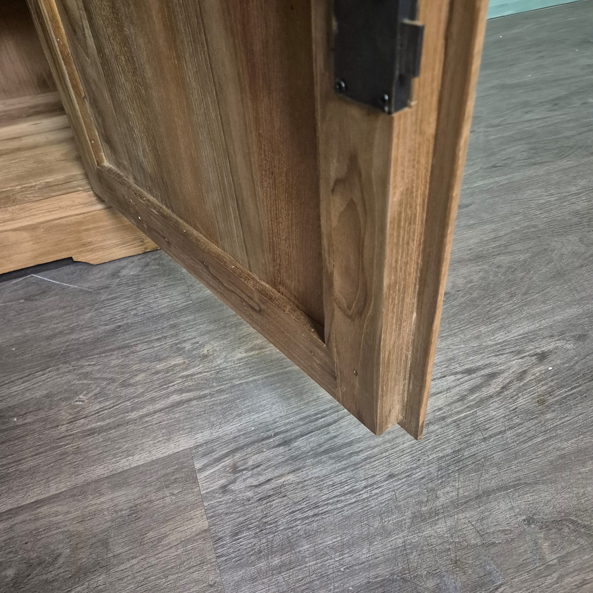 Dieser aufwendig gestaltete Schrank aus massiv Teakholz erhält seine besondere Wirkung durch natürliche Unregelmäßigkeiten im Holz. Diese entstehen durch das verwendete Edelholz mit seinen verschiedenen Strukturen, welche diesem Stück einen eigentümlichen Charakter verleihen und es zu einem Unikat machen. Machart und Farbton des Holzes tragen sehr zum optischen Wert dieses Möbels bei, das sowohl dekorative Möglichkeiten als auch genügend Stauraum bietet. Zerlegbar (2-teilig).