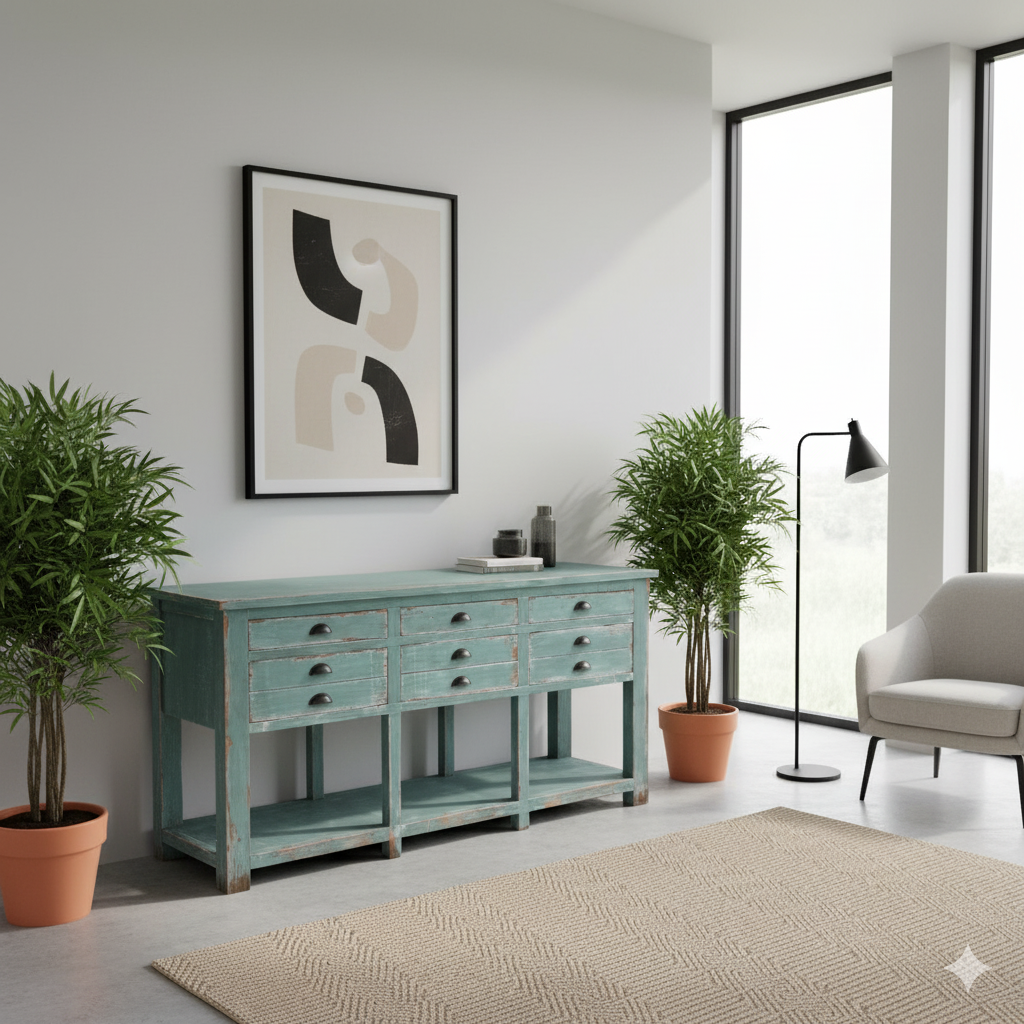 Dieses aufwendig gestaltete Sideboard aus Massivholz (Shabby-Chic Optik) erhält seine besondere Wirkung durch natürliche Unregelmäßigkeiten im Holz. Diese entstehen durch das verwendete Massivholz mit seinen verschiedenen Strukturen, welche diesem Stück einen eigentümlichen Charakter verleihen und es zu einem Unikat machen. Machart und Farbton des Holzes tragen sehr zum optischen Wert dieses Möbels bei, das sowohl dekorative Möglichkeiten als auch genügend Stauraum bietet.