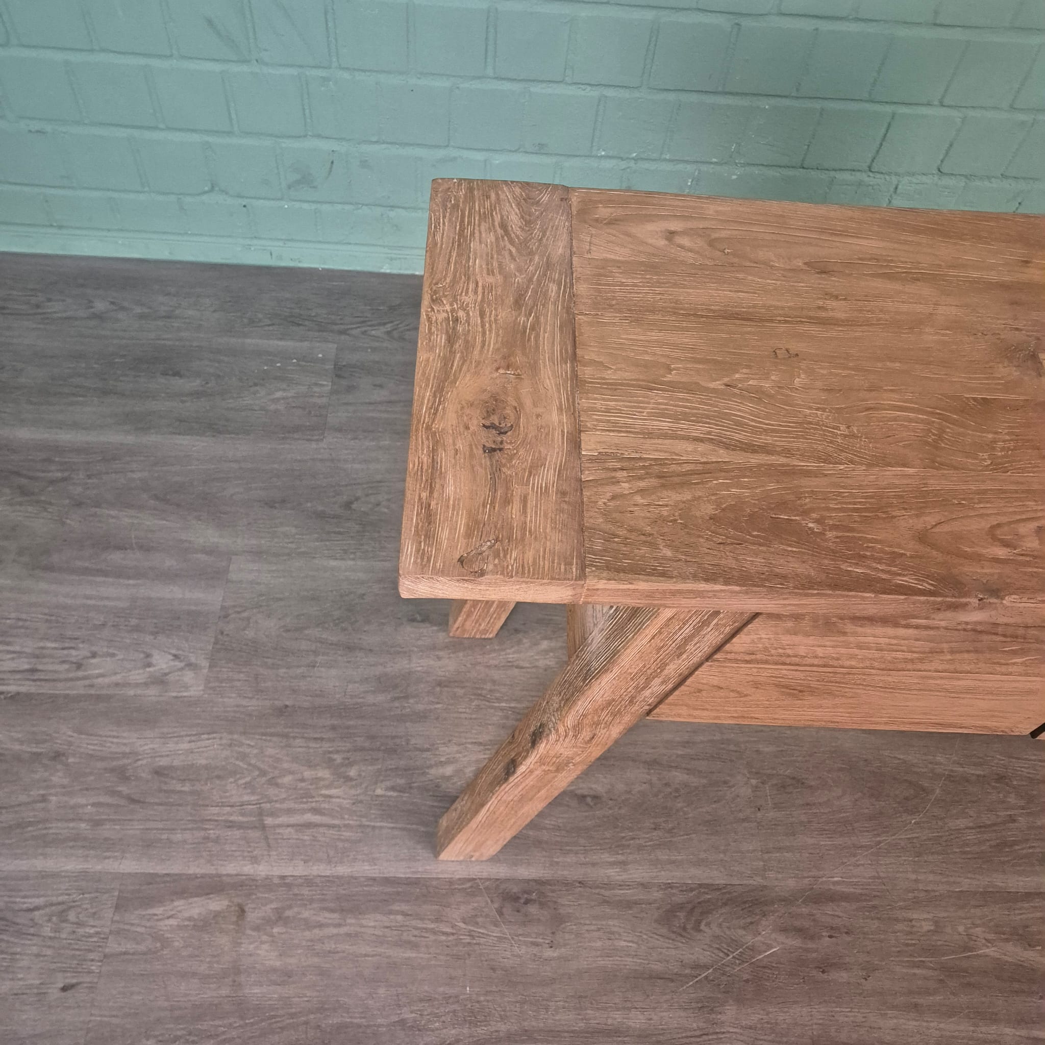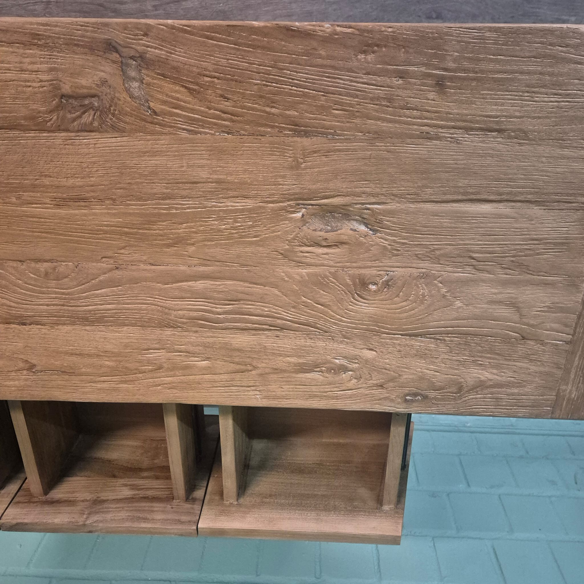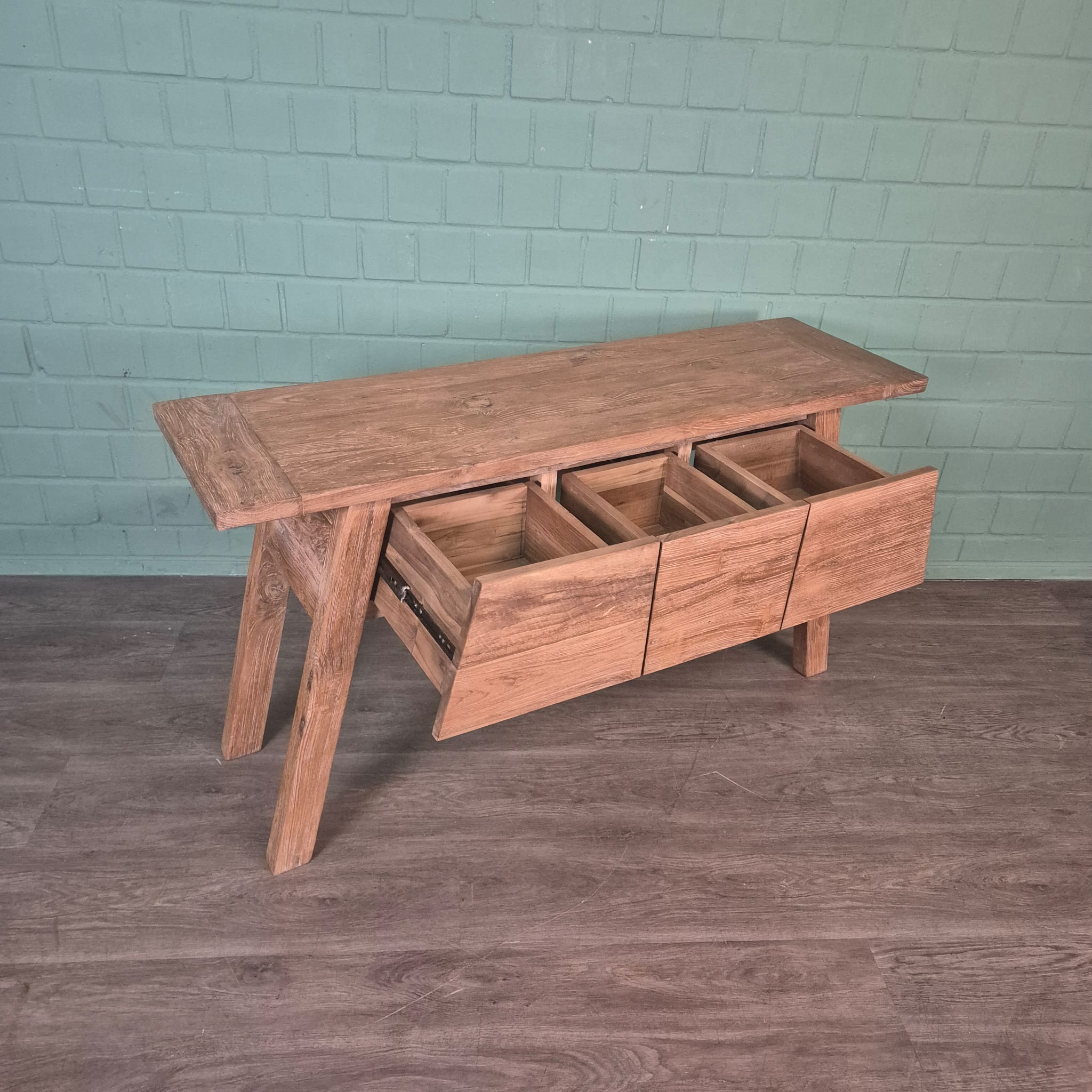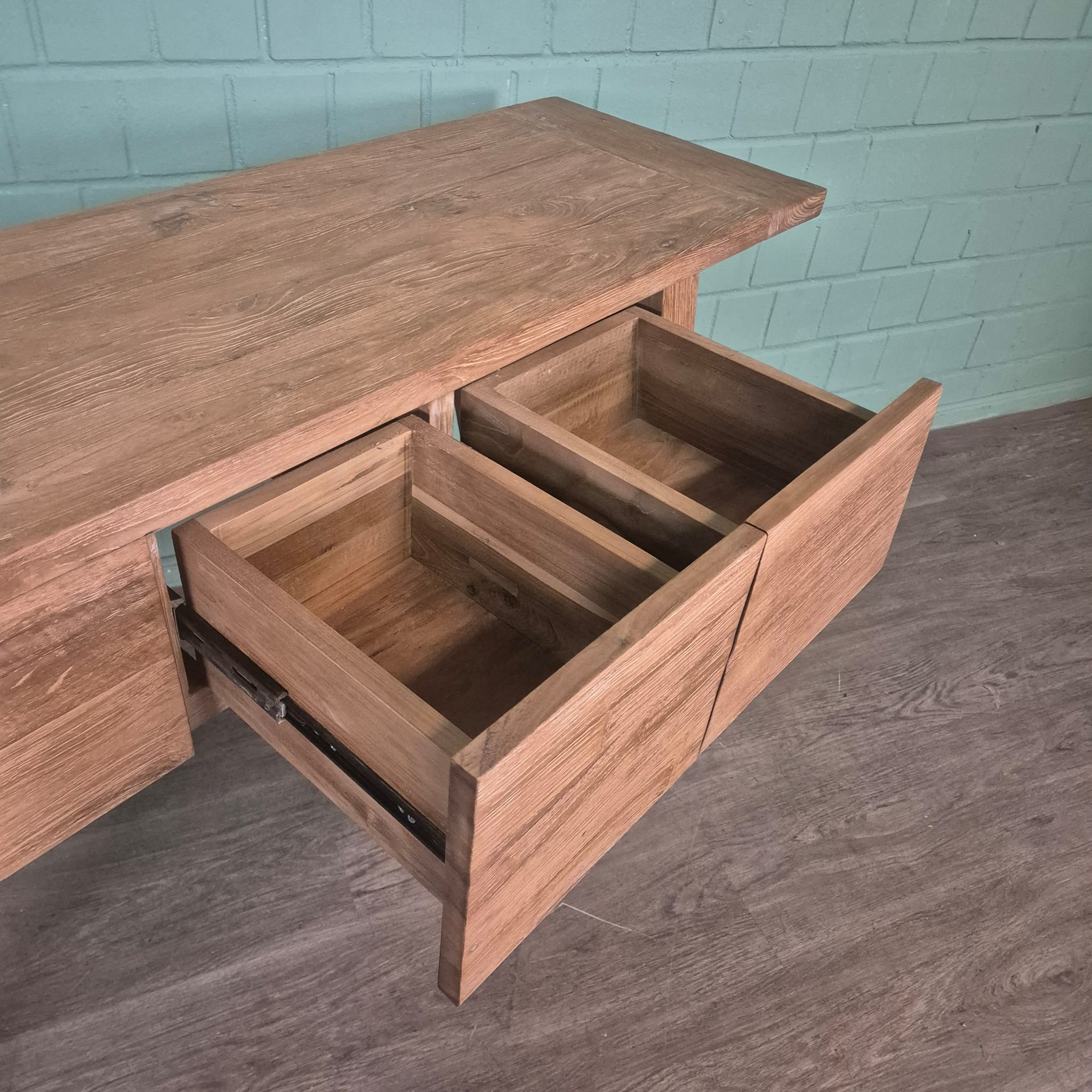 Dieses aufwendig gestaltete Sideboard aus massiv Teakholz (recycelt) erhält seine besondere Wirkung durch natürliche Unregelmäßigkeiten im Holz. Diese entstehen durch das verwendete Edelholz mit seinen verschiedenen Strukturen, welche diesem Stück einen eigentümlichen Charakter verleihen und es zu einem Unikat machen. Machart und Farbton des Holzes tragen sehr zum optischen Wert dieses Möbels bei, das sowohl dekorative Möglichkeiten als auch genügend Stauraum bietet.