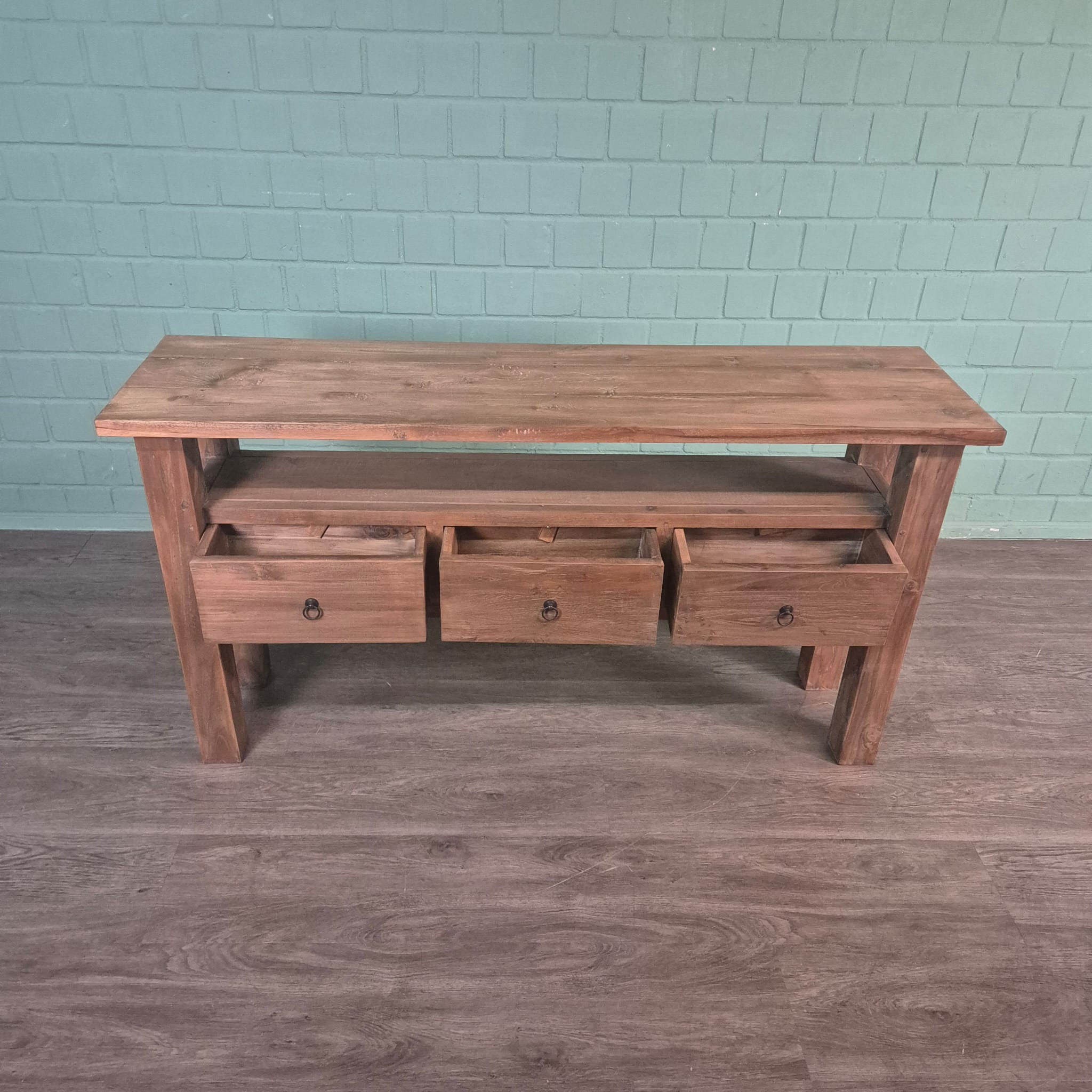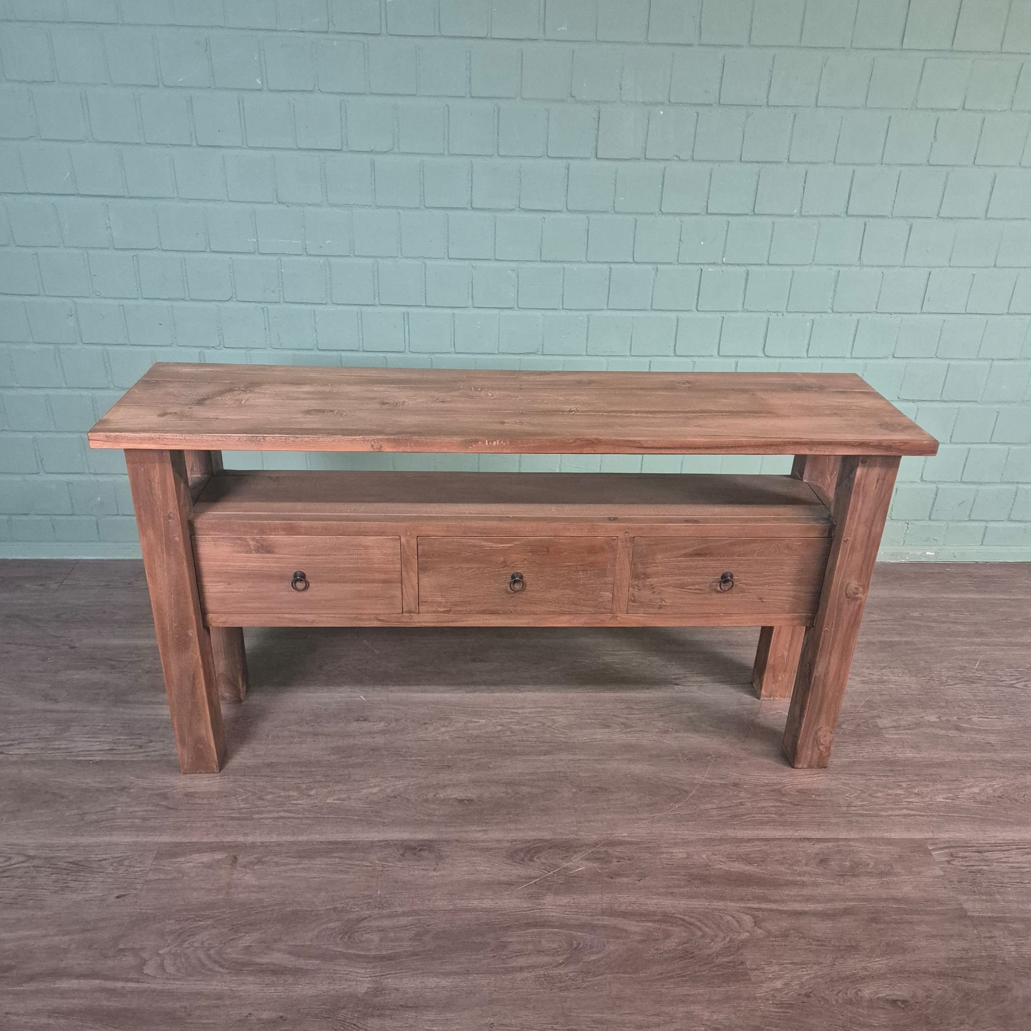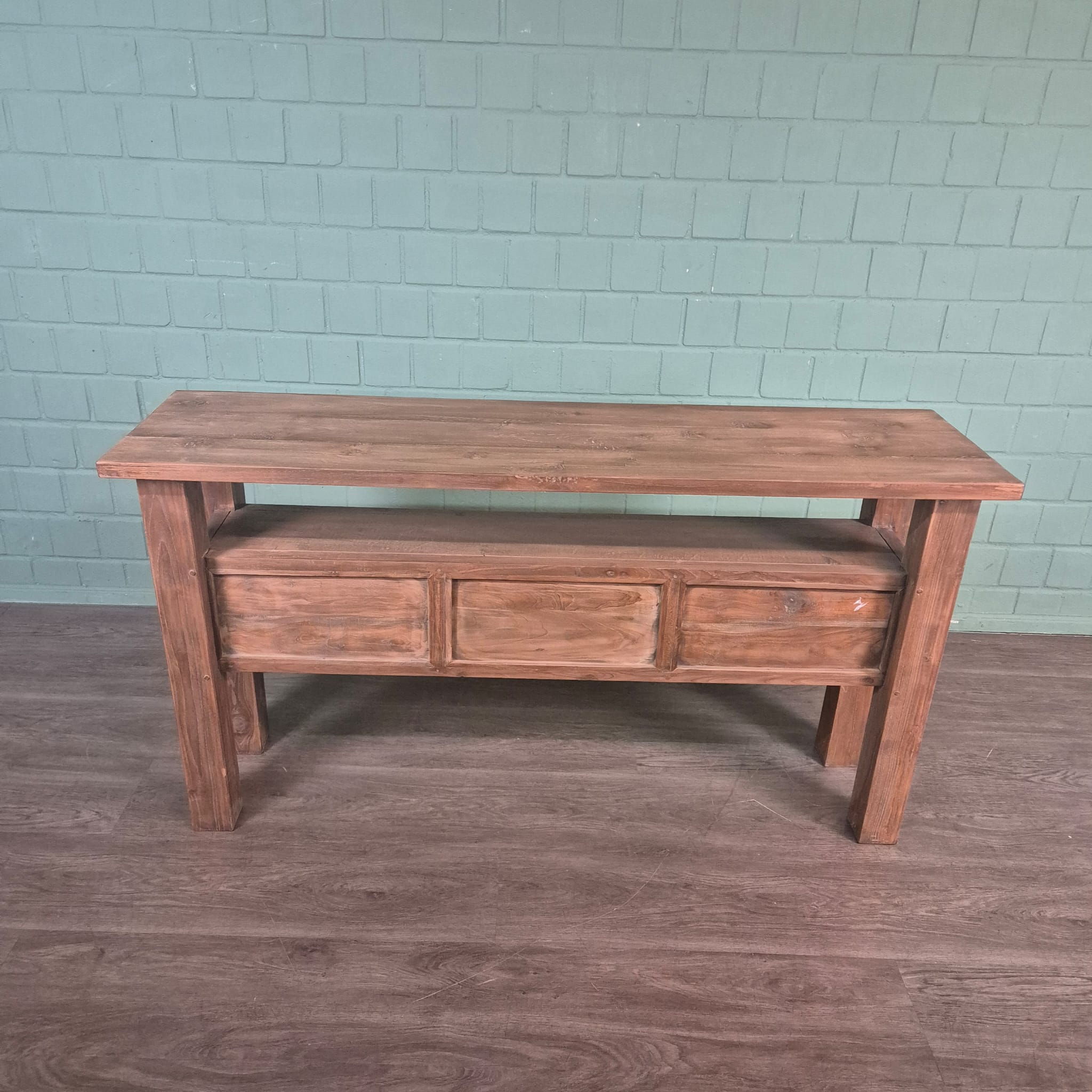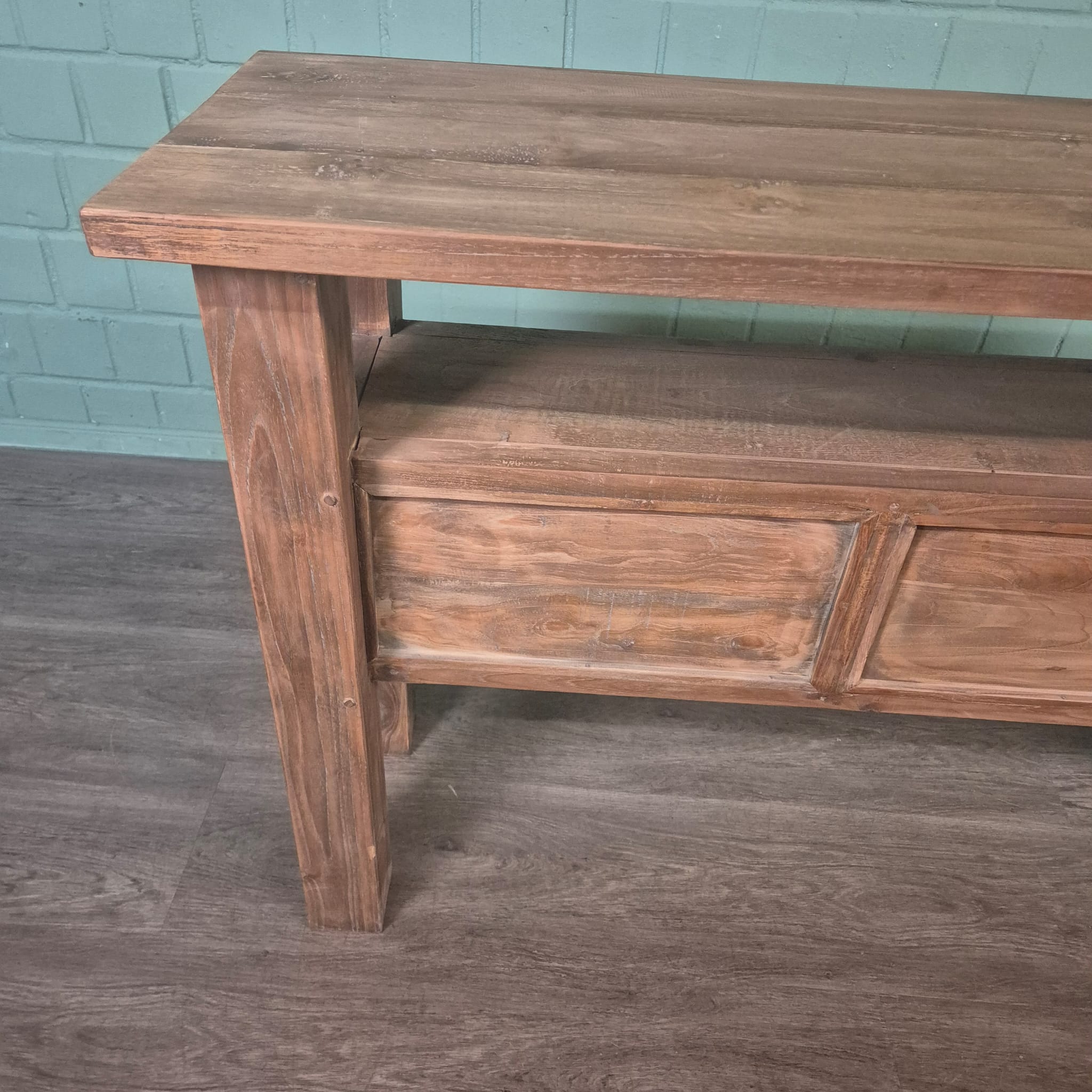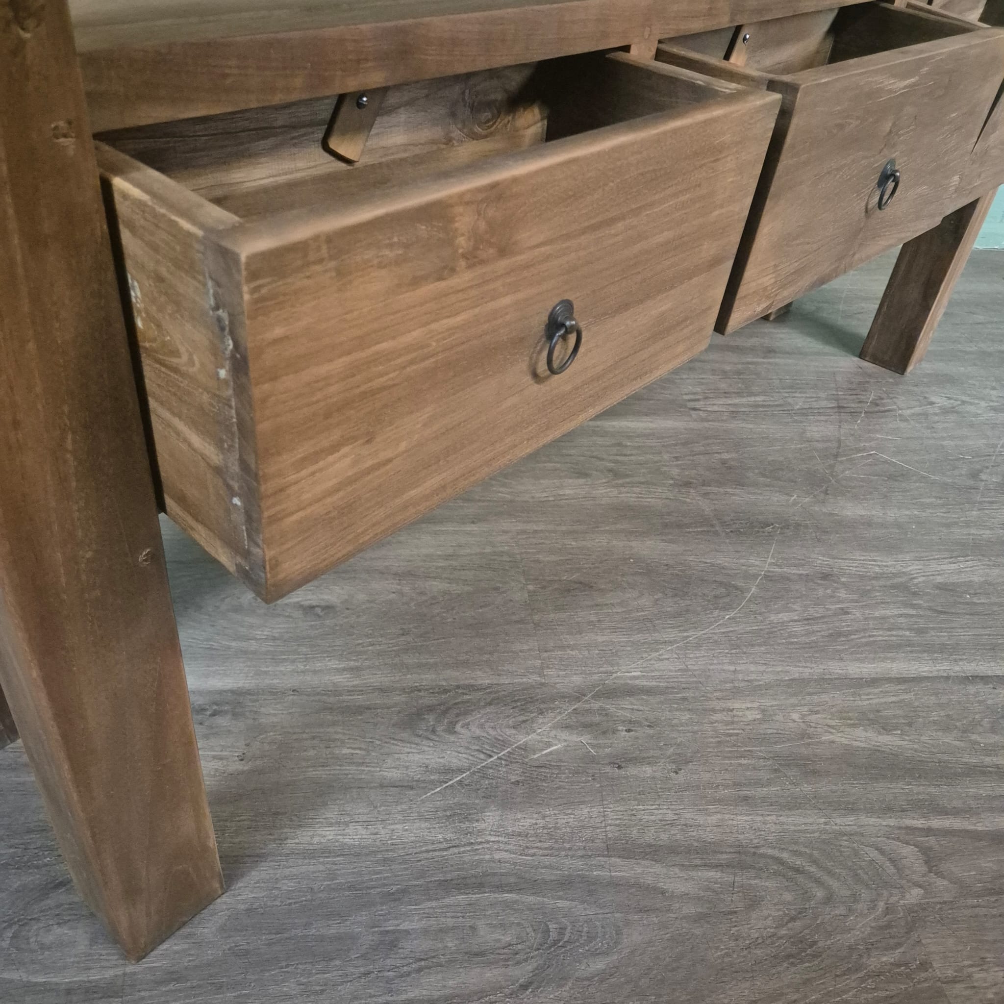 Dieses aufwendig gestaltete Sideboard aus massiv Teakholz erhält seine besondere Wirkung durch natürliche Unregelmäßigkeiten im Holz. Diese entstehen durch das verwendete Edelholz mit seinen verschiedenen Strukturen, welche diesem Stück einen eigentümlichen Charakter verleihen und es zu einem Unikat machen. Machart und Farbton des Holzes tragen sehr zum optischen Wert dieses Möbels bei, das sowohl dekorative Möglichkeiten als auch genügend Stauraum bietet.