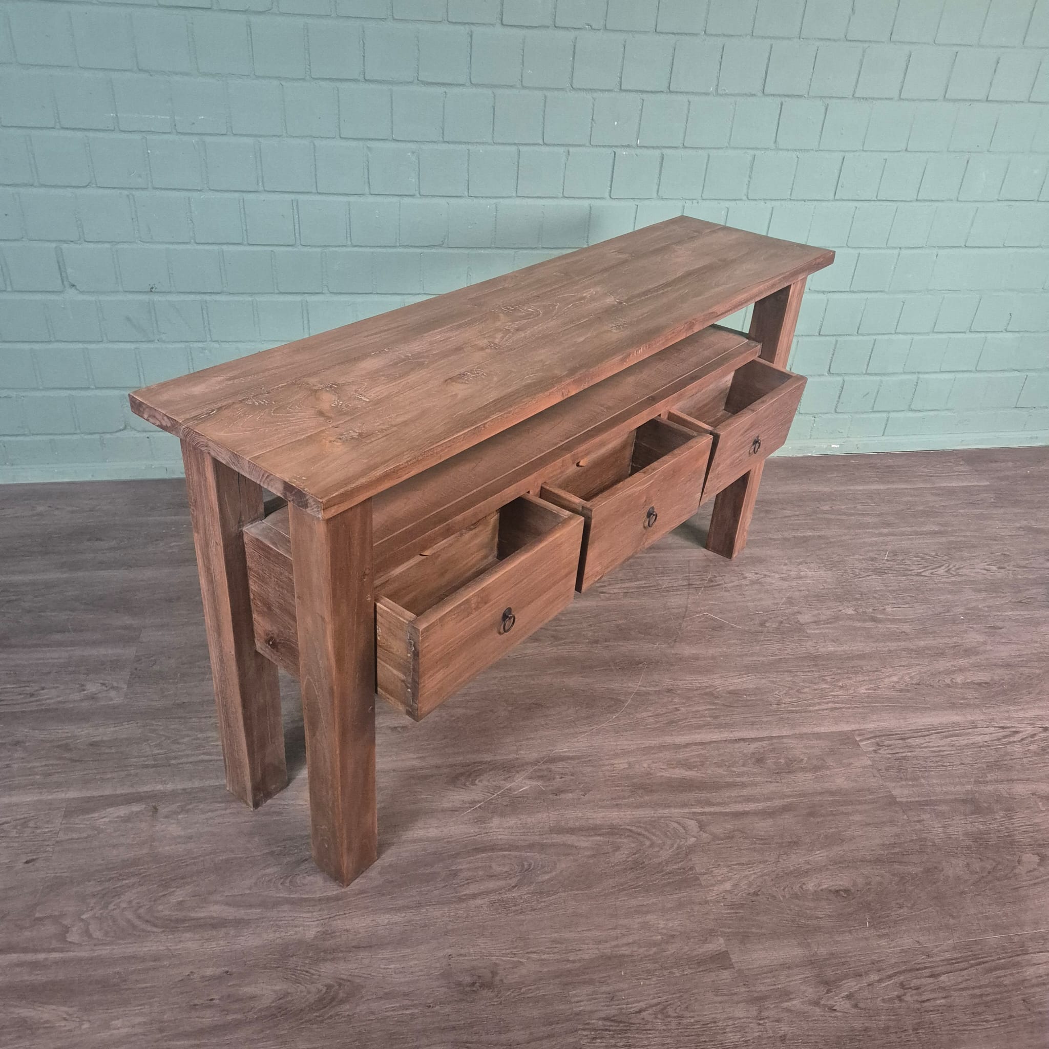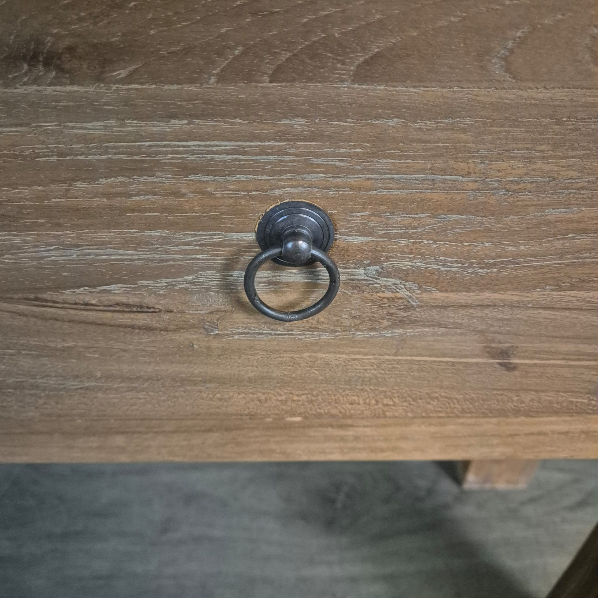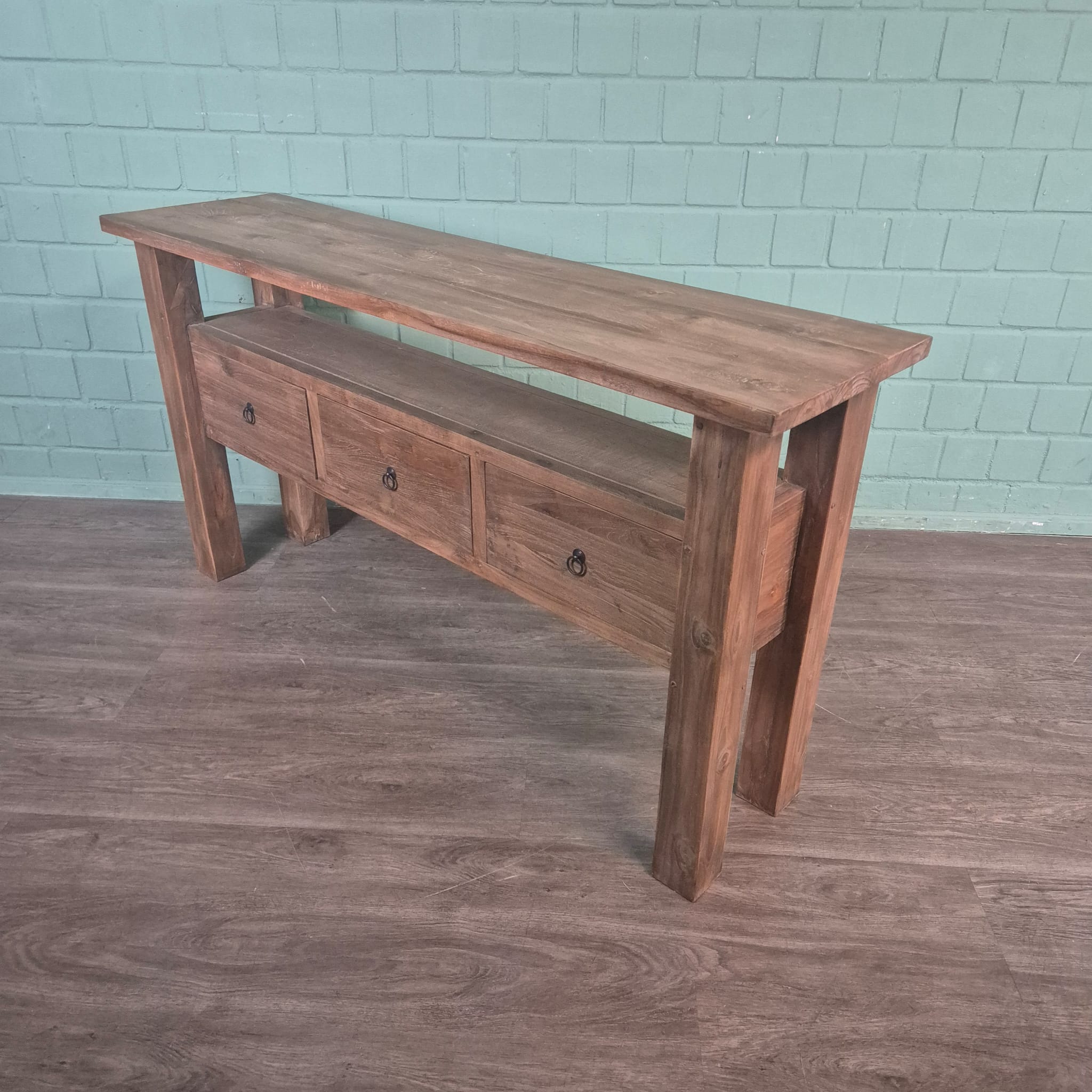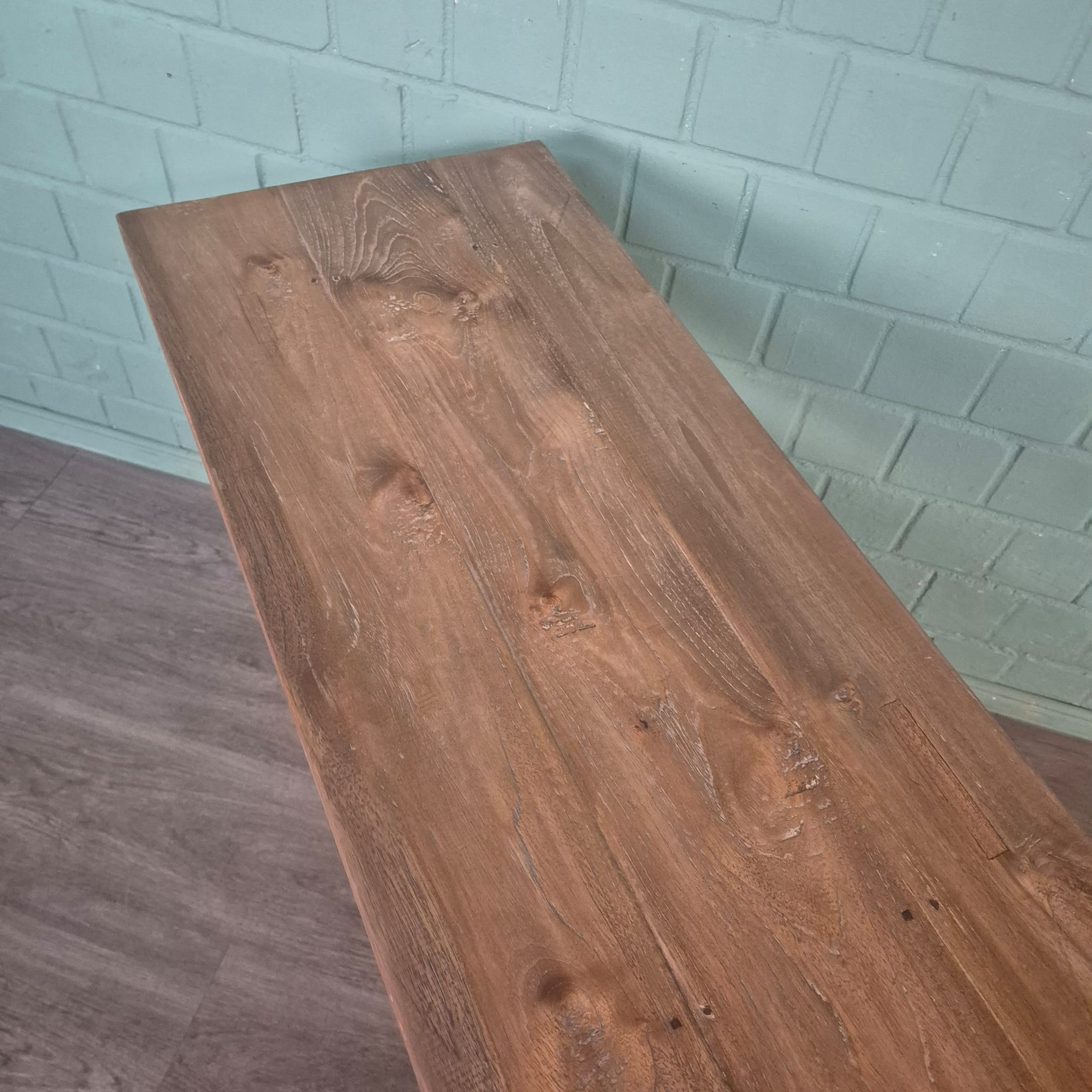 Dieses aufwendig gestaltete Sideboard aus massiv Teakholz erhält seine besondere Wirkung durch natürliche Unregelmäßigkeiten im Holz. Diese entstehen durch das verwendete Edelholz mit seinen verschiedenen Strukturen, welche diesem Stück einen eigentümlichen Charakter verleihen und es zu einem Unikat machen. Machart und Farbton des Holzes tragen sehr zum optischen Wert dieses Möbels bei, das sowohl dekorative Möglichkeiten als auch genügend Stauraum bietet.