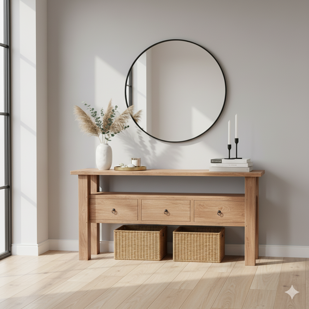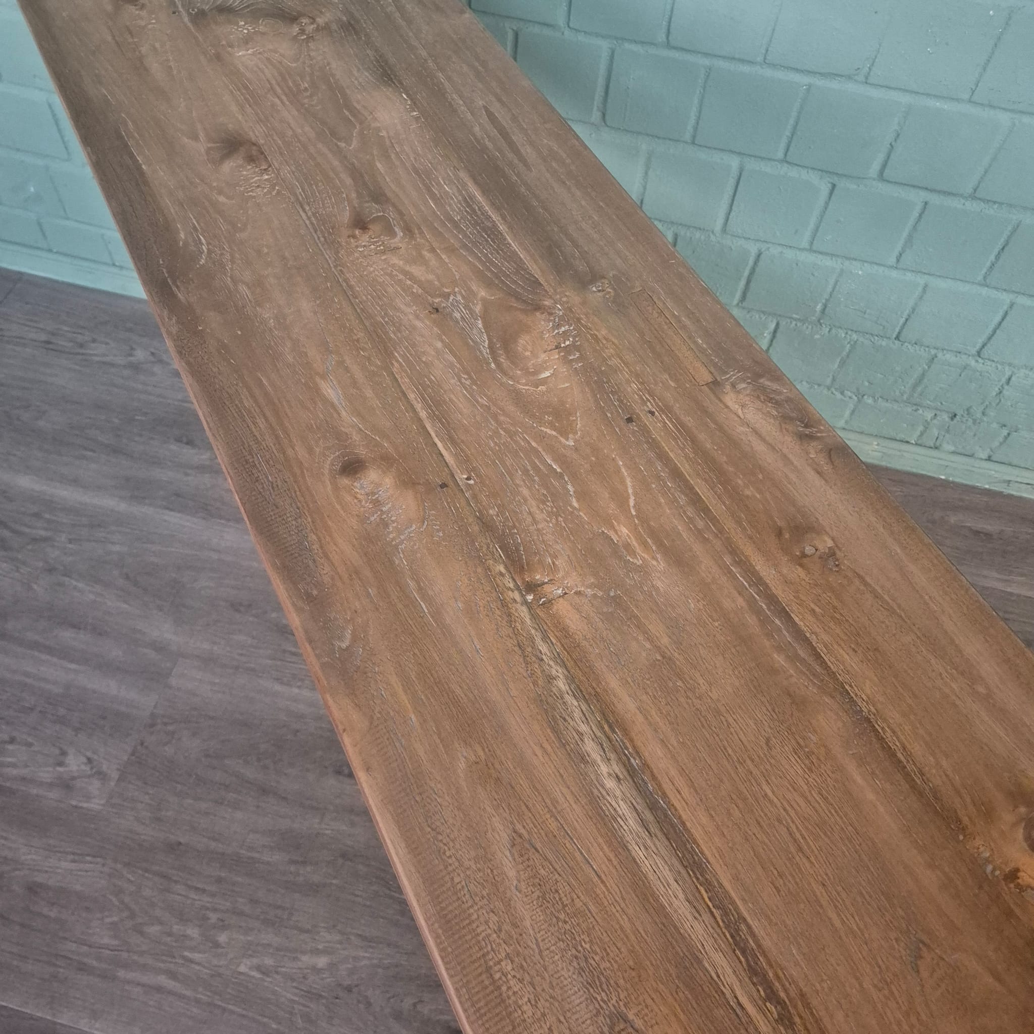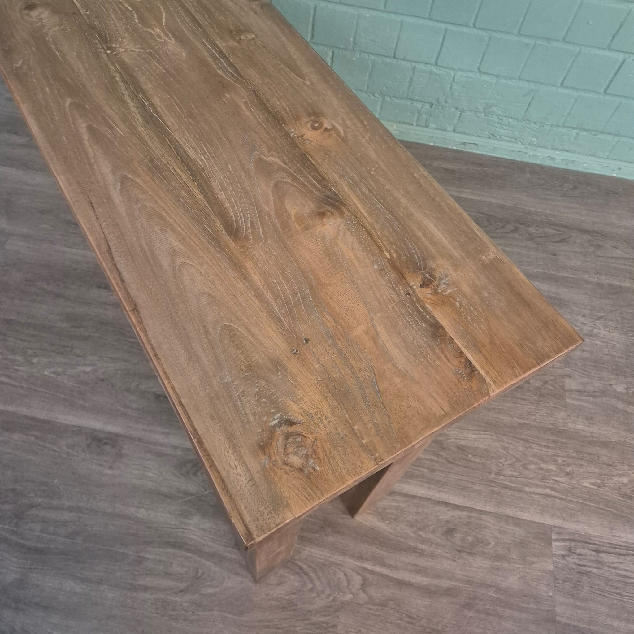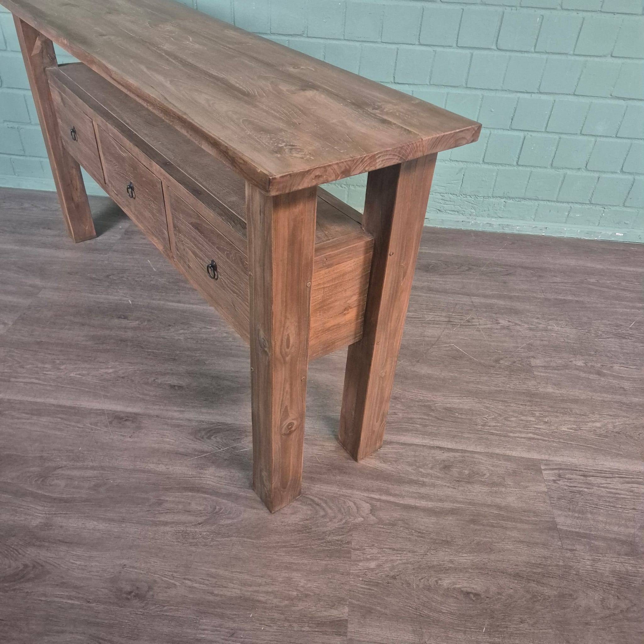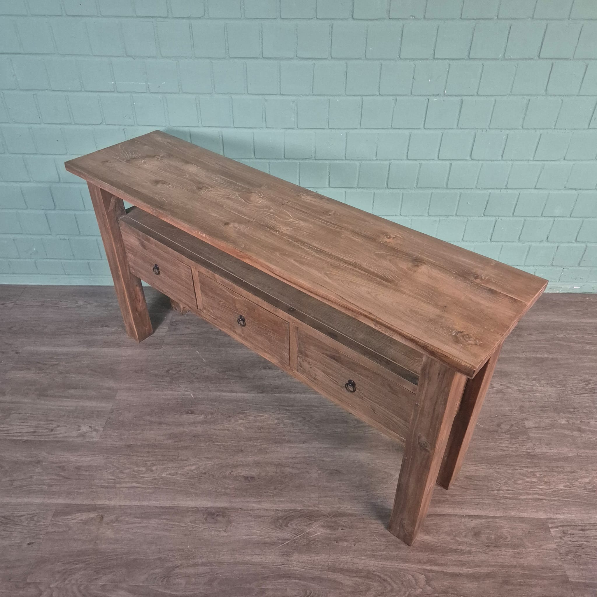Dieses aufwendig gestaltete Sideboard aus massiv Teakholz erhält seine besondere Wirkung durch natürliche Unregelmäßigkeiten im Holz. Diese entstehen durch das verwendete Edelholz mit seinen verschiedenen Strukturen, welche diesem Stück einen eigentümlichen Charakter verleihen und es zu einem Unikat machen. Machart und Farbton des Holzes tragen sehr zum optischen Wert dieses Möbels bei, das sowohl dekorative Möglichkeiten als auch genügend Stauraum bietet.