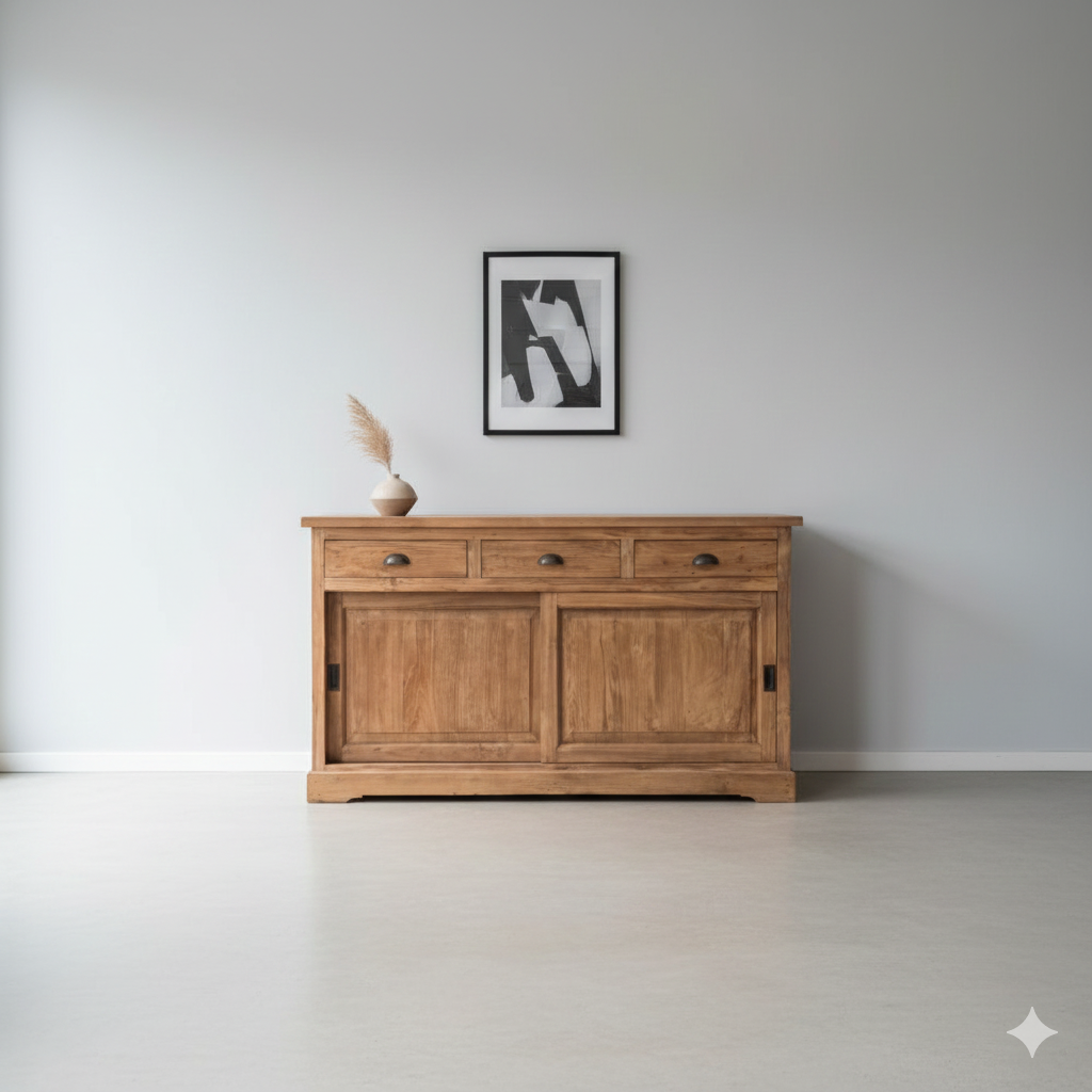 Dieses aufwendig gestaltete Sideboard aus massiv Teakholz erhält seine besondere Wirkung durch natürliche Unregelmäßigkeiten im Holz. Diese entstehen durch das verwendete Edelholz mit seinen verschiedenen Strukturen, welche diesem Stück einen eigentümlichen Charakter verleihen und es zu einem Unikat machen. Machart und Farbton des Holzes tragen sehr zum optischen Wert dieses Möbels bei, das sowohl dekorative Möglichkeiten als auch genügend Stauraum bietet.