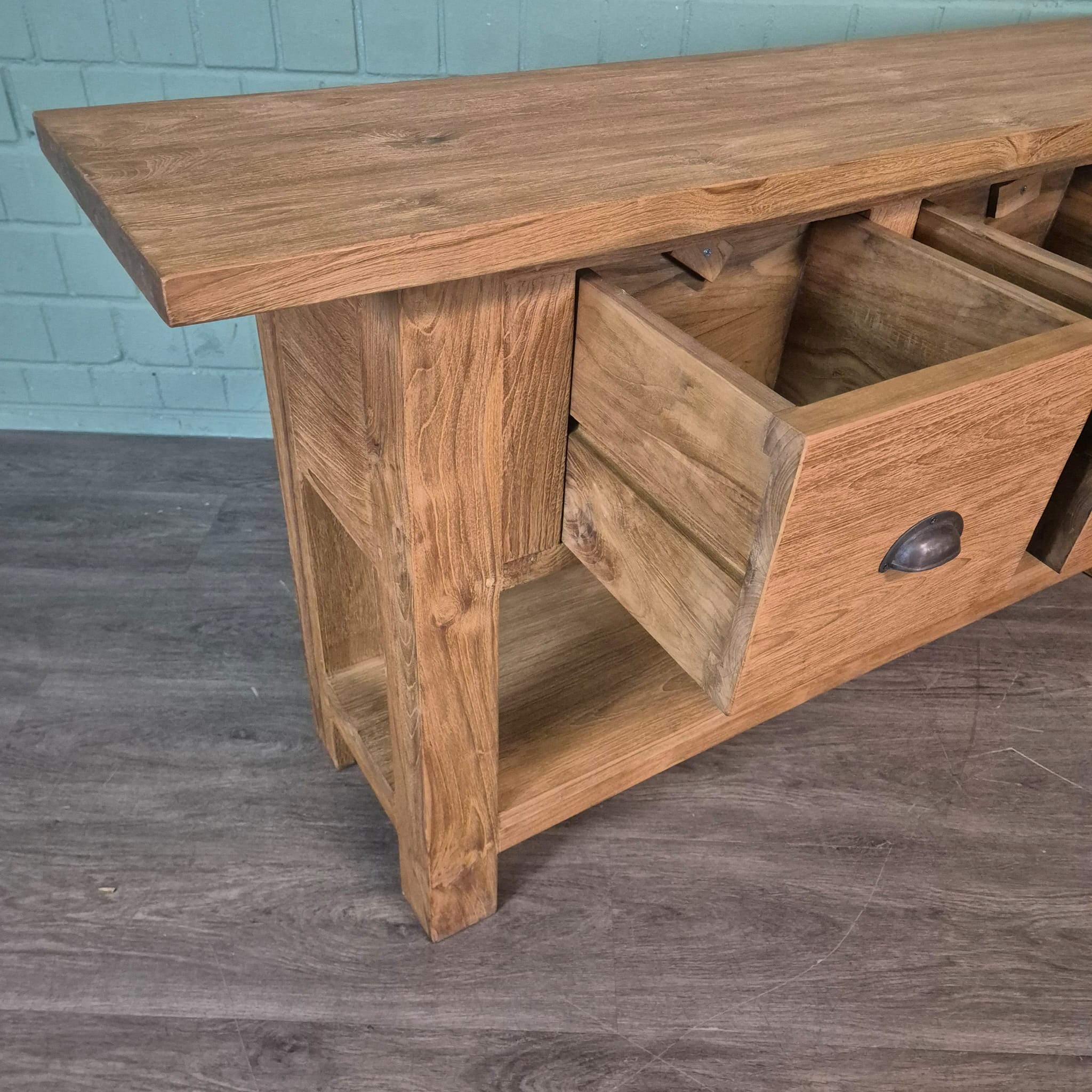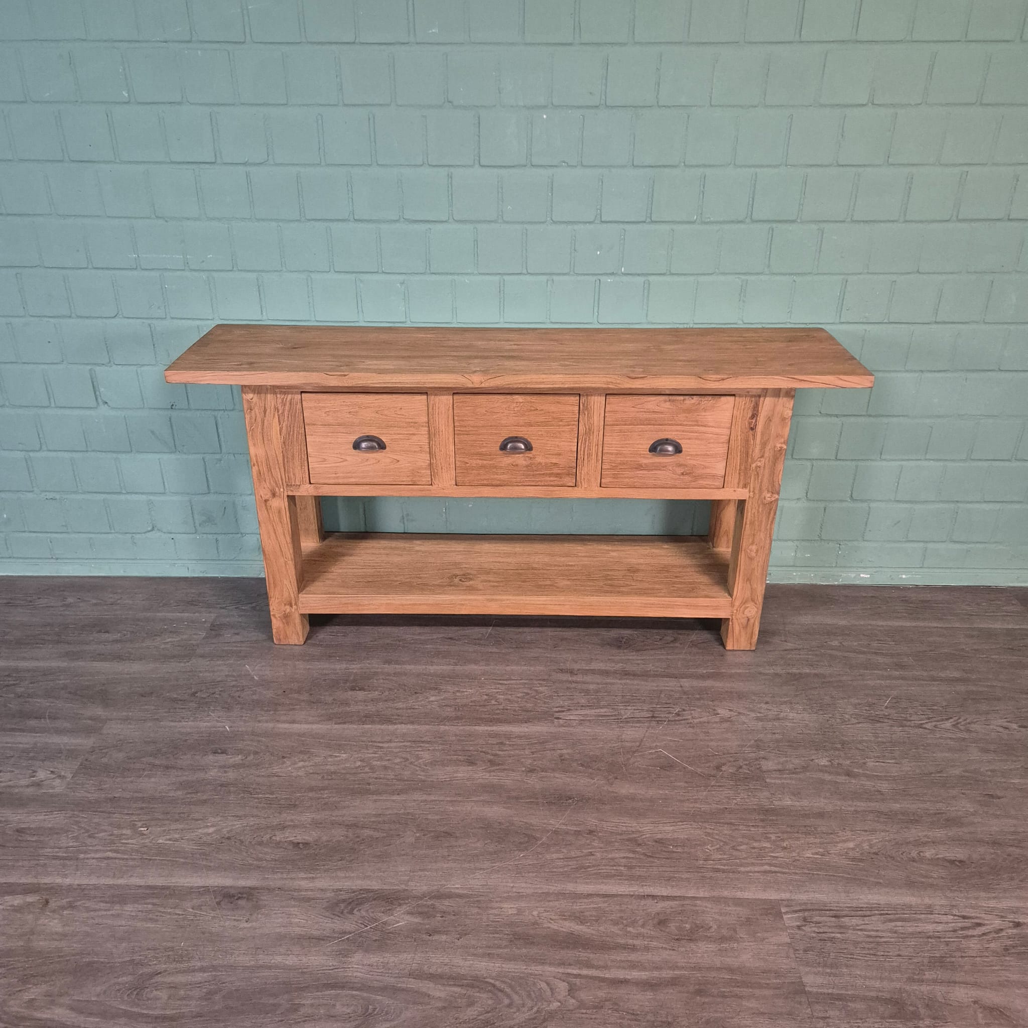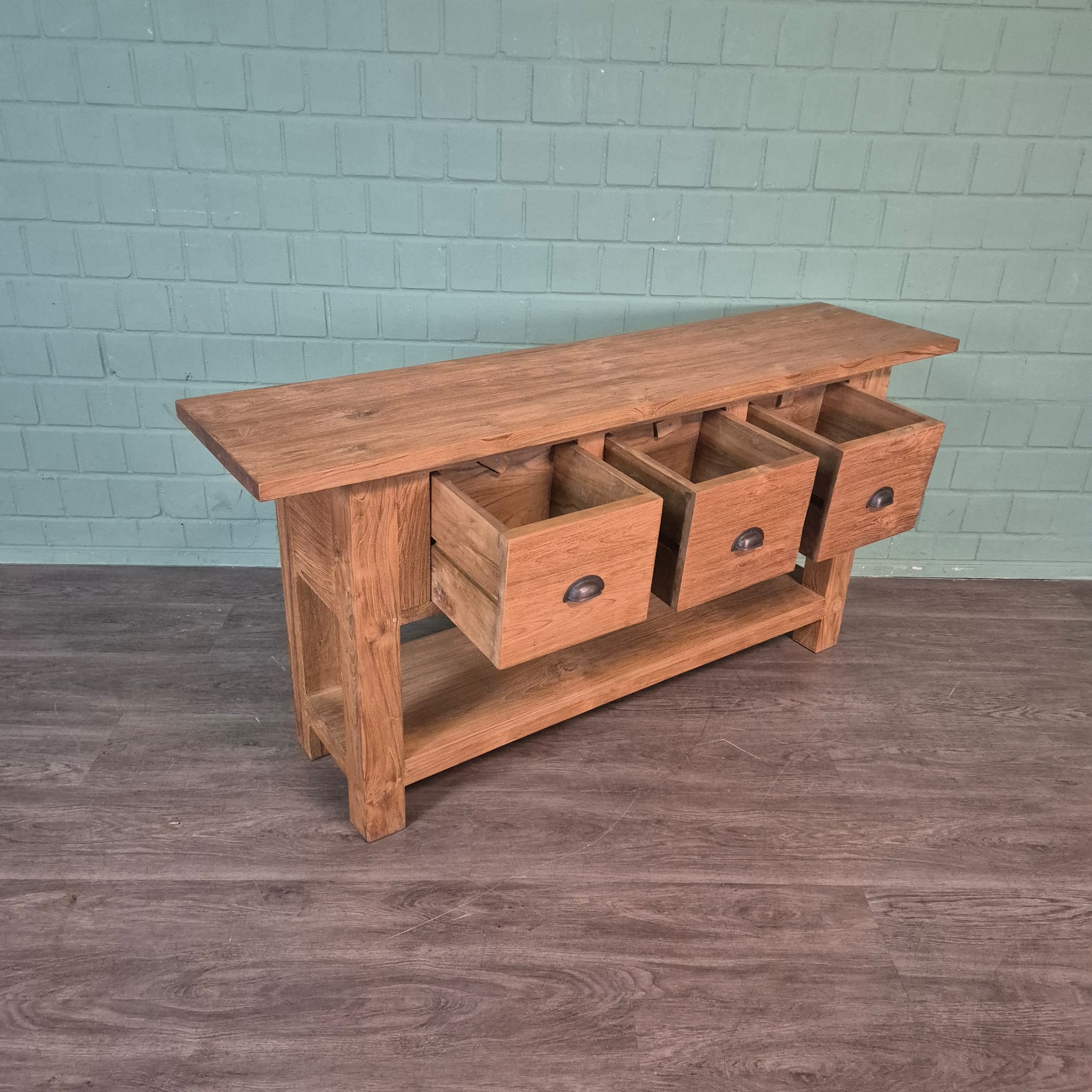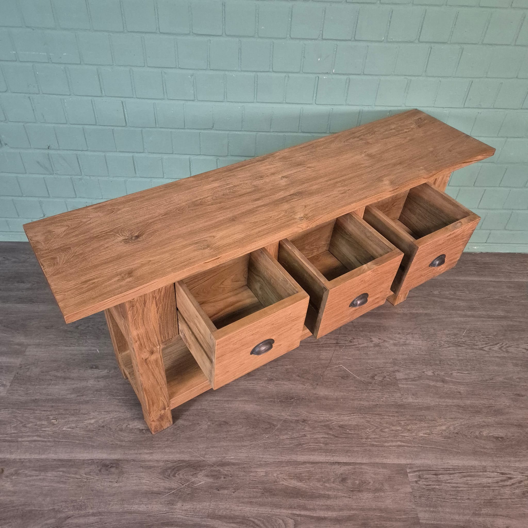 Dieses aufwendig gestaltete Sideboard aus massiv Teakholz erhält seine besondere Wirkung durch natürliche Unregelmäßigkeiten im Holz. Diese entstehen durch das verwendete Edelholz mit seinen verschiedenen Strukturen, welche diesem Stück einen eigentümlichen Charakter verleihen und es zu einem Unikat machen. Machart und Farbton des Holzes tragen sehr zum optischen Wert dieses Möbels bei, das sowohl dekorative Möglichkeiten als auch genügend Stauraum bietet.