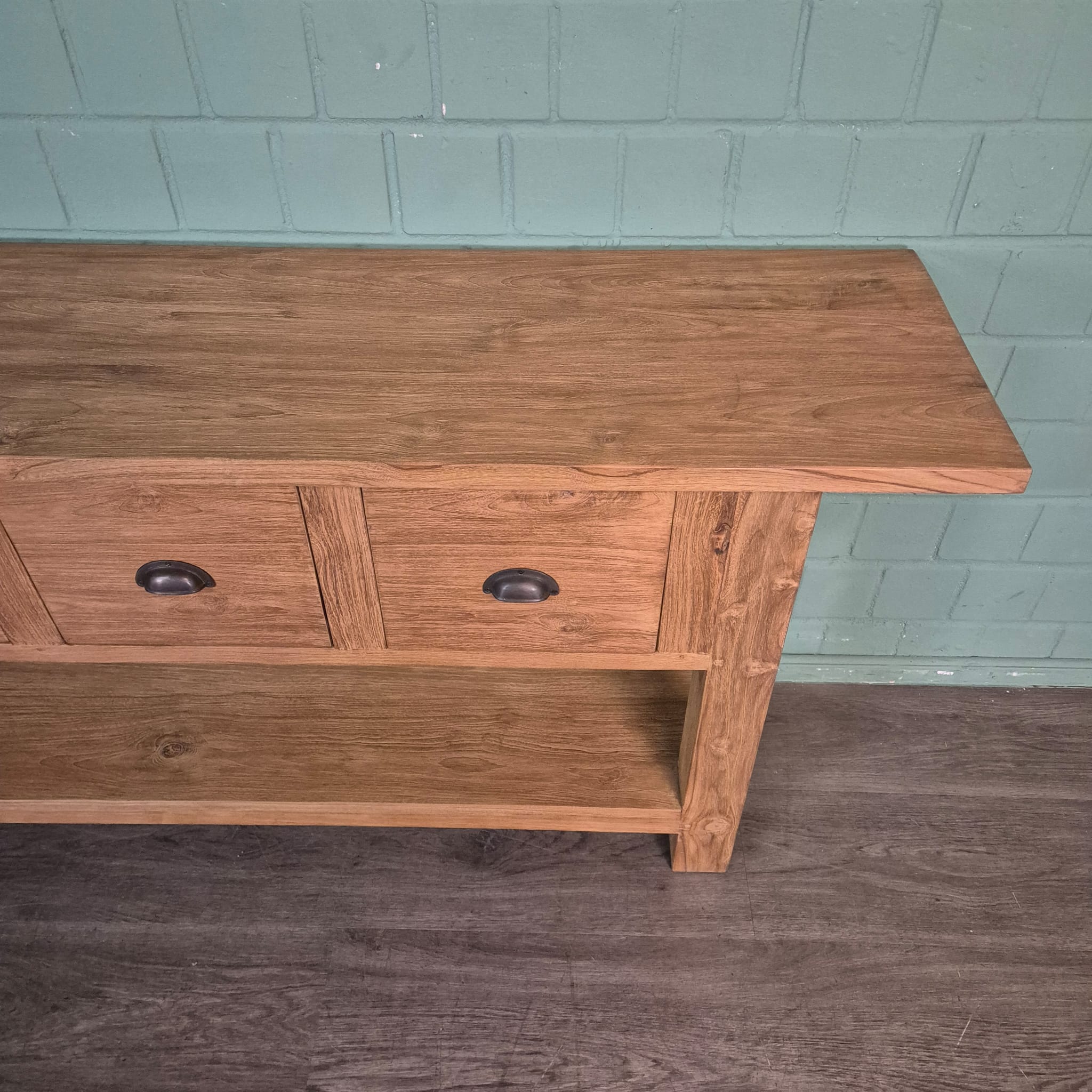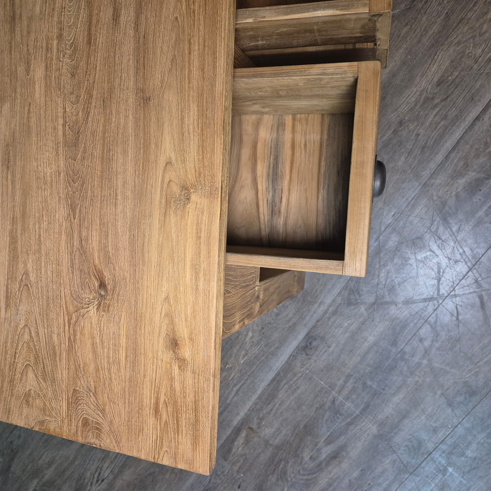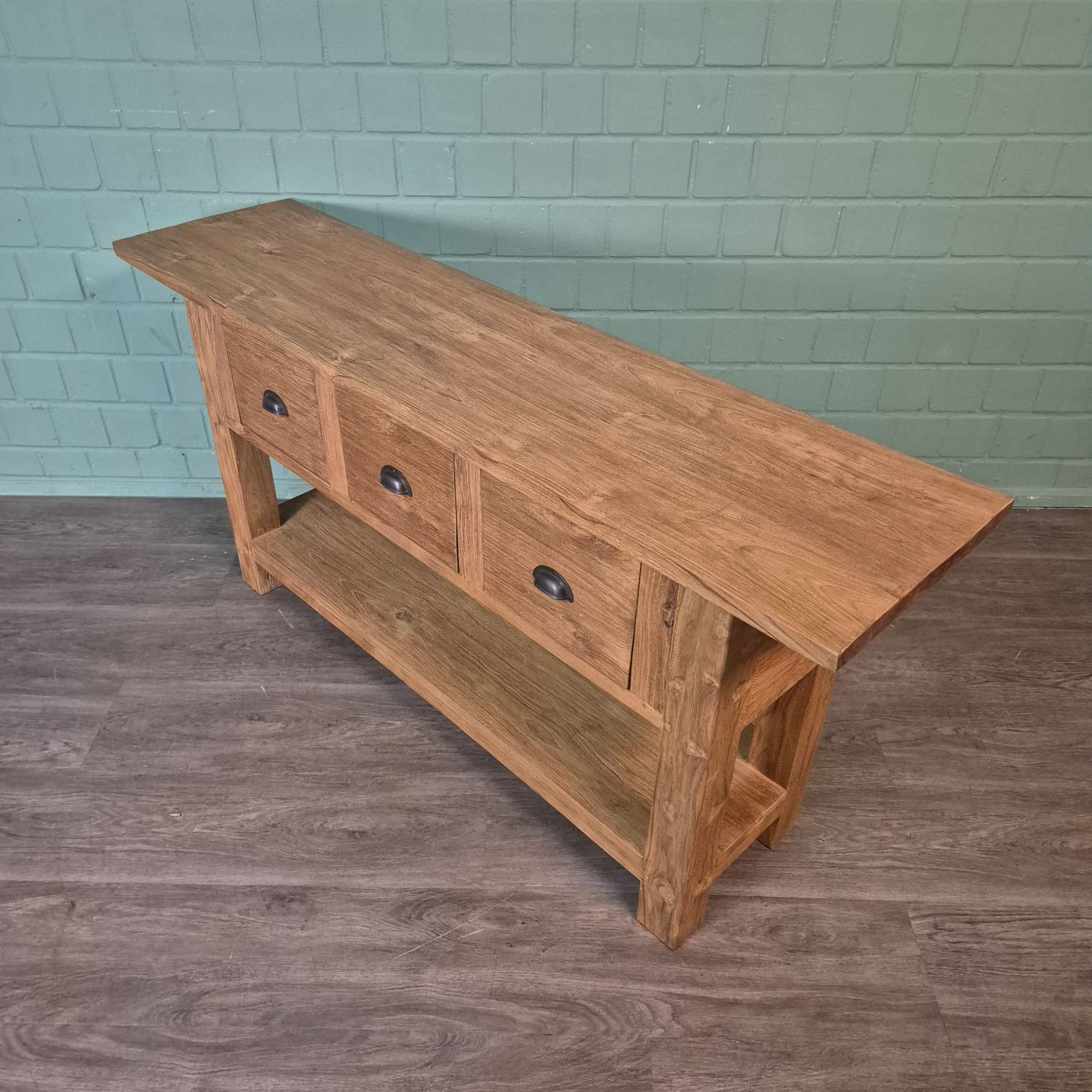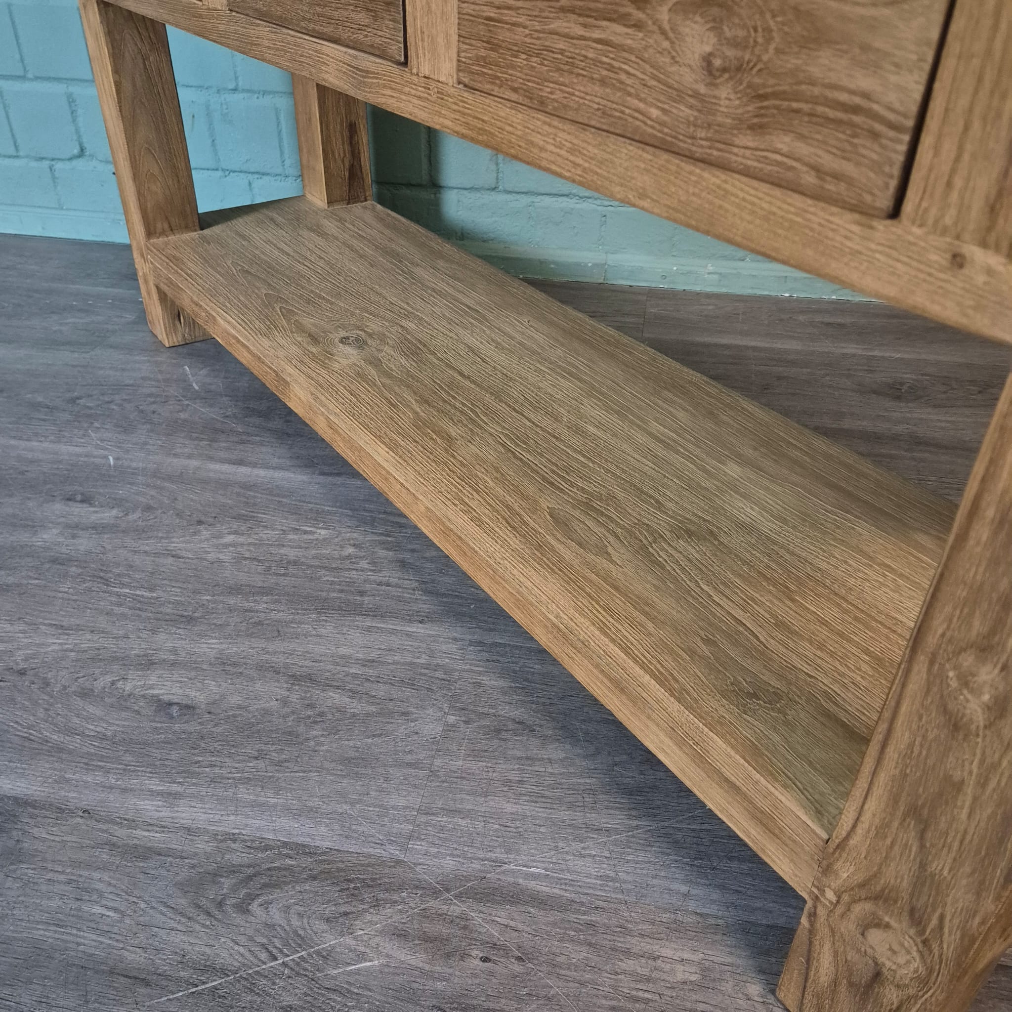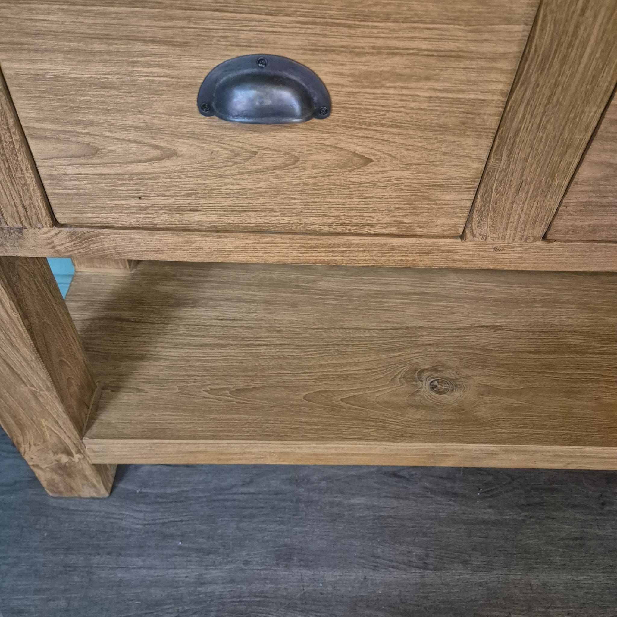 Dieses aufwendig gestaltete Sideboard aus massiv Teakholz erhält seine besondere Wirkung durch natürliche Unregelmäßigkeiten im Holz. Diese entstehen durch das verwendete Edelholz mit seinen verschiedenen Strukturen, welche diesem Stück einen eigentümlichen Charakter verleihen und es zu einem Unikat machen. Machart und Farbton des Holzes tragen sehr zum optischen Wert dieses Möbels bei, das sowohl dekorative Möglichkeiten als auch genügend Stauraum bietet.