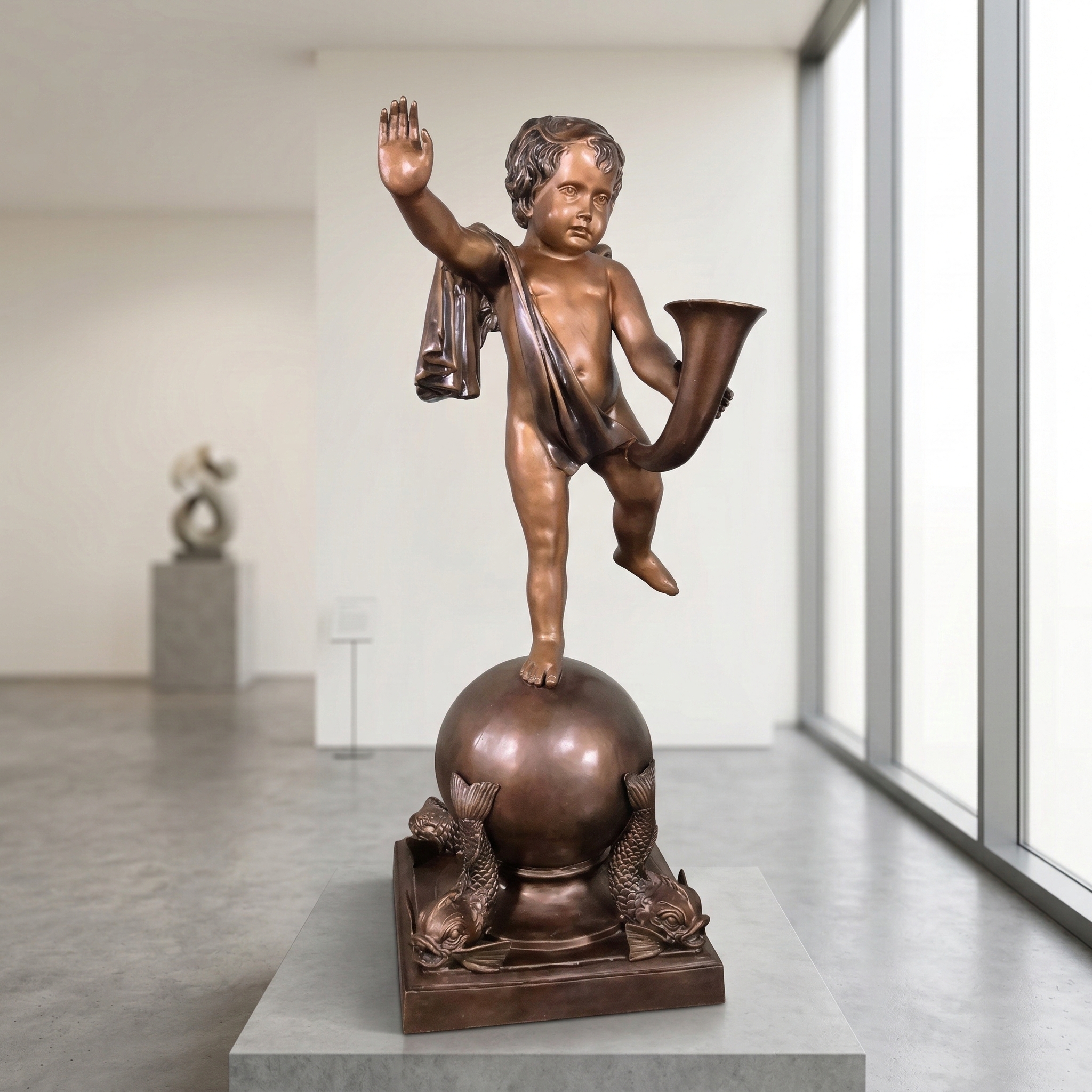 Zeitloser Charme: Dieser prachtvolle Bronzespeier ist ein wahres Meisterwerk der Kunstgießerei. Der putzige Knabe (Putte), der auf einer Kugel balanciert und mit einer Muschel Wasser spendet, ist ein zeitloser Klassiker. Die detailreiche Gestaltung und die hochwertige Patina verleihen dem Speier einen antiken Charme.