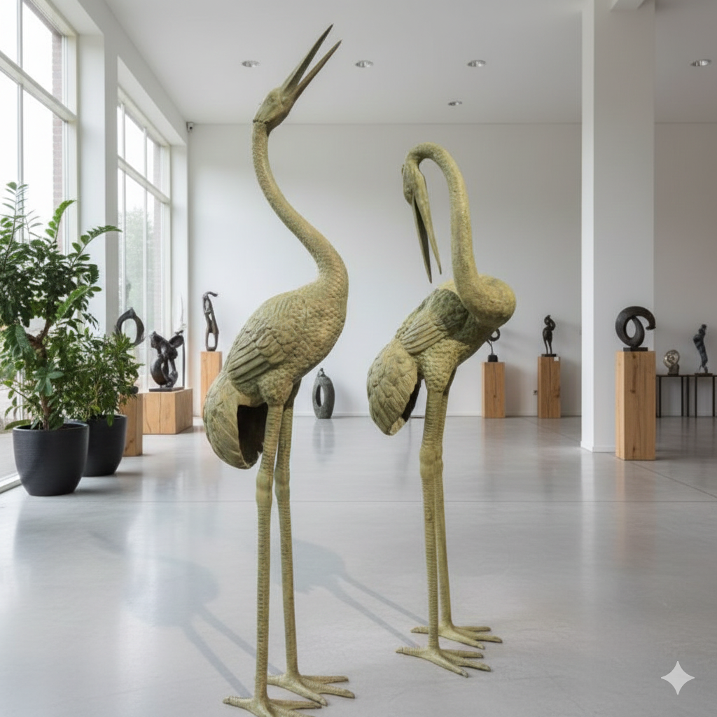 Detailgetreue und formschöne Darstellung von zwei Kranichen. Als Wasserspeier oder Skulptur nutzbar. Bei Nutzung als Wasserspeier sprudelt das Wasser aus dem Schnabel der Kraniche. Setpreis.
