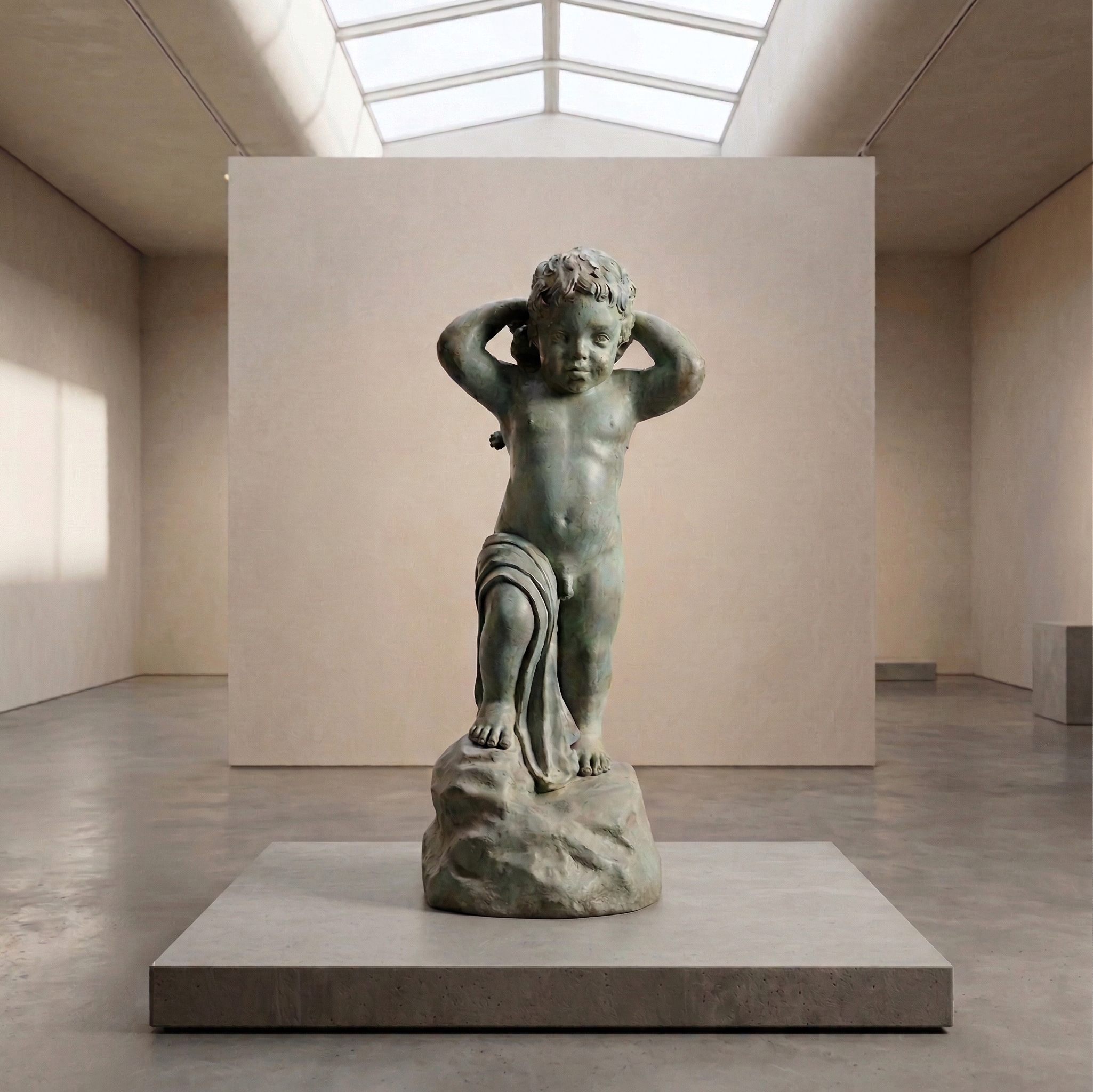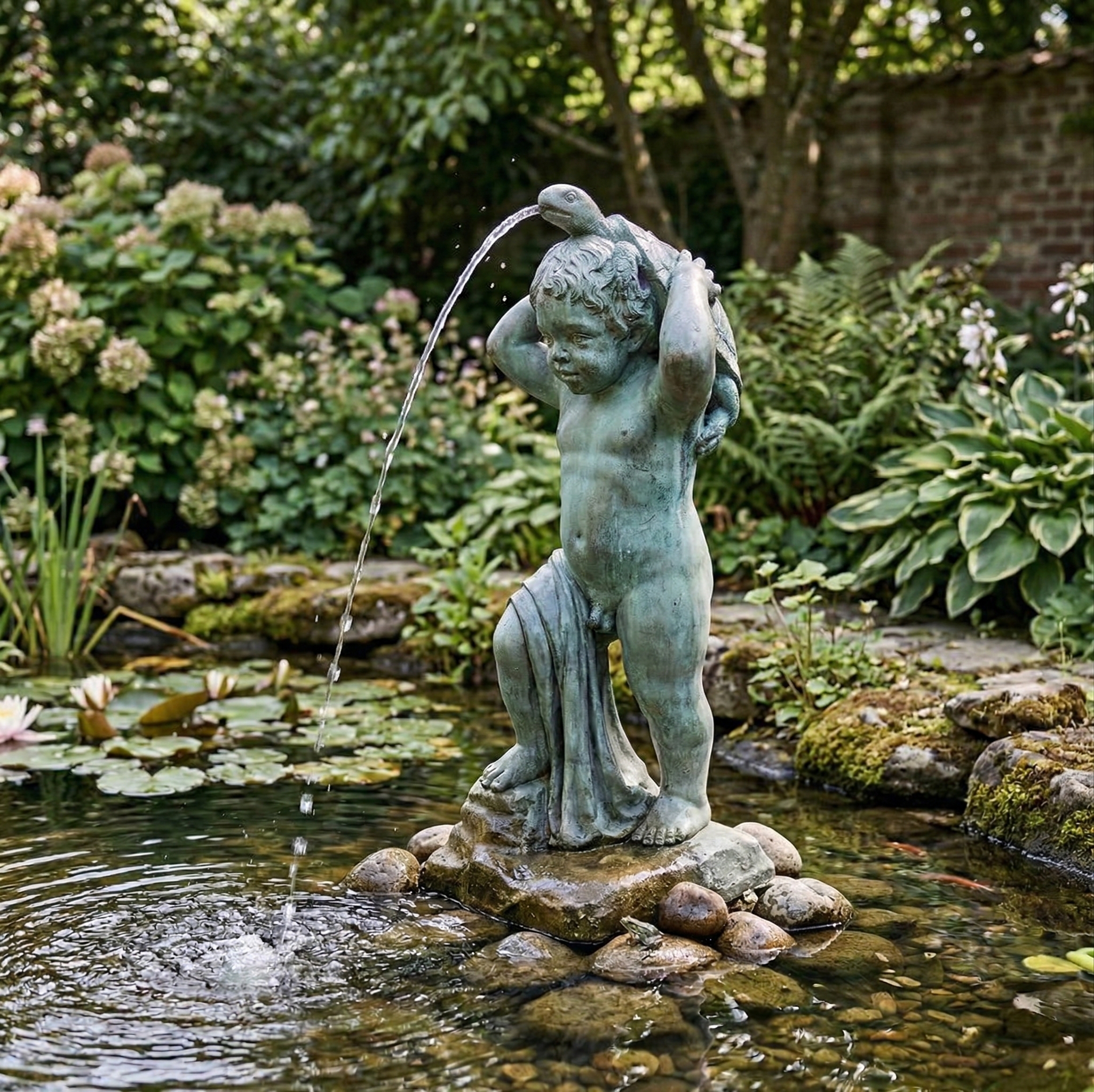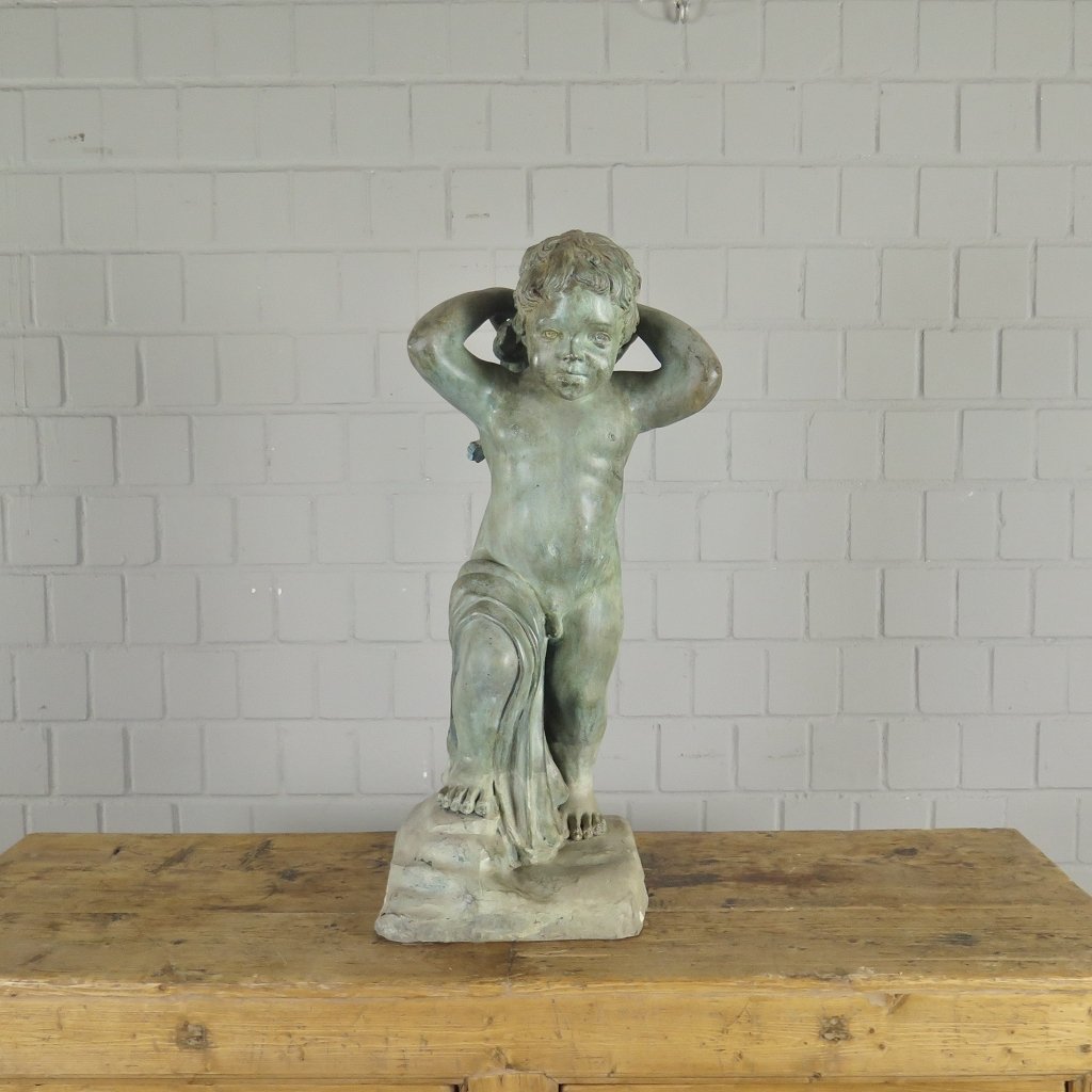 Wasserspeier unbekannten Alters in Form einer Putte mit Schildkröte hergestellt aus Bronze.