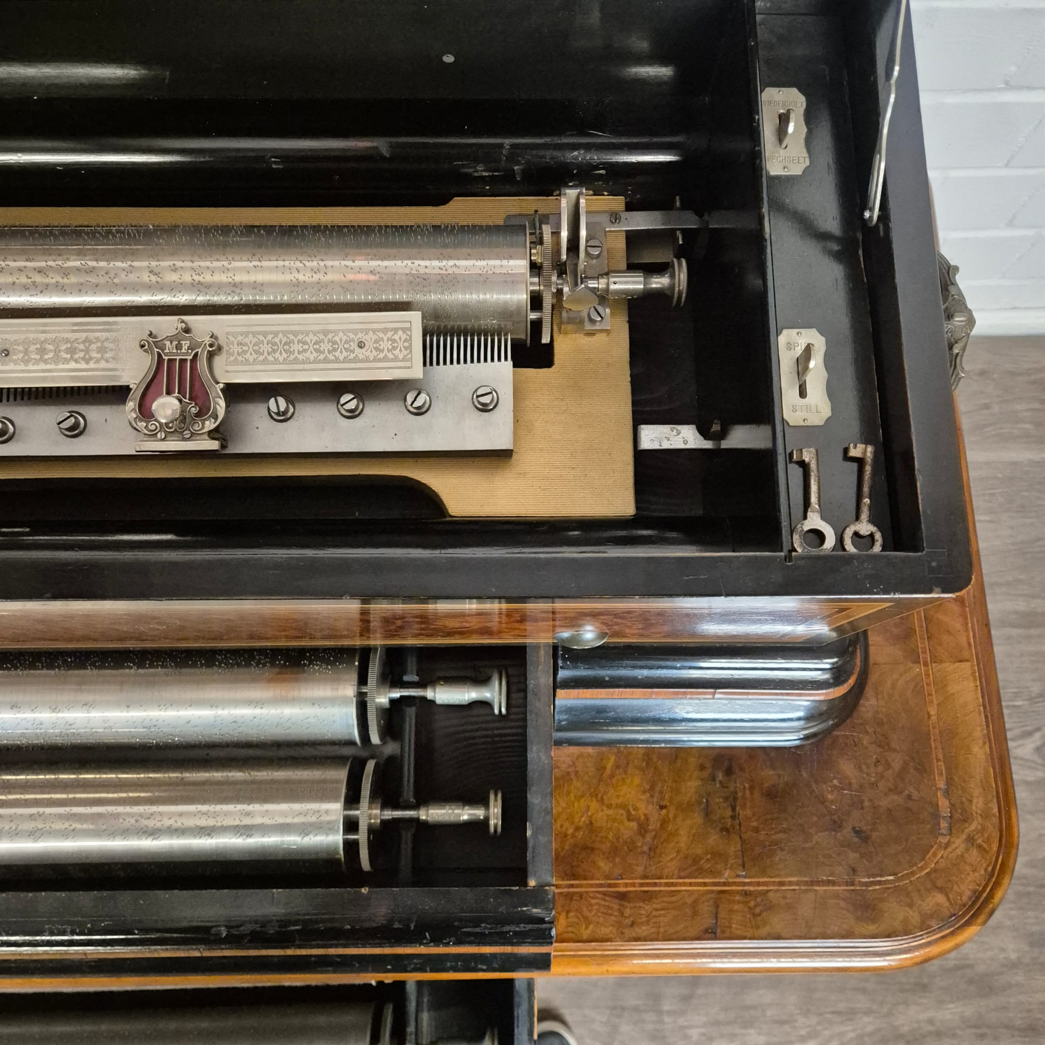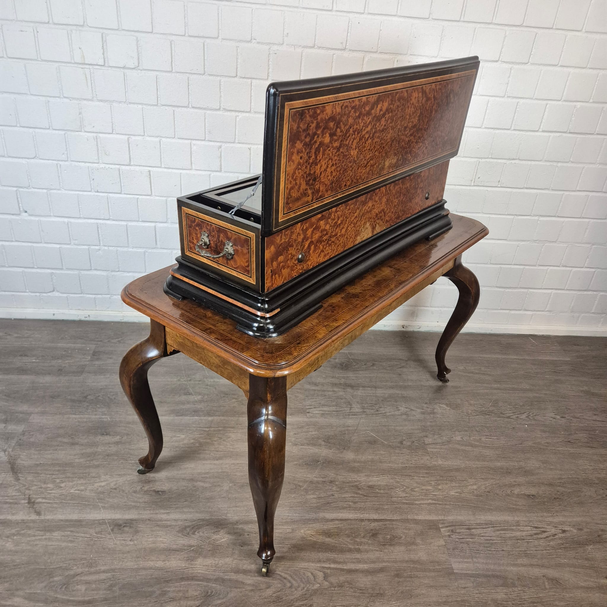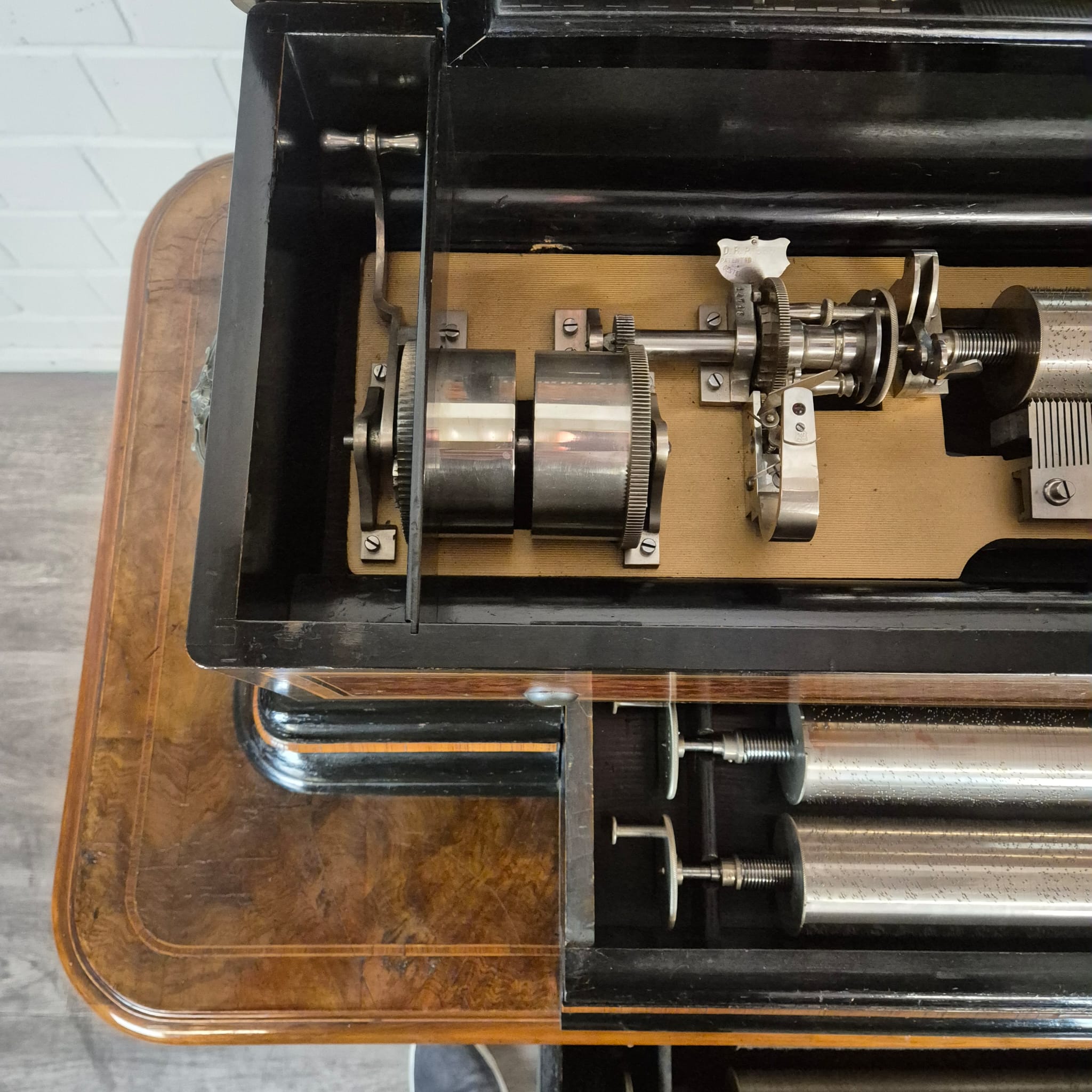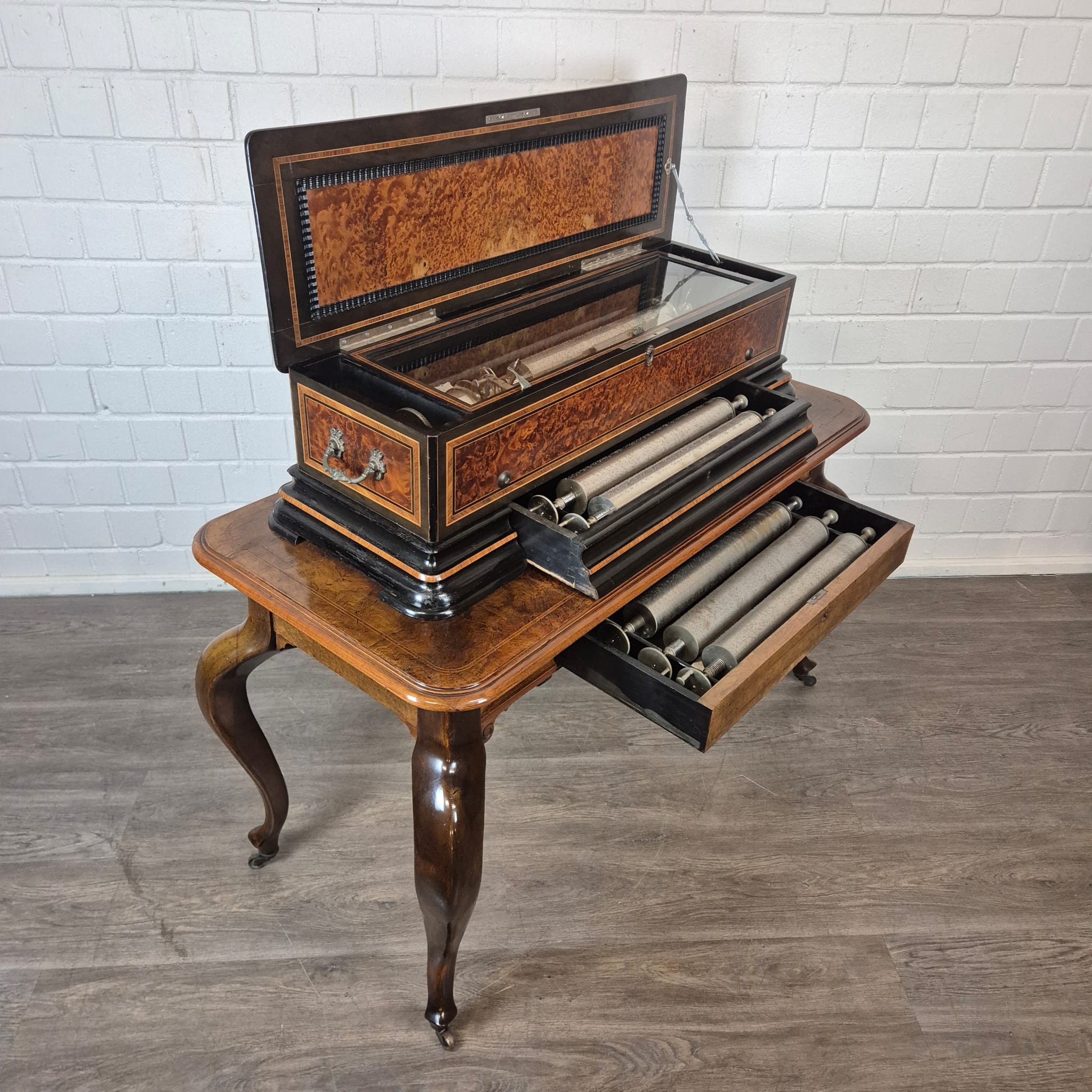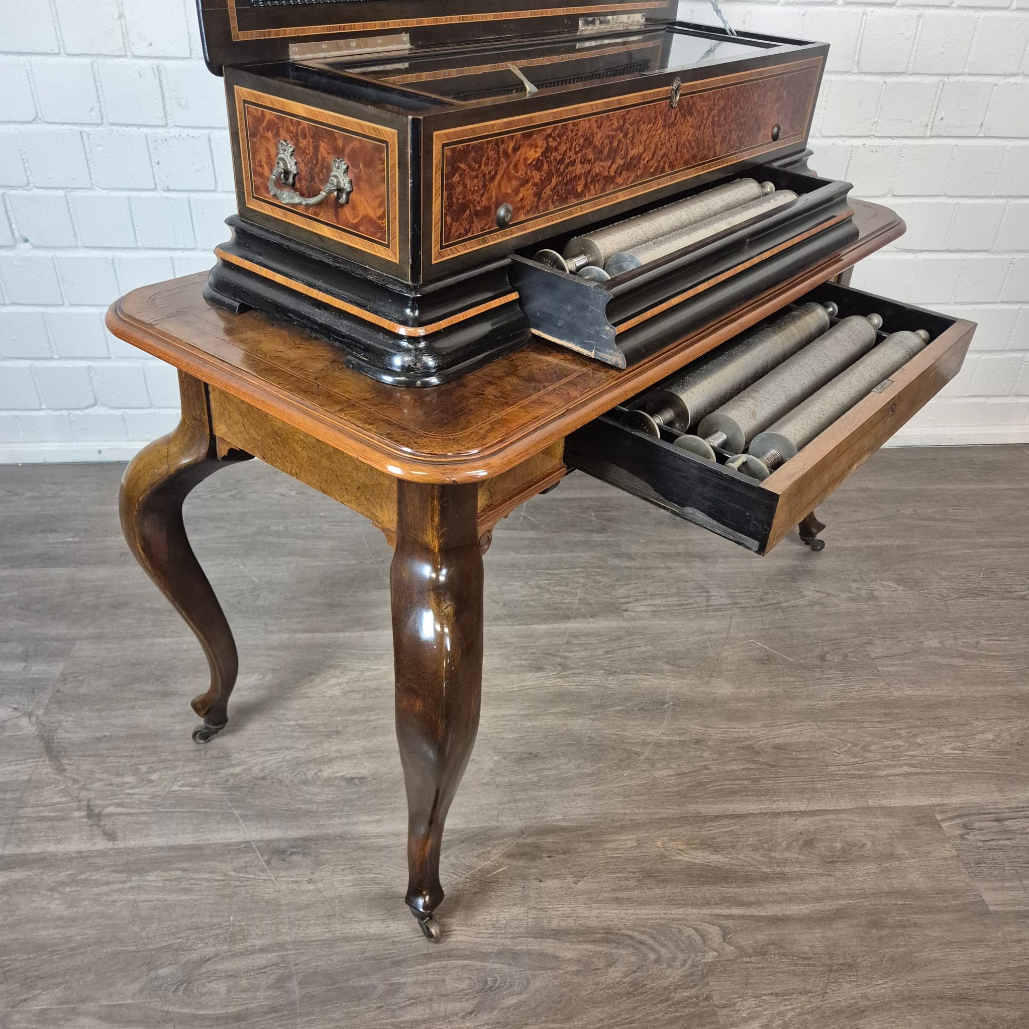 Das Gehäuse sowie der zugehörige Untersatztisch sind meisterhaft mit edlem Wurzelholzfurnier (Nussbaum) gearbeitet und durch filigrane Intarsien sowie ebonisierte Akzente veredelt. Der originale Tisch verfügt über passgenaue Schubladen zur sicheren Aufbewahrung der Wechselwalzen.
