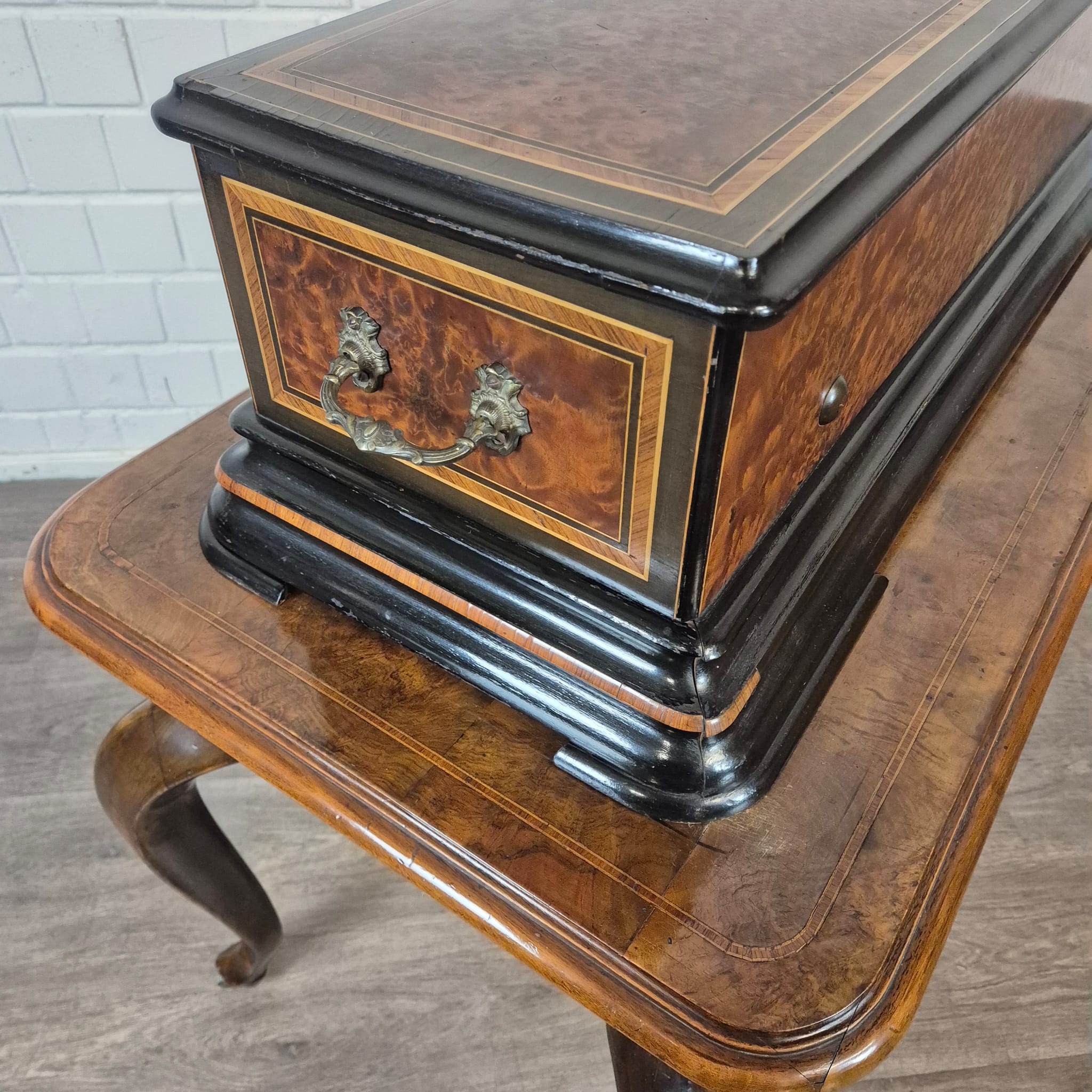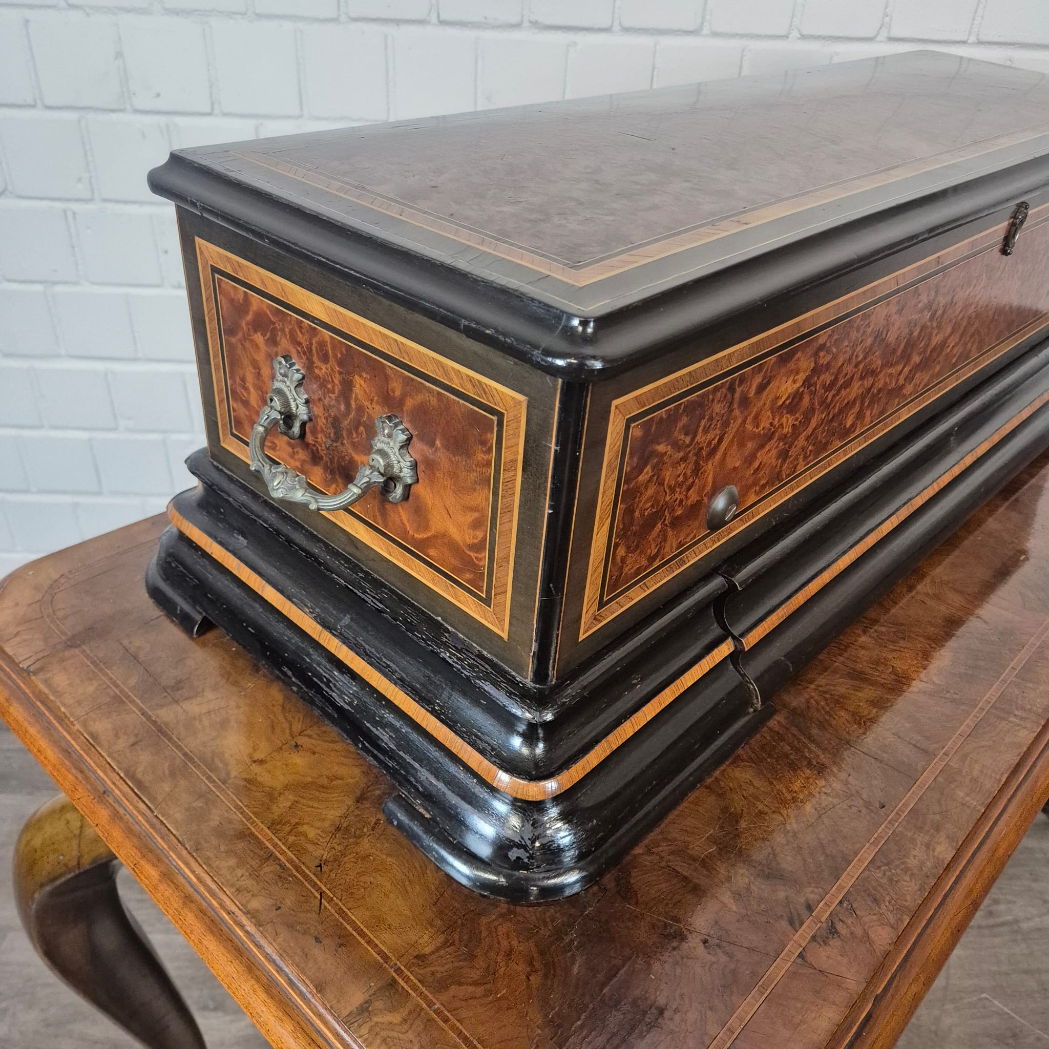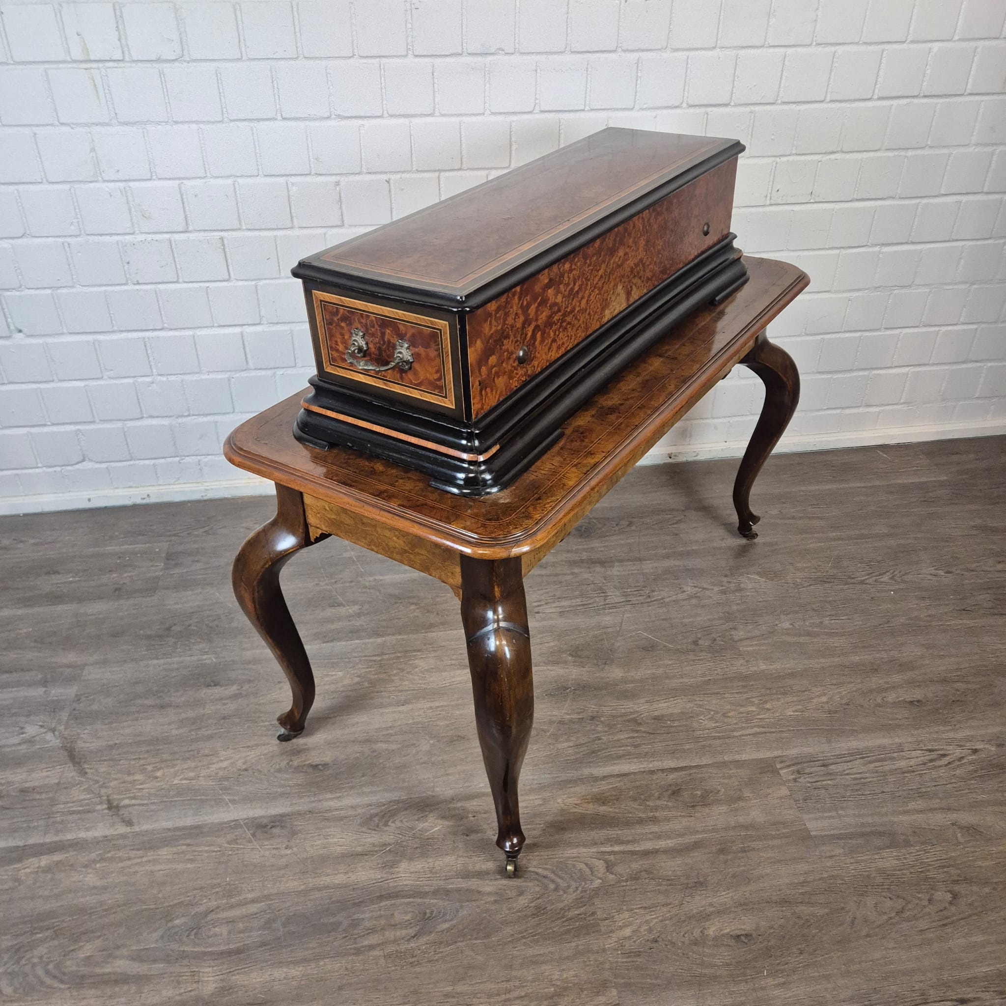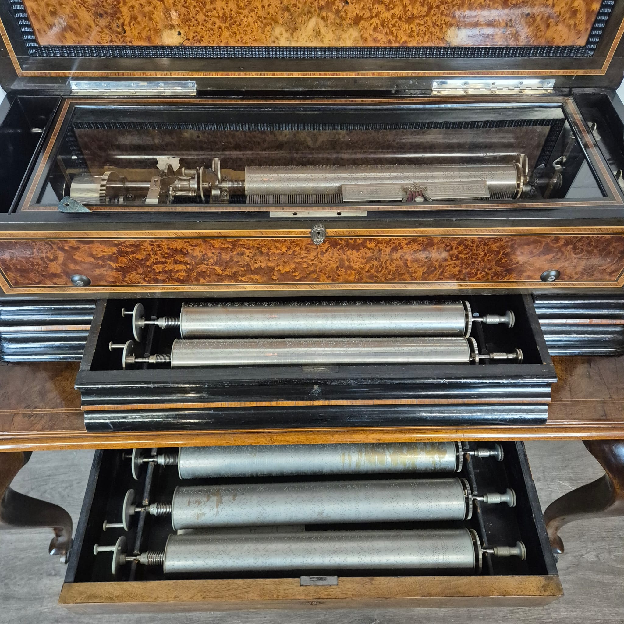 Das Gehäuse sowie der zugehörige Untersatztisch sind meisterhaft mit edlem Wurzelholzfurnier (Nussbaum) gearbeitet und durch filigrane Intarsien sowie ebonisierte Akzente veredelt. Der originale Tisch verfügt über passgenaue Schubladen zur sicheren Aufbewahrung der Wechselwalzen.