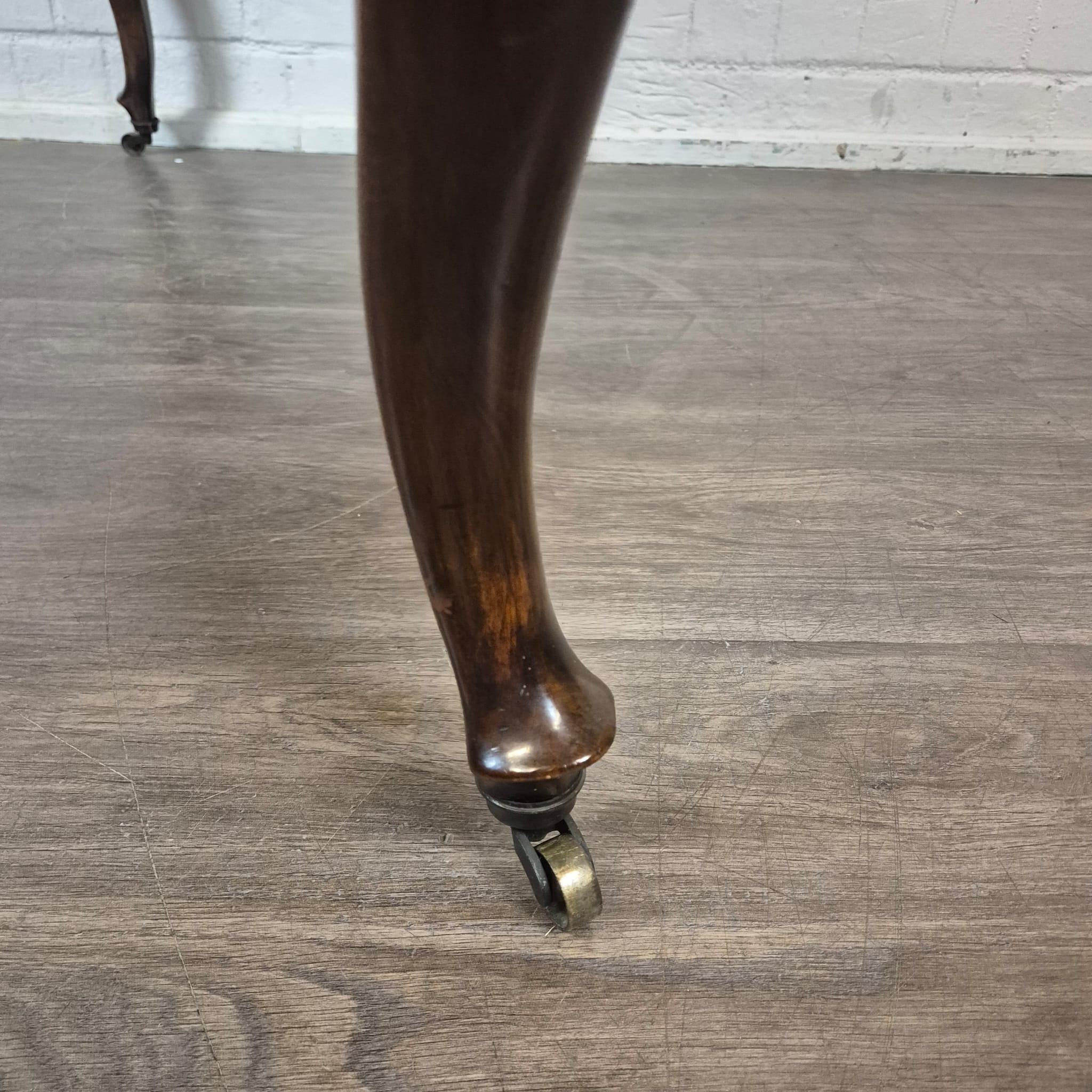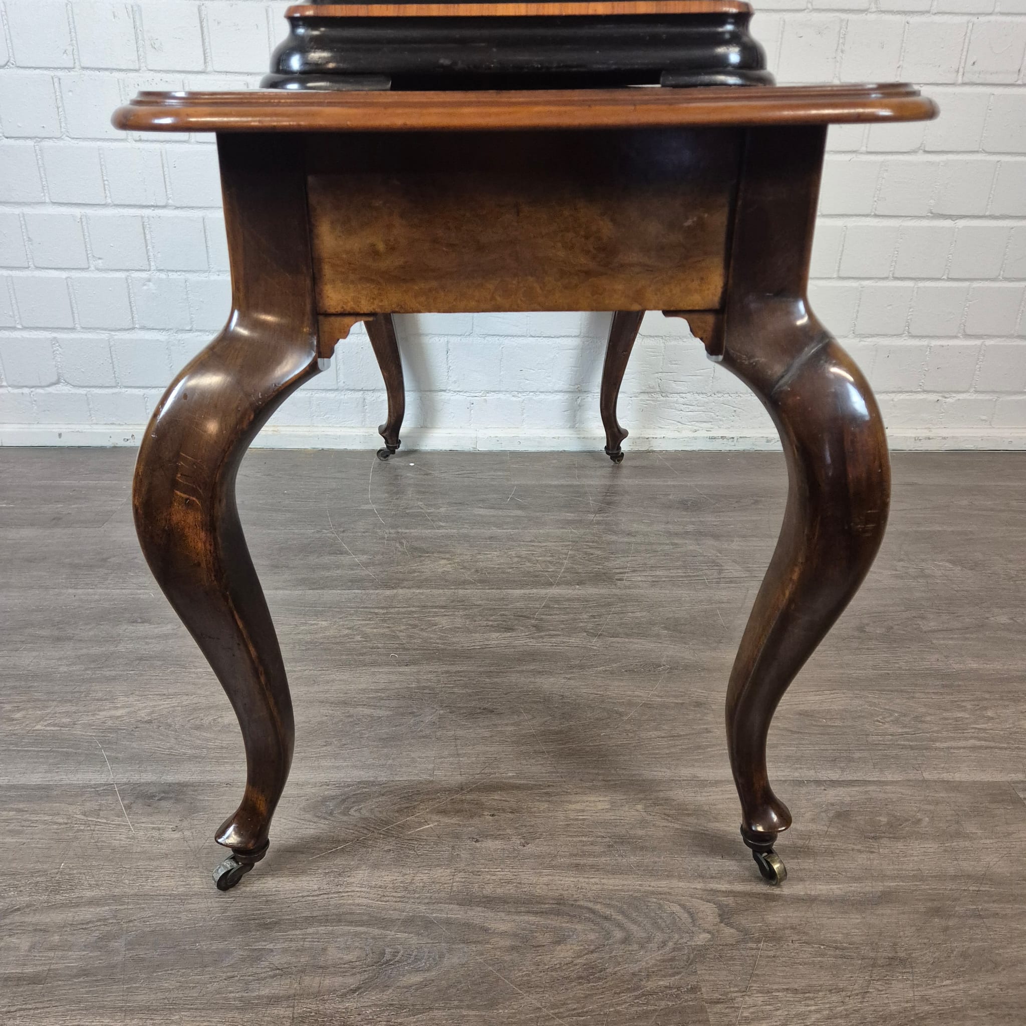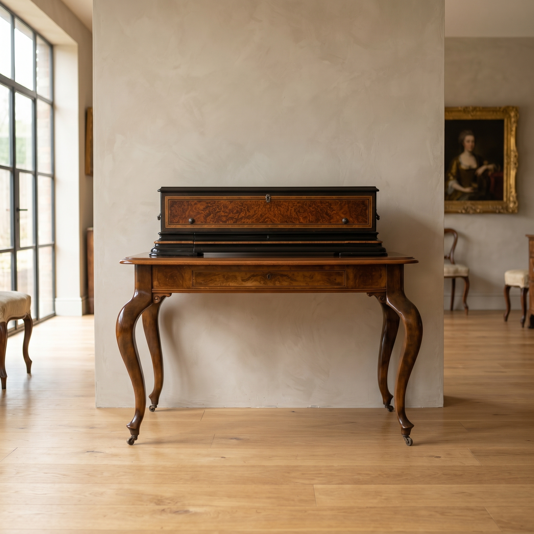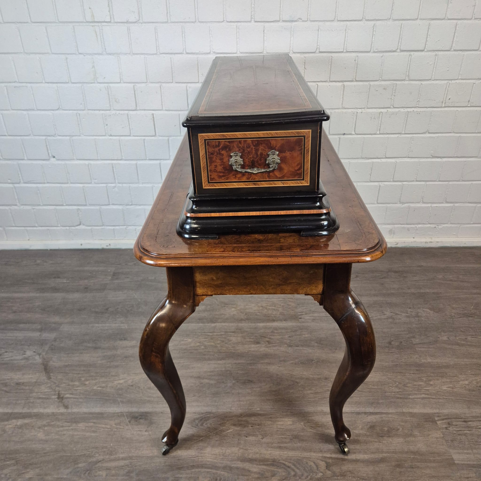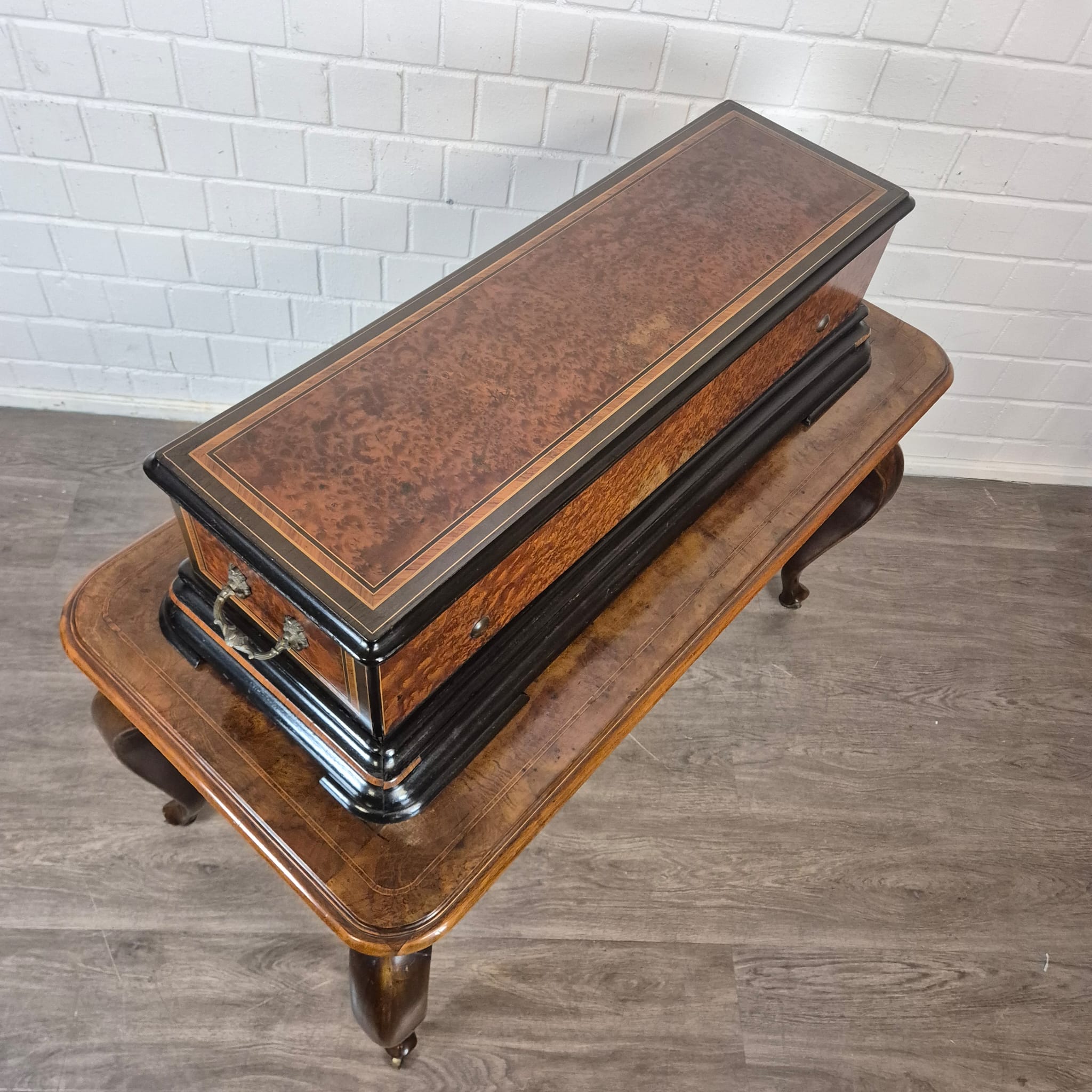 Das Gehäuse sowie der zugehörige Untersatztisch sind meisterhaft mit edlem Wurzelholzfurnier (Nussbaum) gearbeitet und durch filigrane Intarsien sowie ebonisierte Akzente veredelt. Der originale Tisch verfügt über passgenaue Schubladen zur sicheren Aufbewahrung der Wechselwalzen.