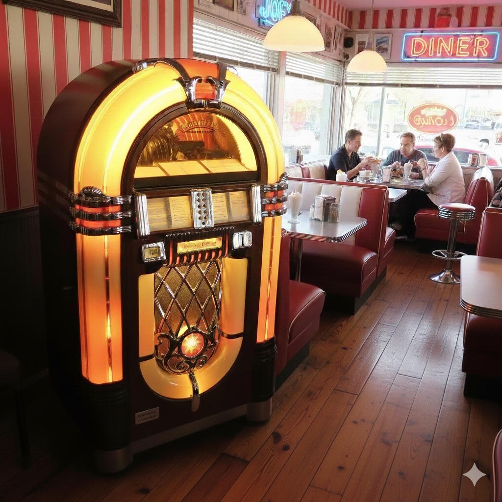 Original Wurlitzer One More Time (OMT) Musikautomat im originalgetreuen Design der legendären Wurlitzer 1015 von 1946.
