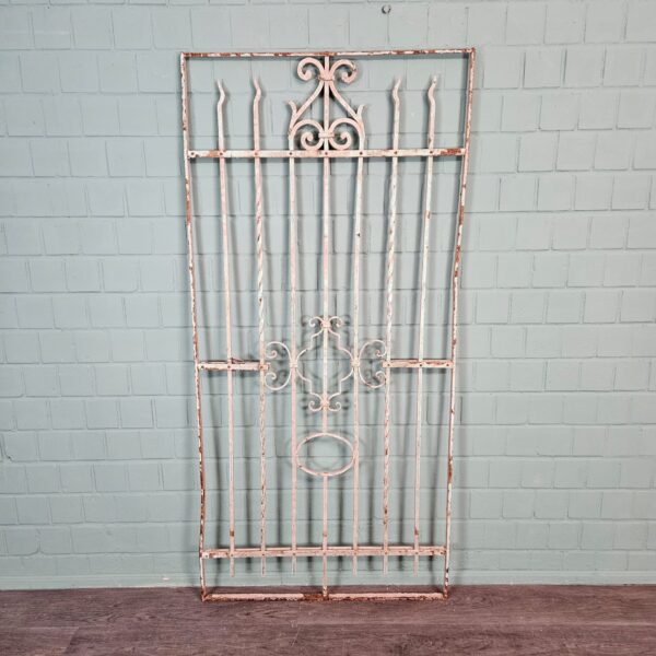 Zustand: Originalzustand mit charmanter Patina und Altersspuren, die die Authentizität und Geschichte des Gitters unterstreichen. Die Oberfläche zeigt die natürliche Verwitterung und gegebenenfalls Reste der Originalfarbe, was seinen einzigartigen Charakter ausmacht.